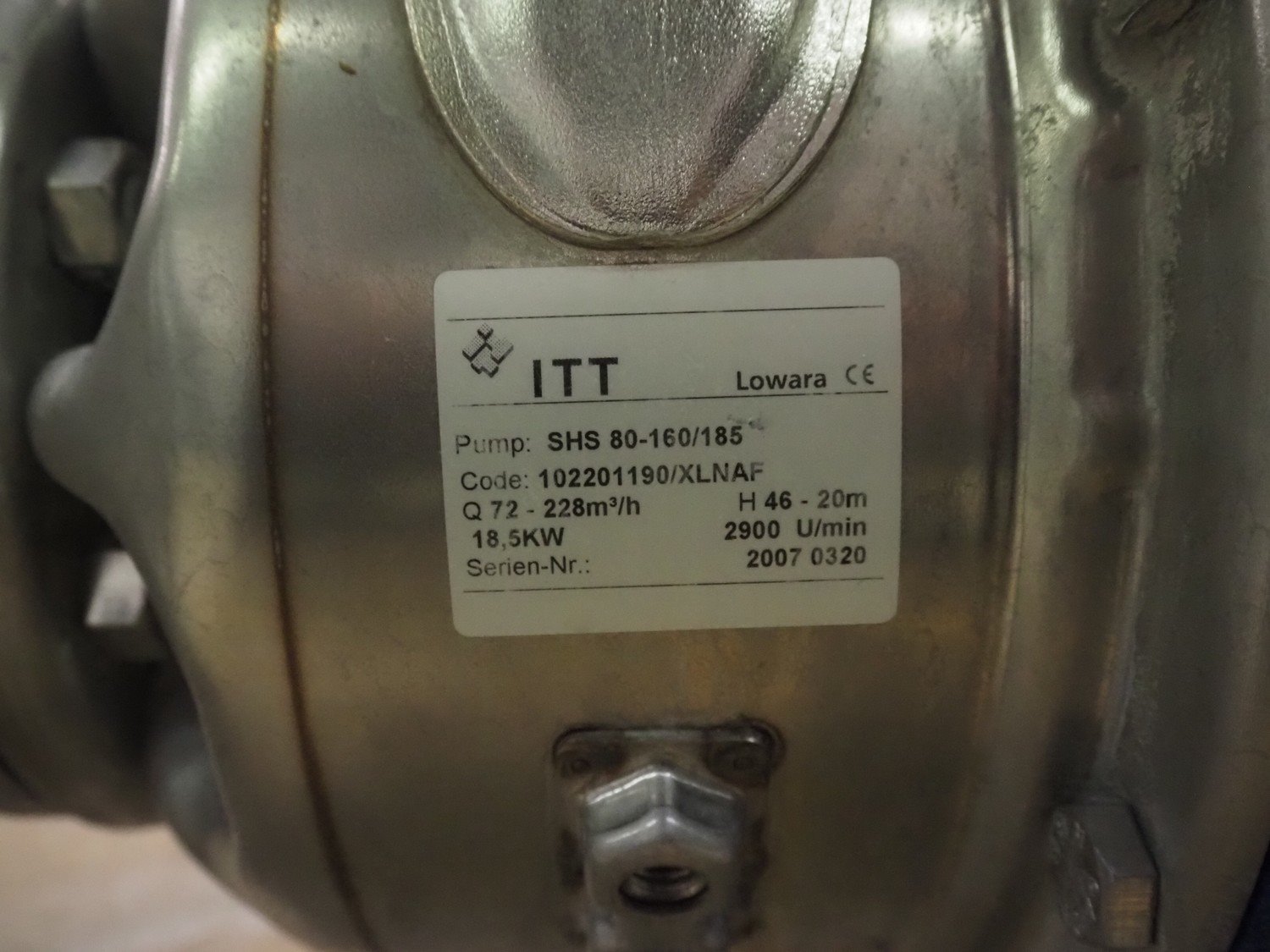 Lowara centrifugal pump, type: SHS 80-160/185, serial number: 2007 0320, capacity: 72-228 m³ per hour, dimensions: 850 mm x 350 mm x 500 mm. Kavel locatie: Schultetusstraße 37, 17153 Stavenhagen, Duitsland