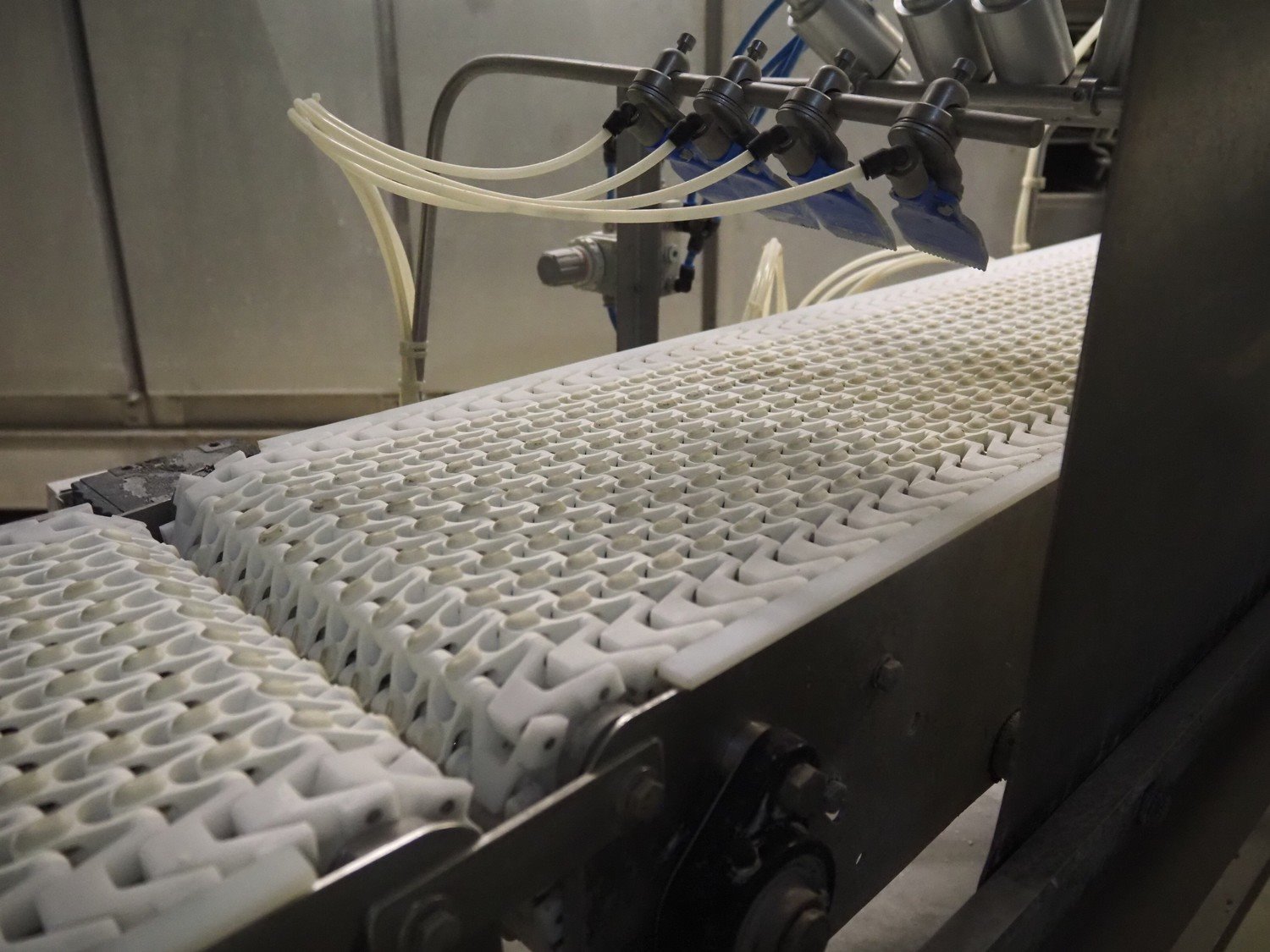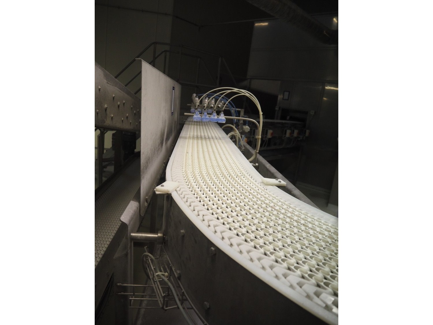 Transport belt, plastic mesh belt, belt width: 300 mm, total dimensions: 2800 mm x 750 mm x 1700 mm. Kavel locatie: Schultetusstraße 37, 17153 Stavenhagen, Duitsland