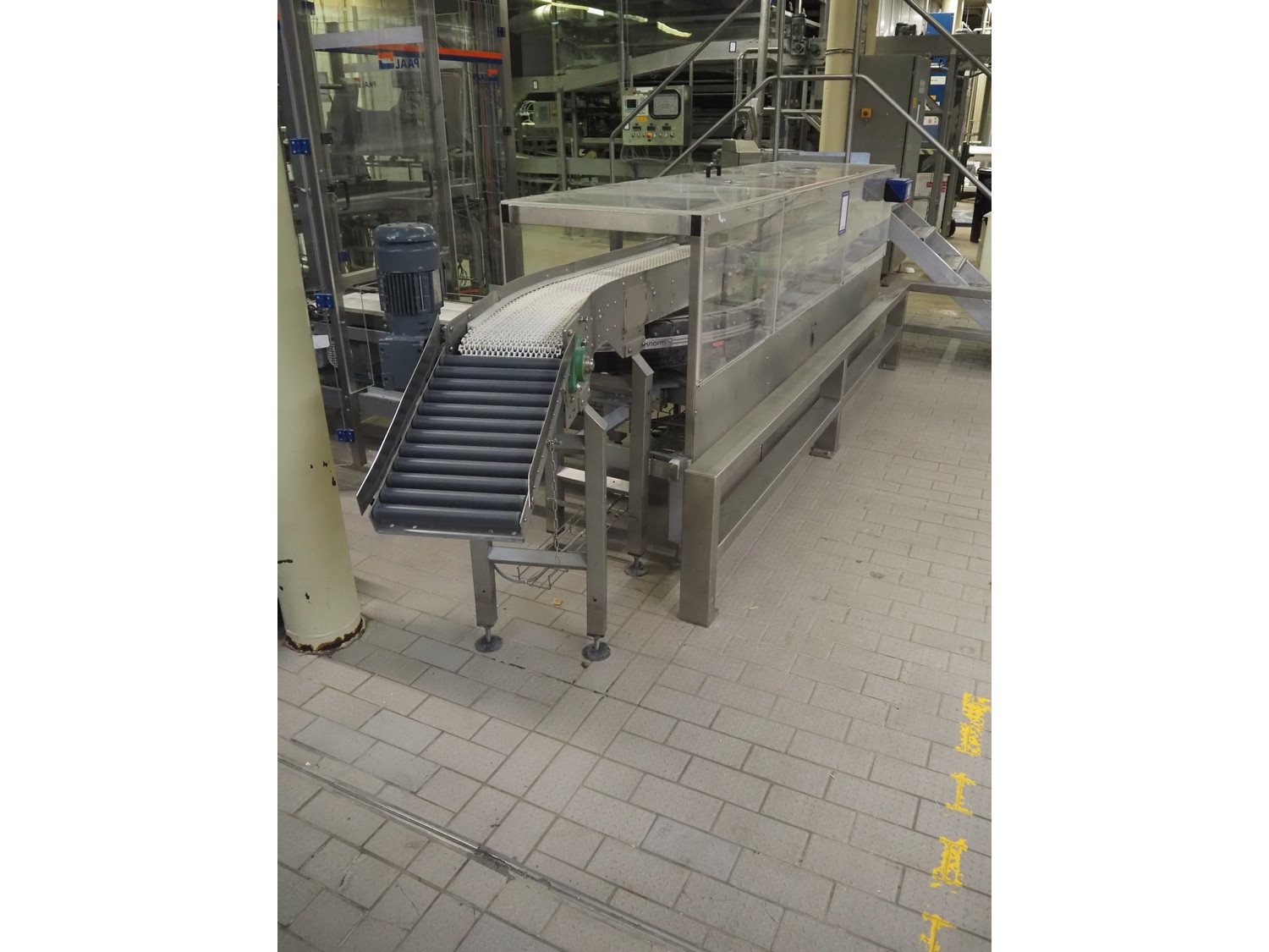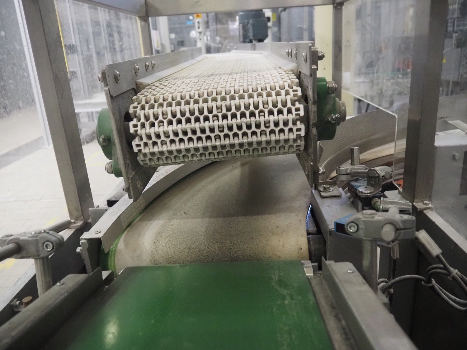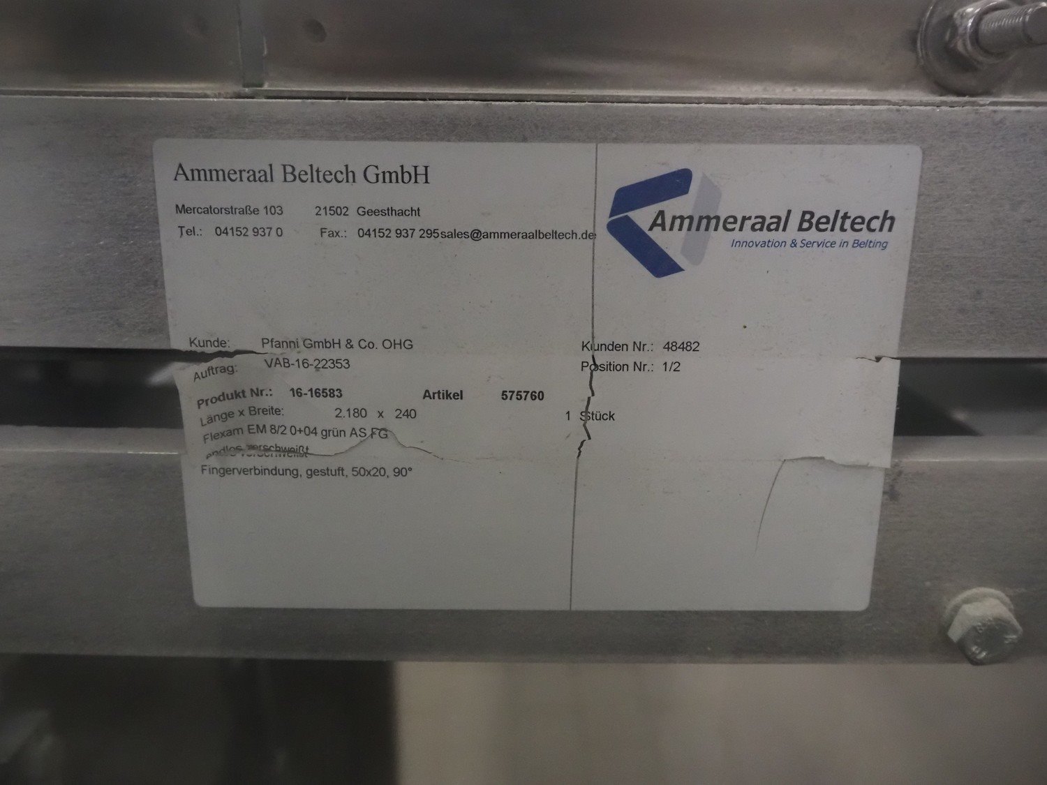 Ammeraal Beltech GmbH line dividing belt, plastic belt, belt width: 270 mm and 250 mm, plastic mesh belt, belt width: 260 mm, cloth belt, belt width: 300 mm, total dimensions: 3700 mm x 2300 mm x 1200 mm. Kavel locatie: Schultetusstraße 37, 17153 Stavenhagen, Duitsland