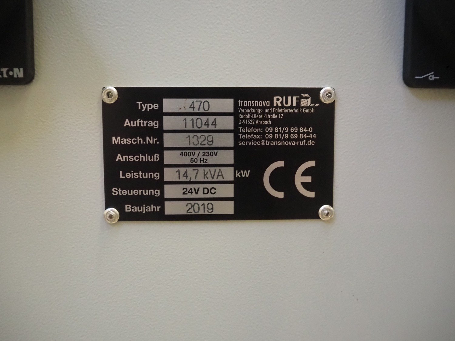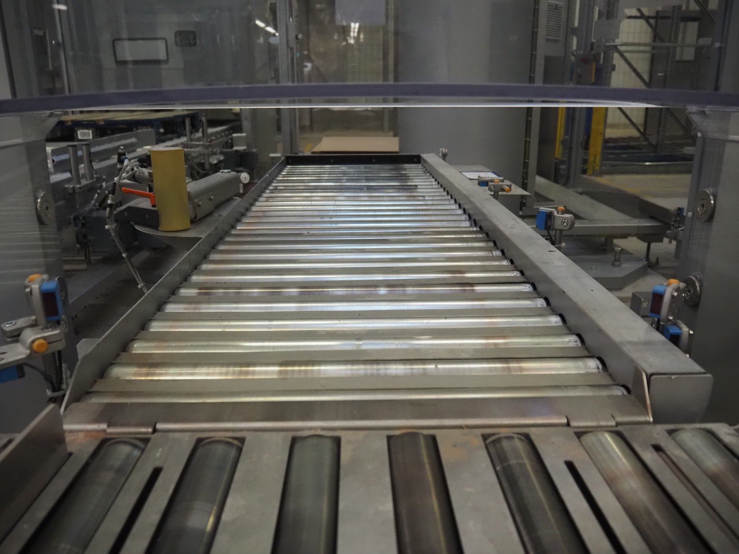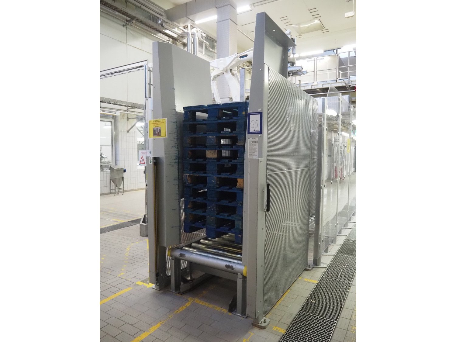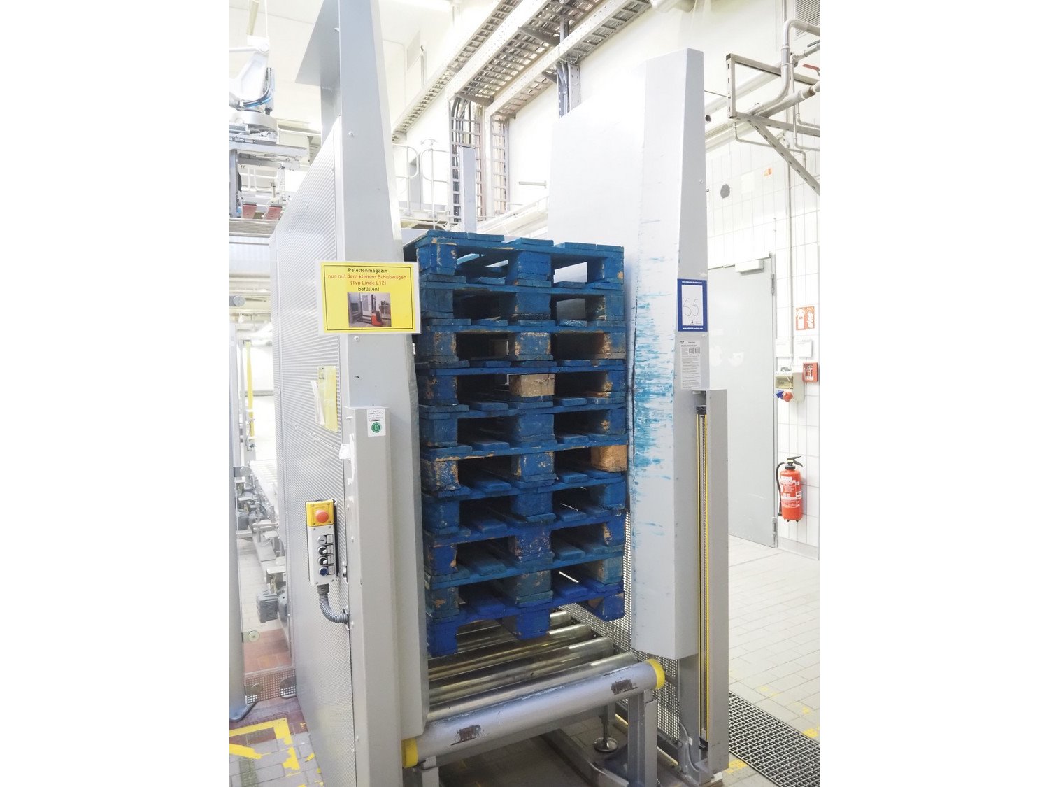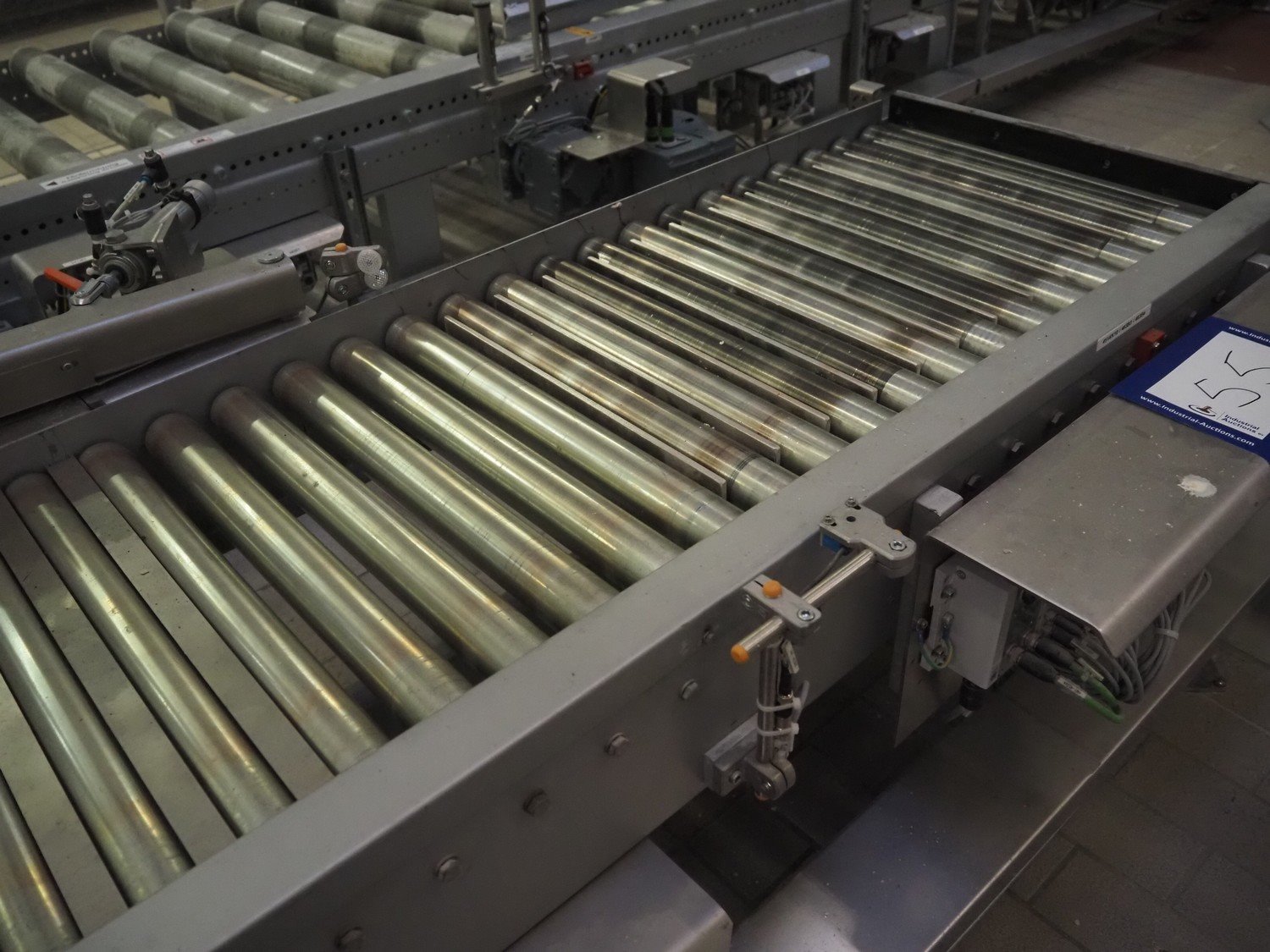 Transnova RUF / WTT Fördertechnik conveyor system with pallet de-stacker, type: 470, machine number: 1329, year of construction: 2019, 400/230 V, 50 Hz, 14.7 KVA, s/s rollers, roller width: 910 / 500 / 400 mm, dimensions de-stacker: 1800 mm x 1350 mm x 2870 mm, conveyor length: 6000 mm, 2000 mm and 3000 mm, steel switch cabinet, dimensions: 800 mm x 500 mm x 1180 mm. Kavel locatie: Schultetusstraße 37, 17153 Stavenhagen, Duitsland