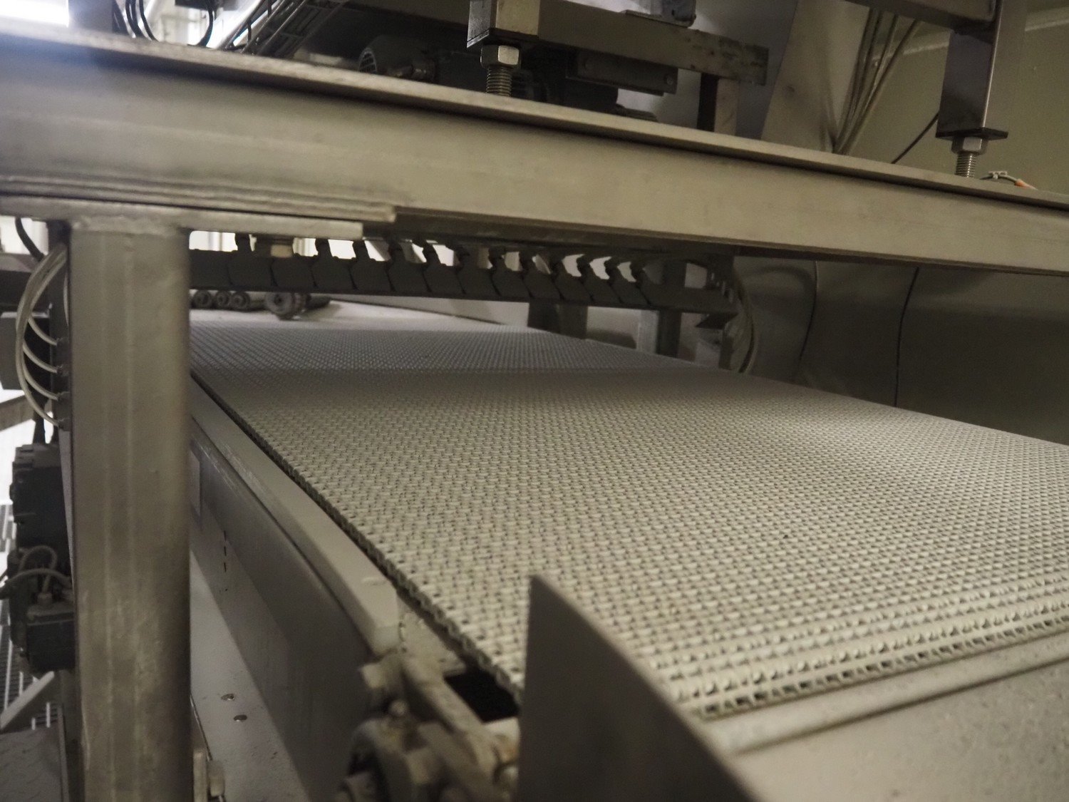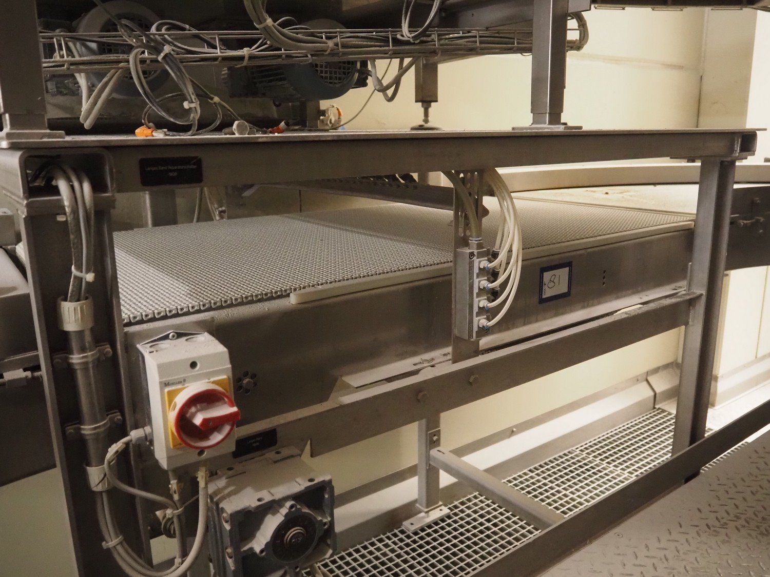 Transport belt, plastic mesh belt, belt width: 750 mm, total dimensions: 1400 mm x 800 mm x 1350 mm. Kavel locatie: Schultetusstraße 37, 17153 Stavenhagen, Duitsland