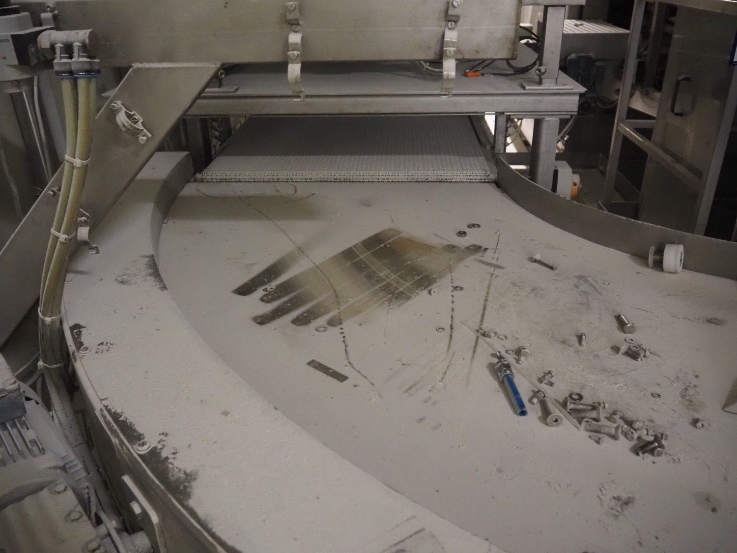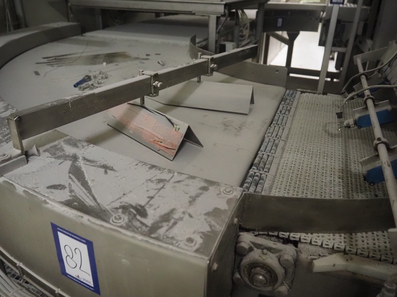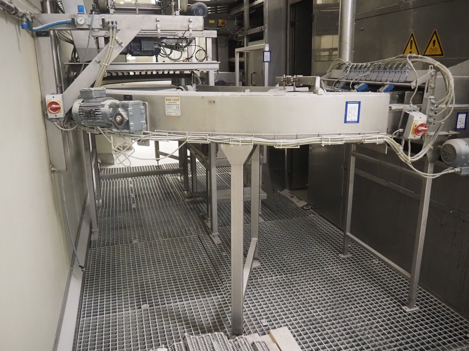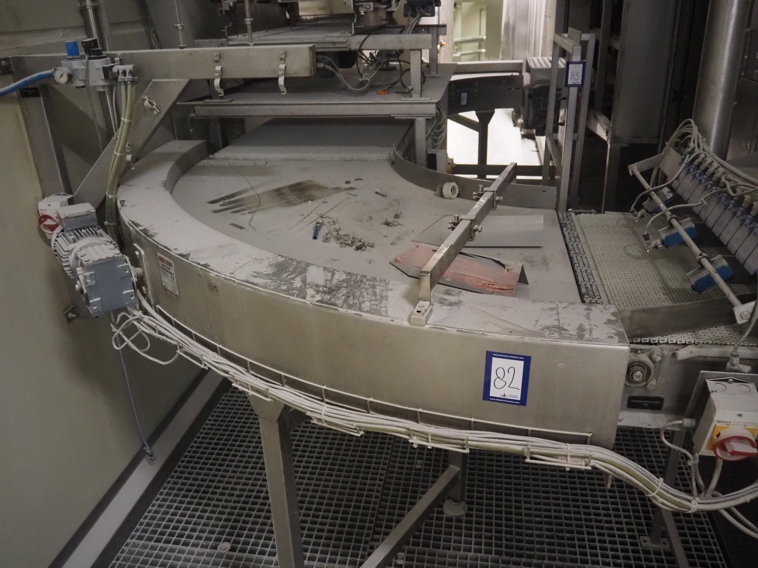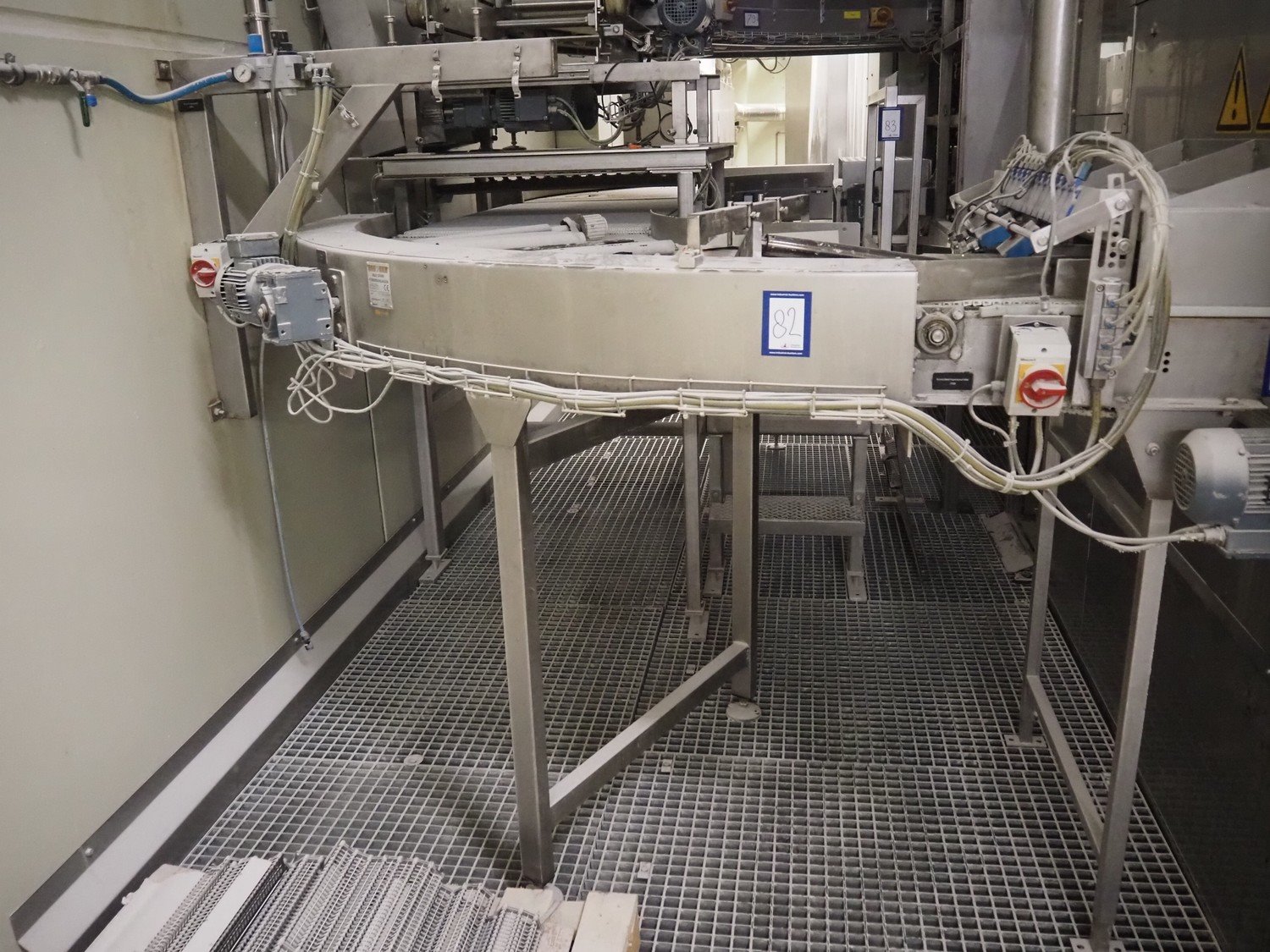 Max Dörr 90° curve conveyor, plastic belt, belt width: 800 mm, total dimensions: 1600 mm x 1500 mm x 1400 mm. Kavel locatie: Schultetusstraße 37, 17153 Stavenhagen, Duitsland