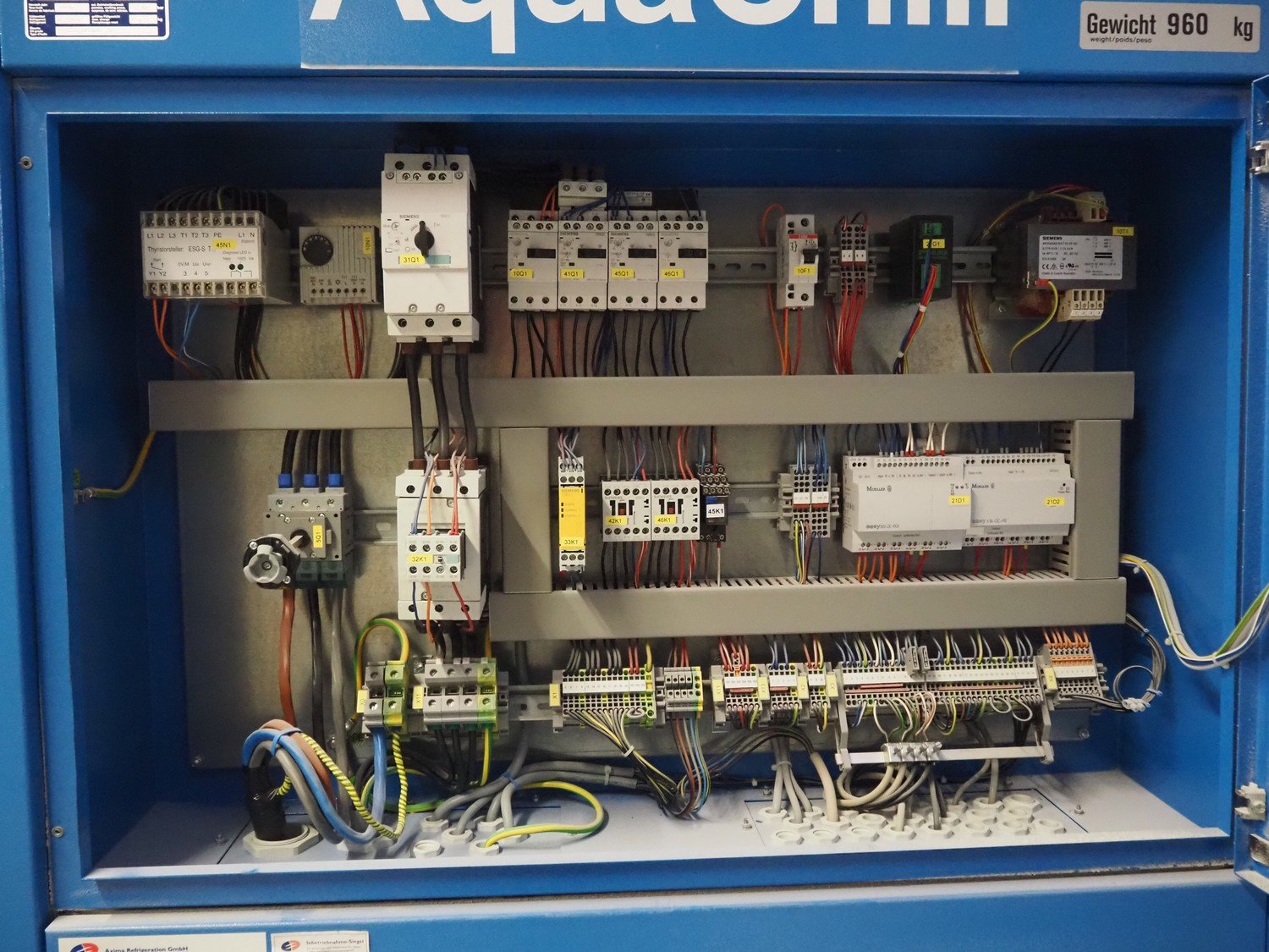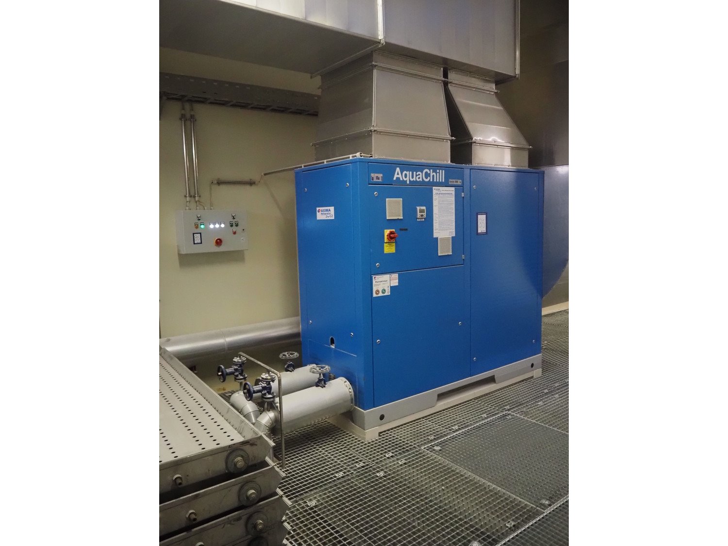 Axima Refrigeration GmbH water chiller, type: AquaChill, fabrication number: 66.0028559-1, year of construction: 2006, 400 V, 3 Ph, 50 Hz, 75 A. dimensions: 2200 mm x 900 mm x 2050 mm. Kavel locatie: Schultetusstraße 37, 17153 Stavenhagen, Duitsland
