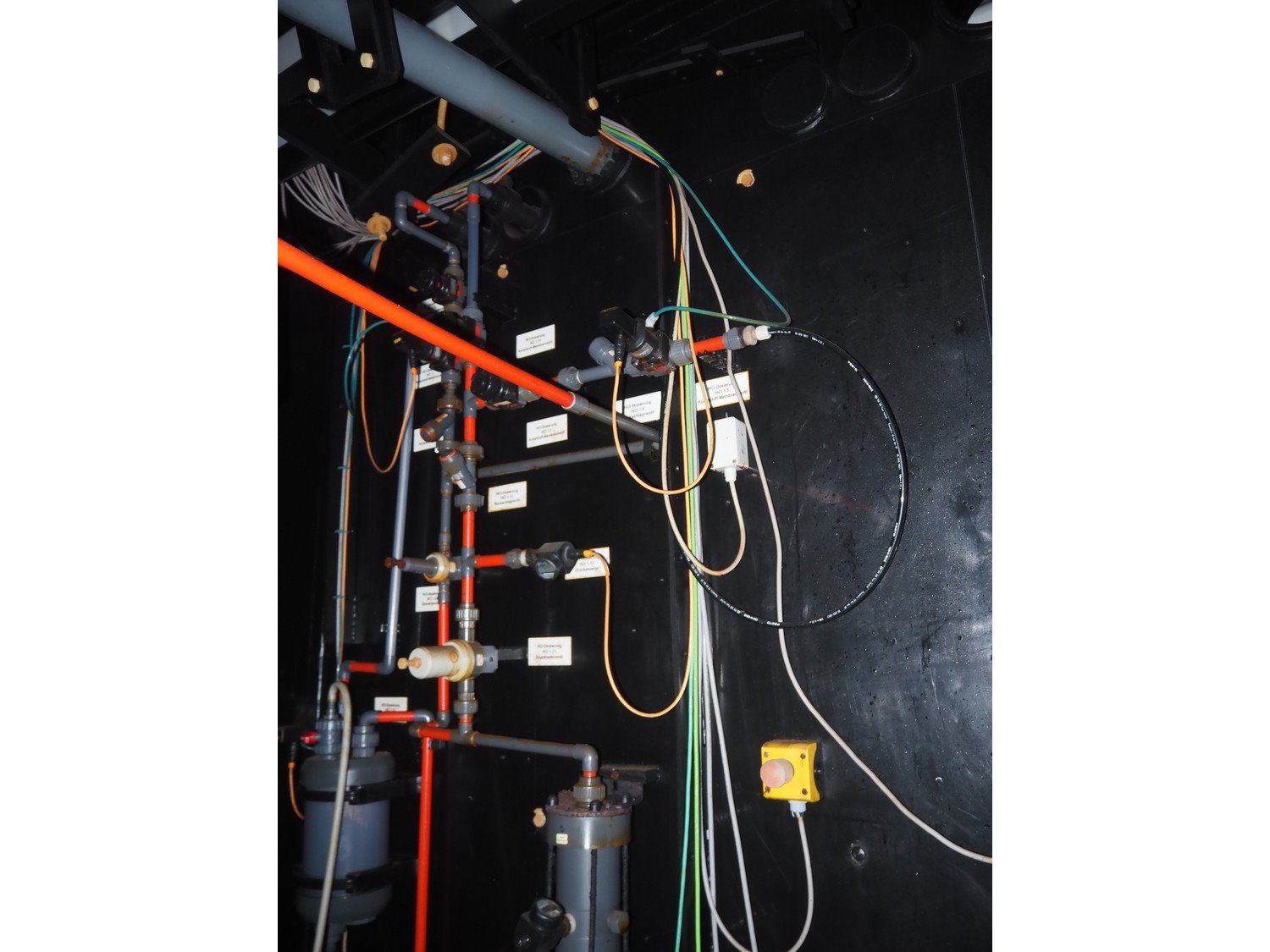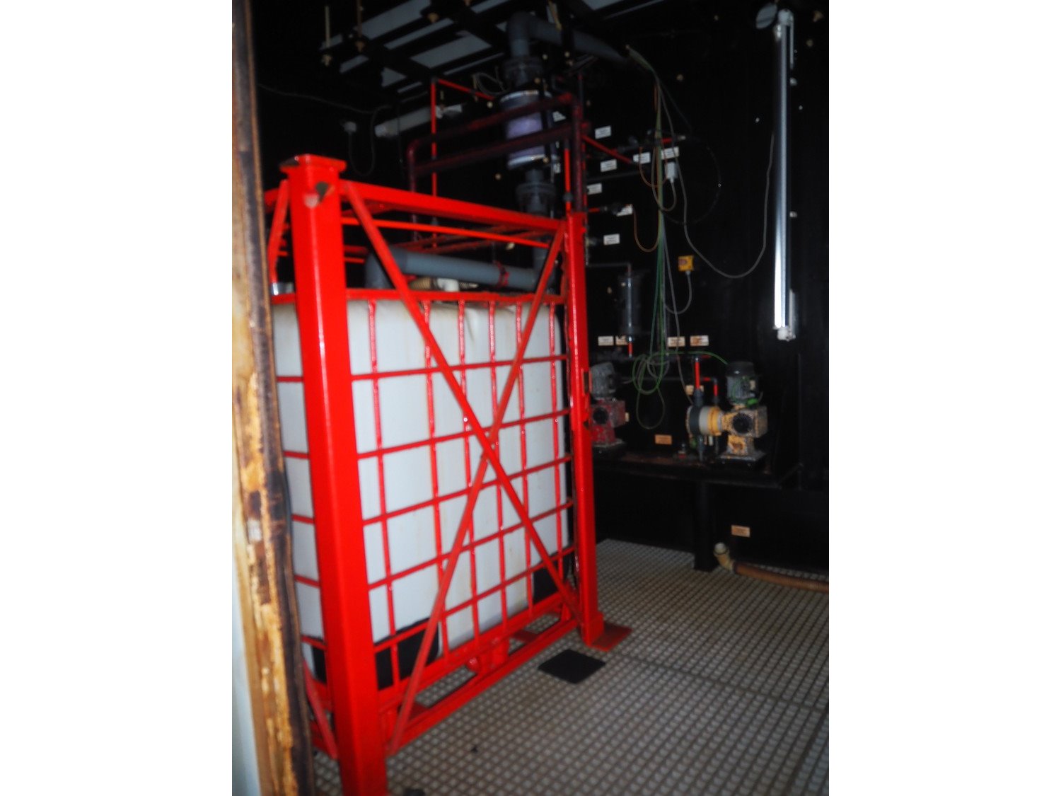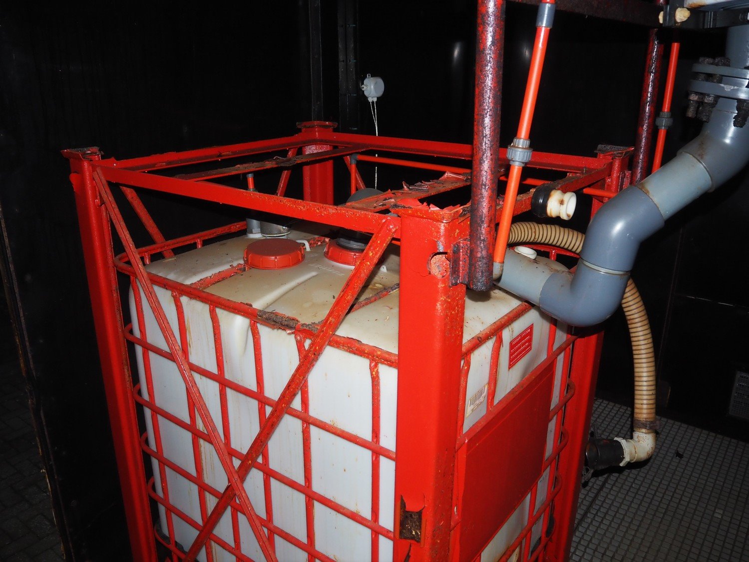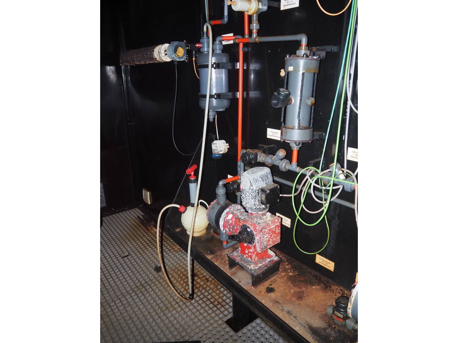 Chemical dosing system consisting of IBC tank with steel frame, dimensions: 1100 mm x 1300 mm x 1750 mm, 2 dosing pumps, s/s switch cabinet, dimensions: 800 mm x 300 mm x 1000 mm. Kavel locatie: Schultetusstraße 37, 17153 Stavenhagen, Duitsland