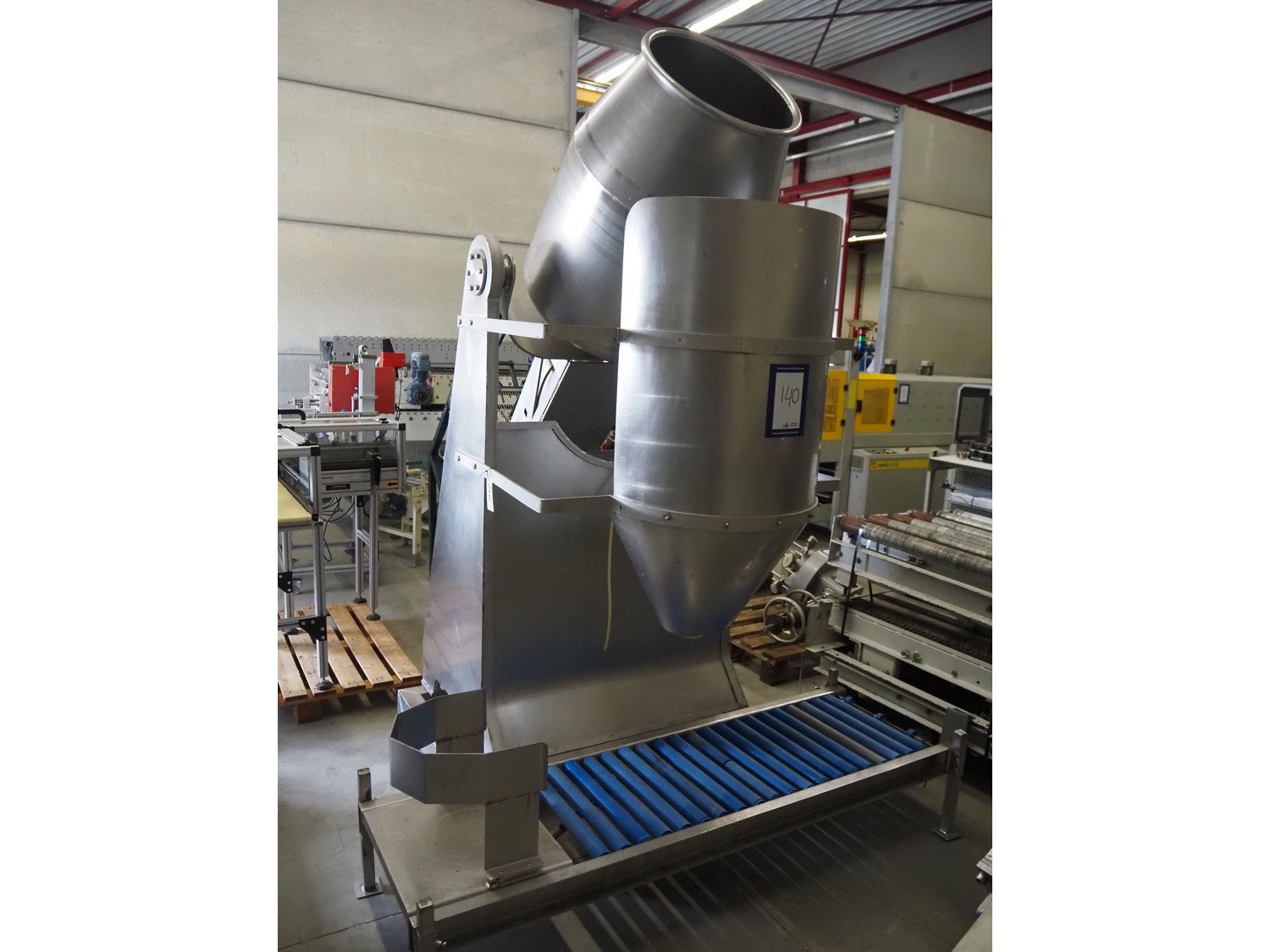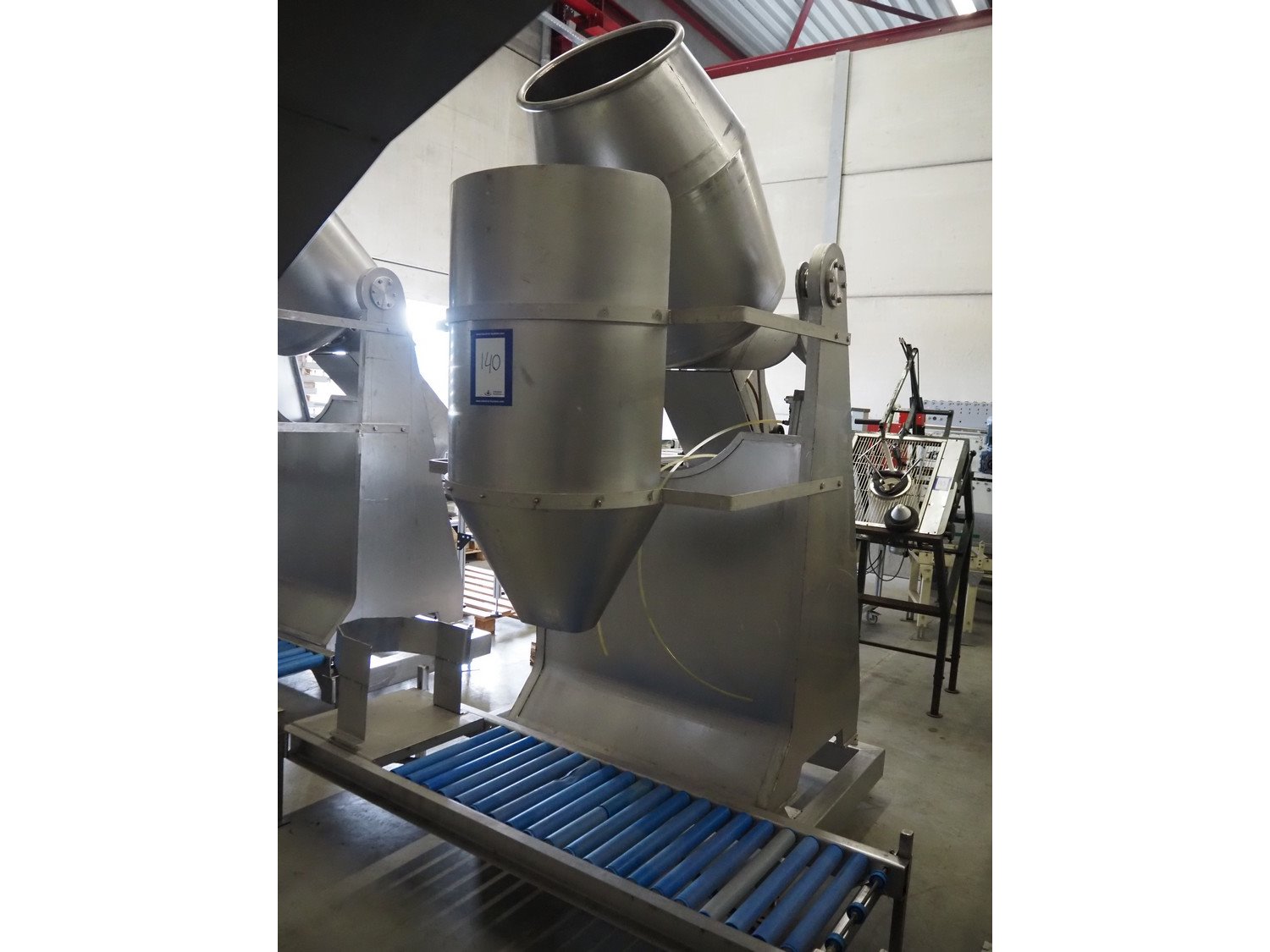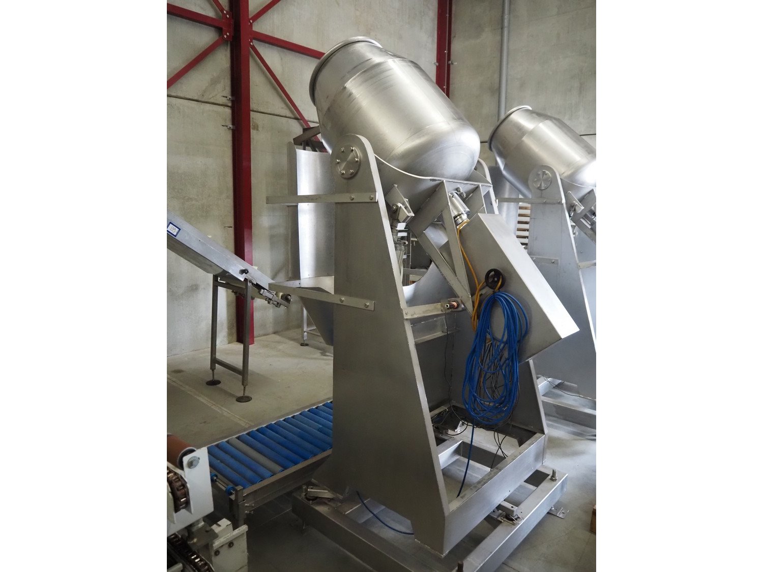 S/s tumbler on weighing cells with outfeed roller conveyor, dimensions mixer: 800 mm x 1250 mm x 2650 mm, roller conveyor, steel frame, plastic rollers, roller width: 500 mm, dimensions roller conveyor: 2070 mm x 720 mm x 400 mm. Without indicator. Kavel locatie: Spoorstraat 7, 5975 RK Sevenum, Nederland
