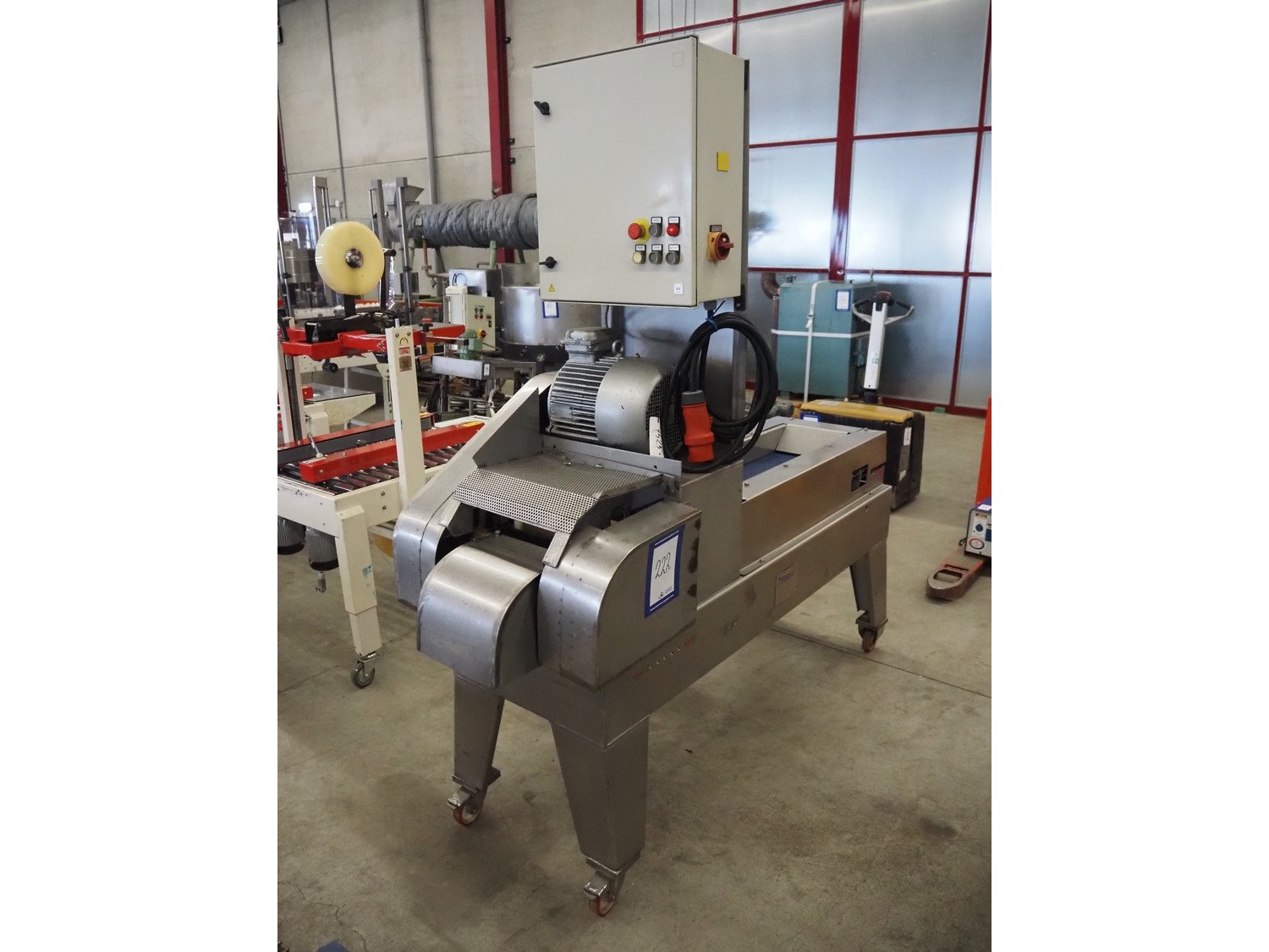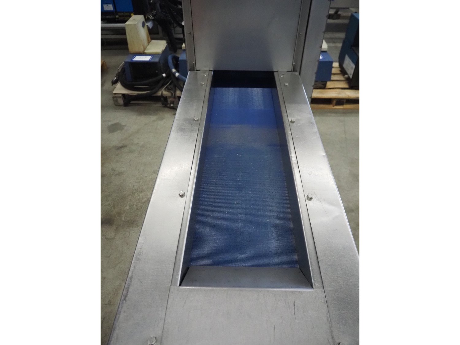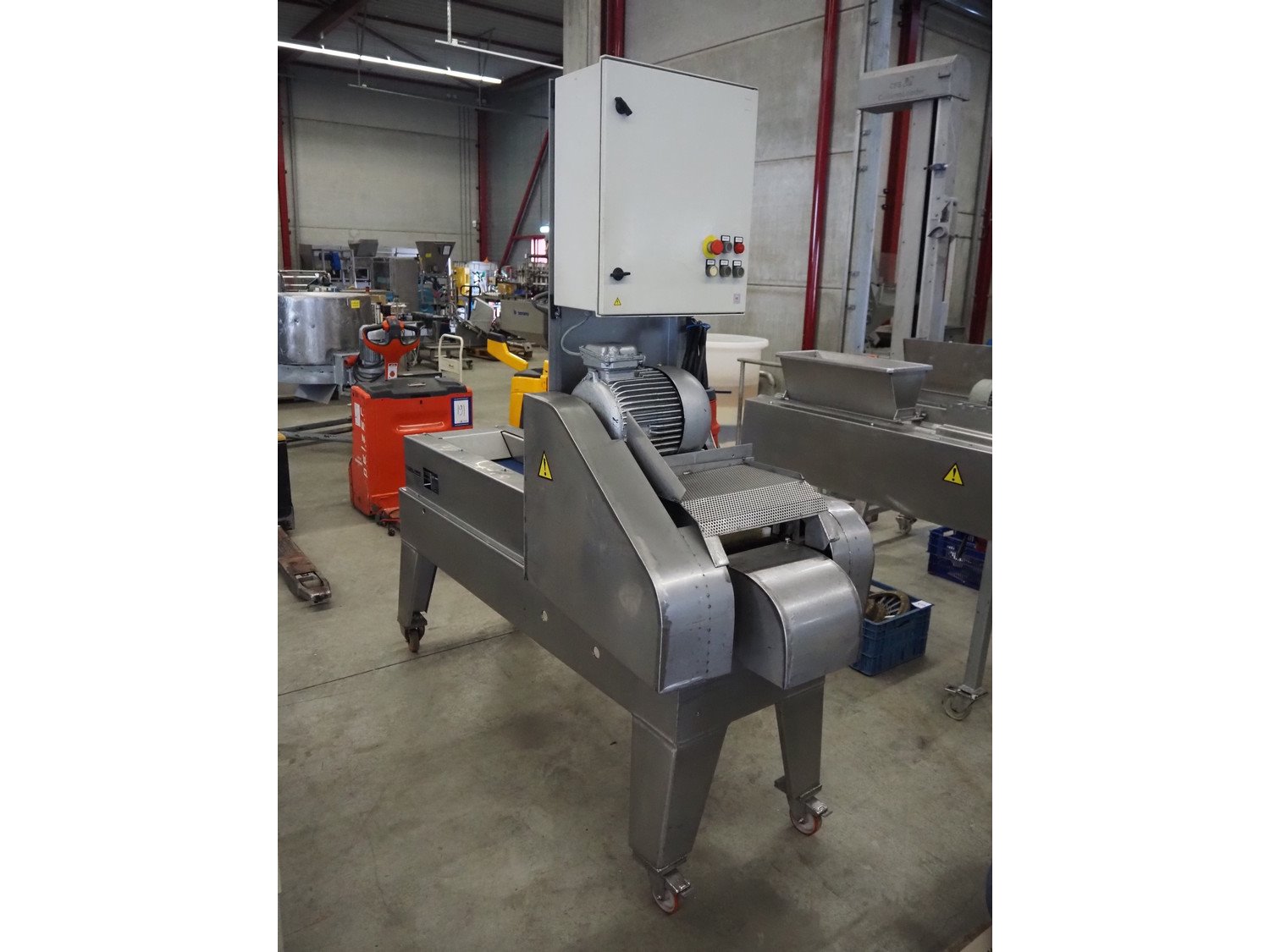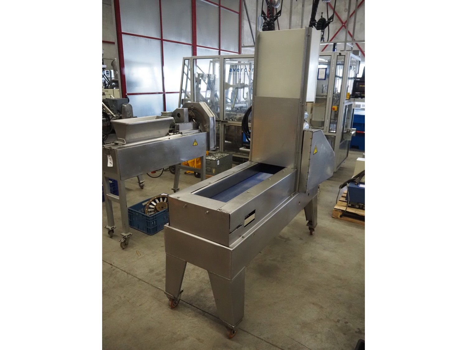 Herbert mobile strip cutter for leafy vegetables, machine type: 130, machine number: 77, year of construction: 1992, working width: 250 mm, distance between knives: 5 mm, plastic belt, belt width: 260 mm, total dimensions: 2100 mm x 700 mm x 2100 mm. Crate with extra transport belts. Kavel locatie: Spoorstraat 7, 5975 RK Sevenum, Nederland