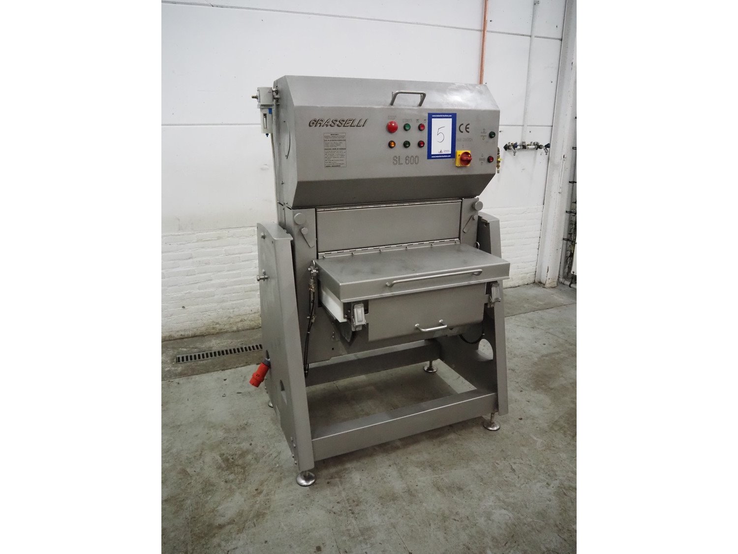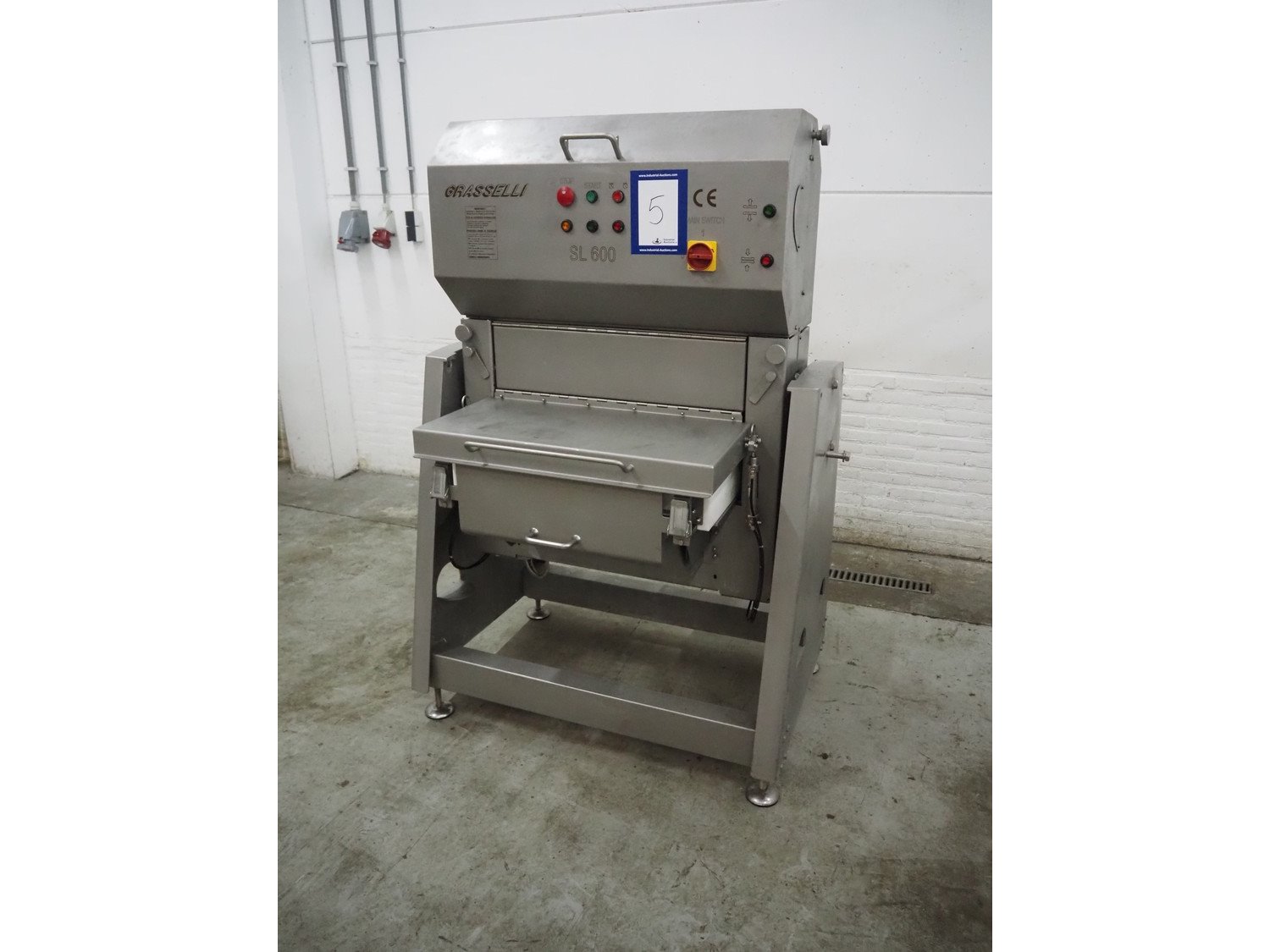Grasselli spa automatic slicer, model: SL 600, serial number: S31Q00/334, year of construction: 2002, 380 V, 3 Ph, 50 Hz, 9.4 A, 5 hp, 7 bar, distance between knives: 7 mm, total dimensions: 1250 mm x 1200 mm x 1770 mm. Kavel locatie: Denariusstraat 20, 4903 RC Oosterhout, Nederland