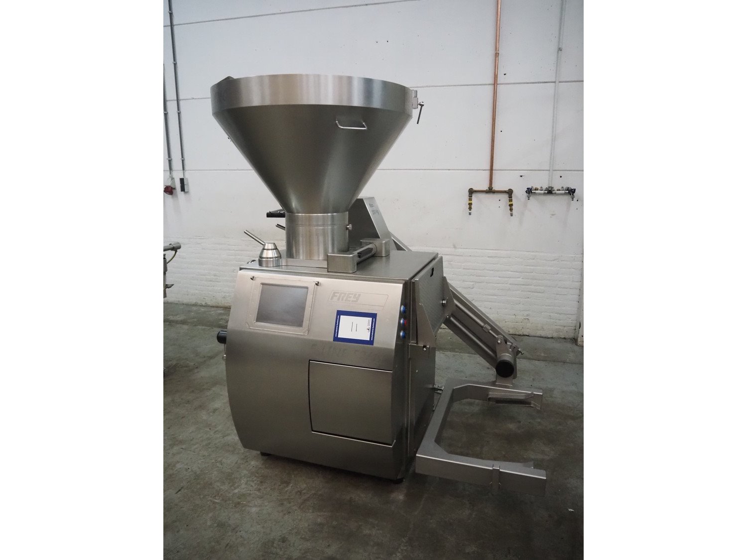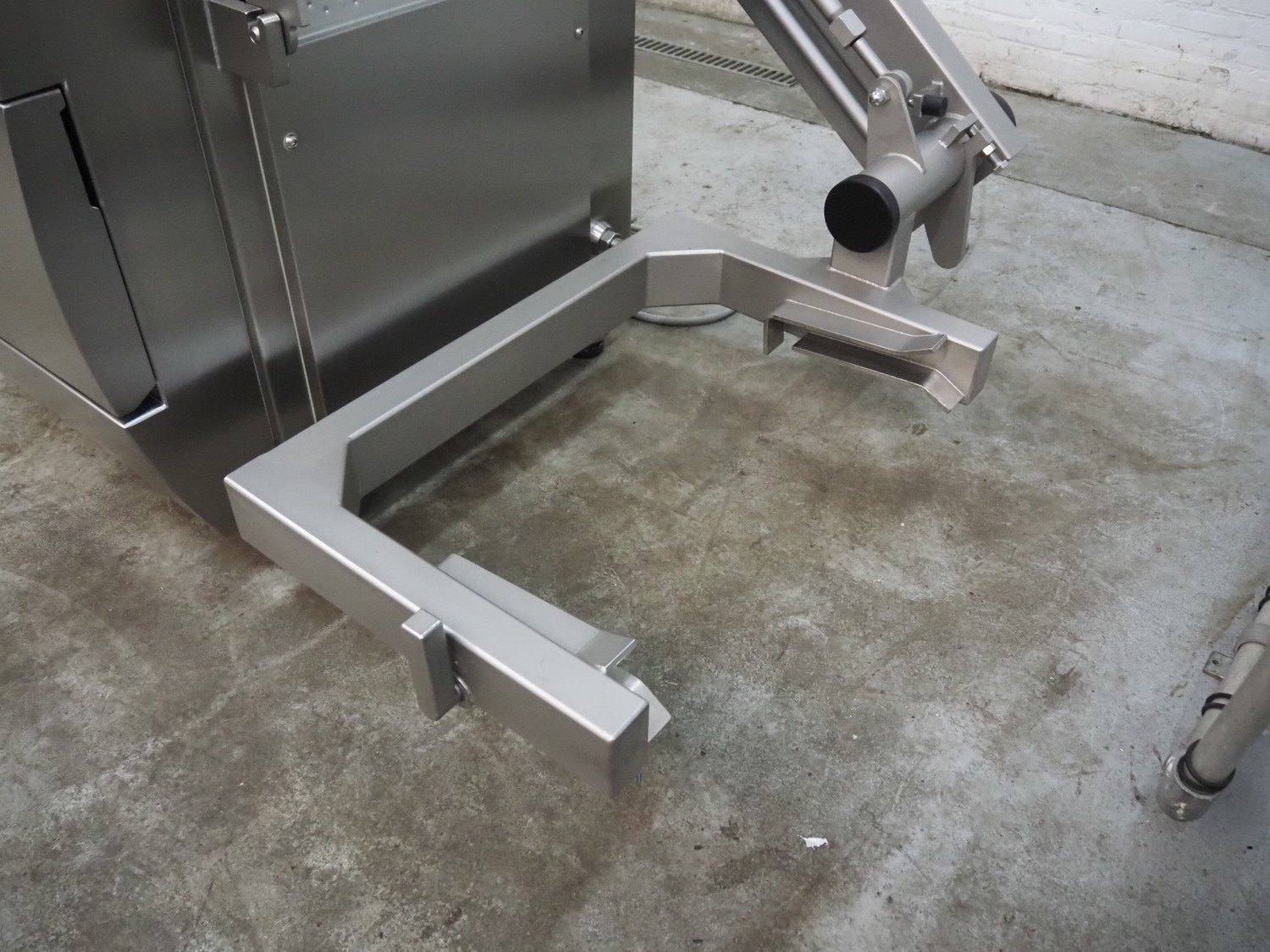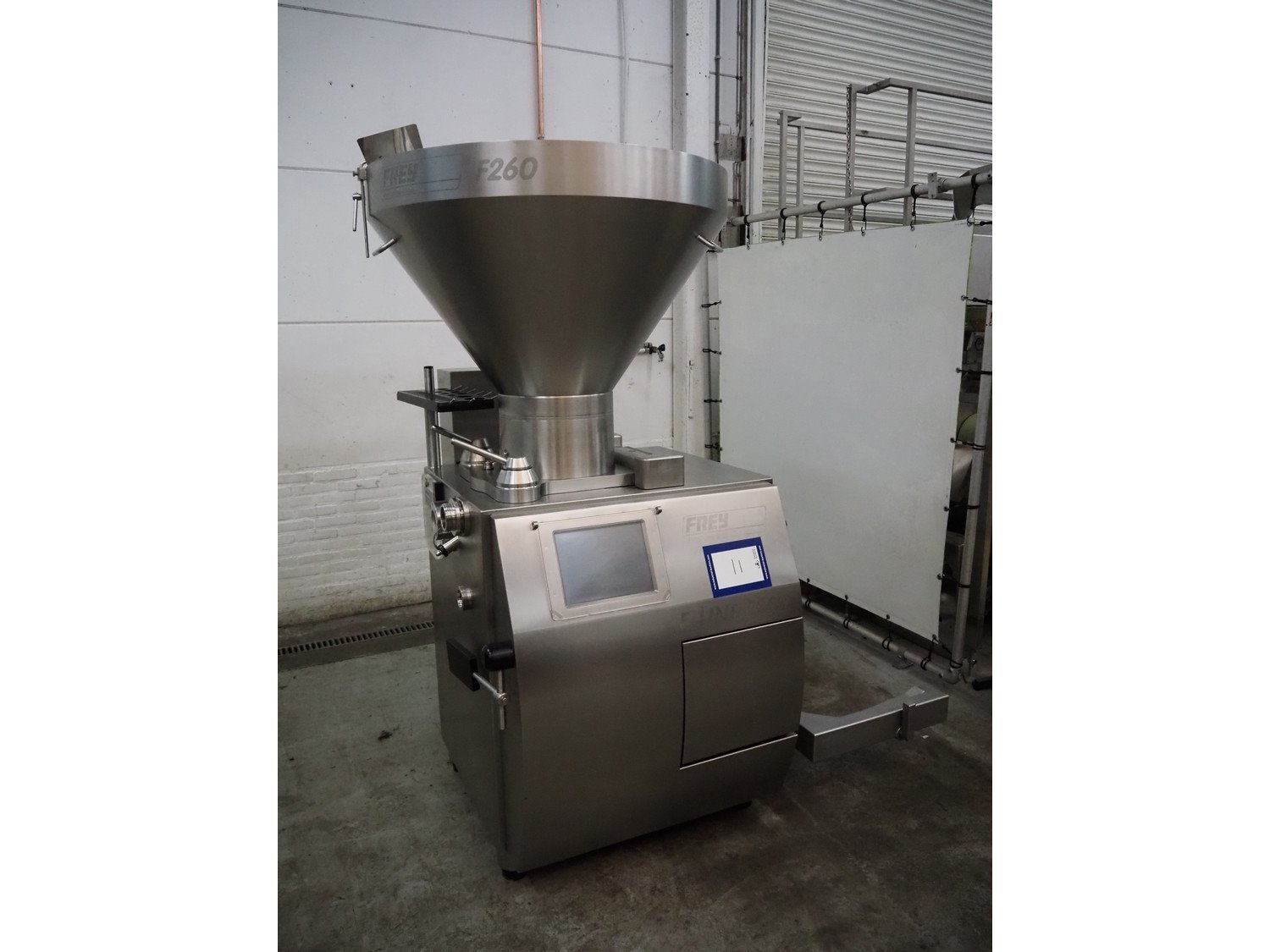 Frey Maschinenbau GmbH vacuum filling machine with lifter for 200 liter meat bins, type: F-line F260, serial number: F260PT1092964, year of construction: 2014, 400 V, 50/60 Hz, 10.45 kW, dimensions: 1700 mm x 1300 mm x 2100 mm. Kavel locatie: Denariusstraat 20, 4903 RC Oosterhout, Nederland