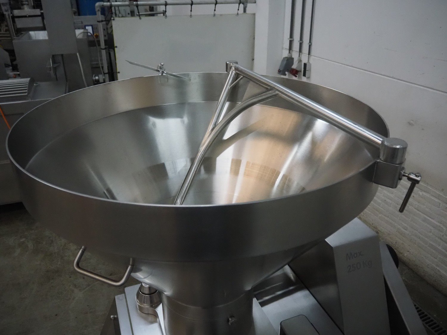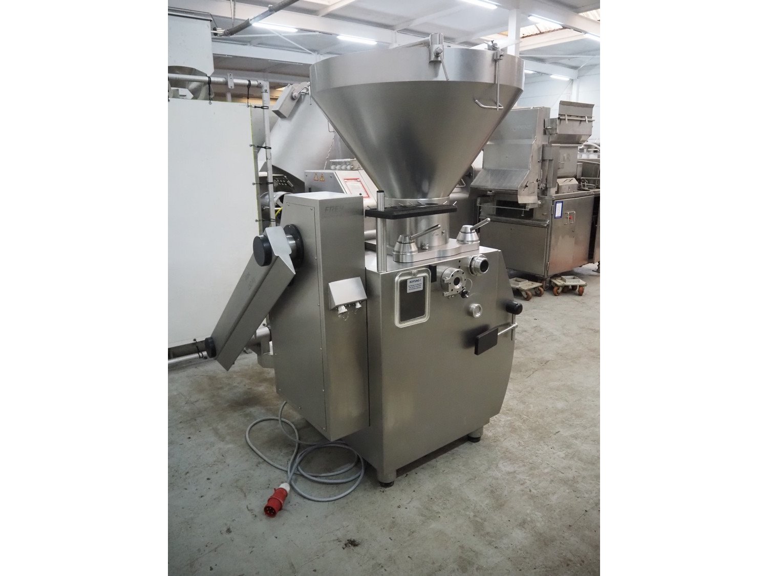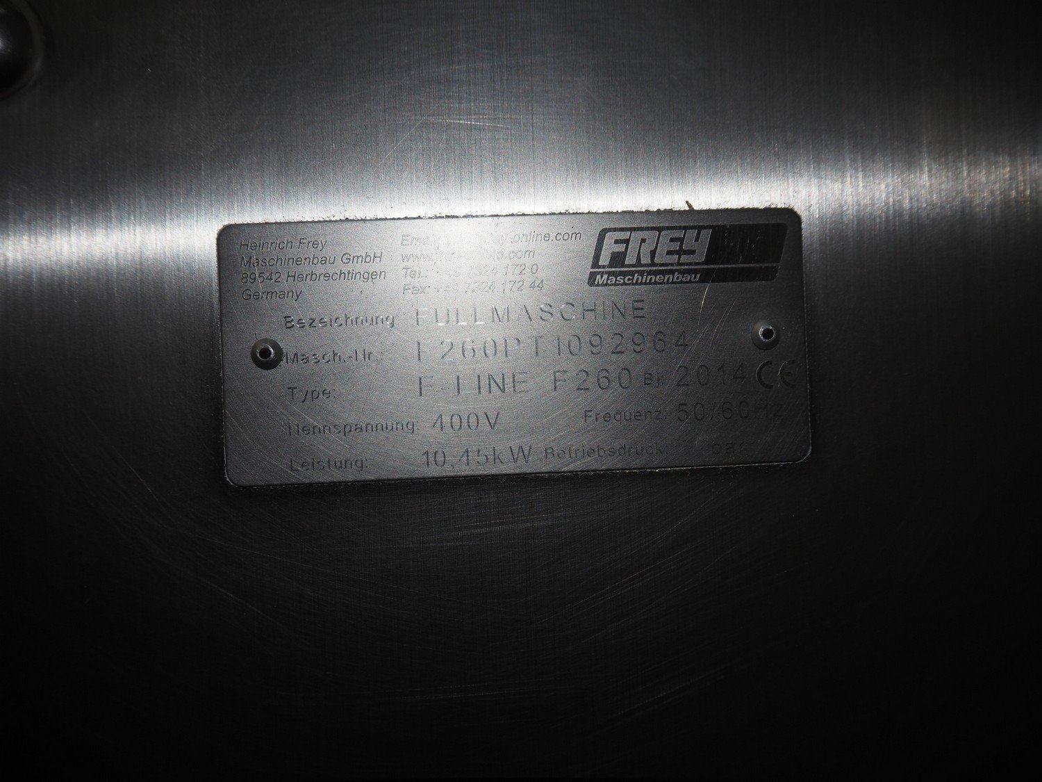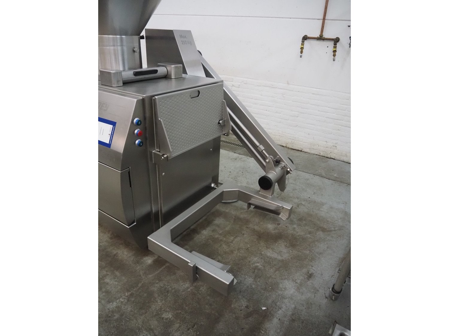 Frey Maschinenbau GmbH vacuum filling machine with lifter for 200 liter meat bins, type: F-line F260, serial number: F260PT1092964, year of construction: 2014, 400 V, 50/60 Hz, 10.45 kW, dimensions: 1700 mm x 1300 mm x 2100 mm. Kavel locatie: Denariusstraat 20, 4903 RC Oosterhout, Nederland