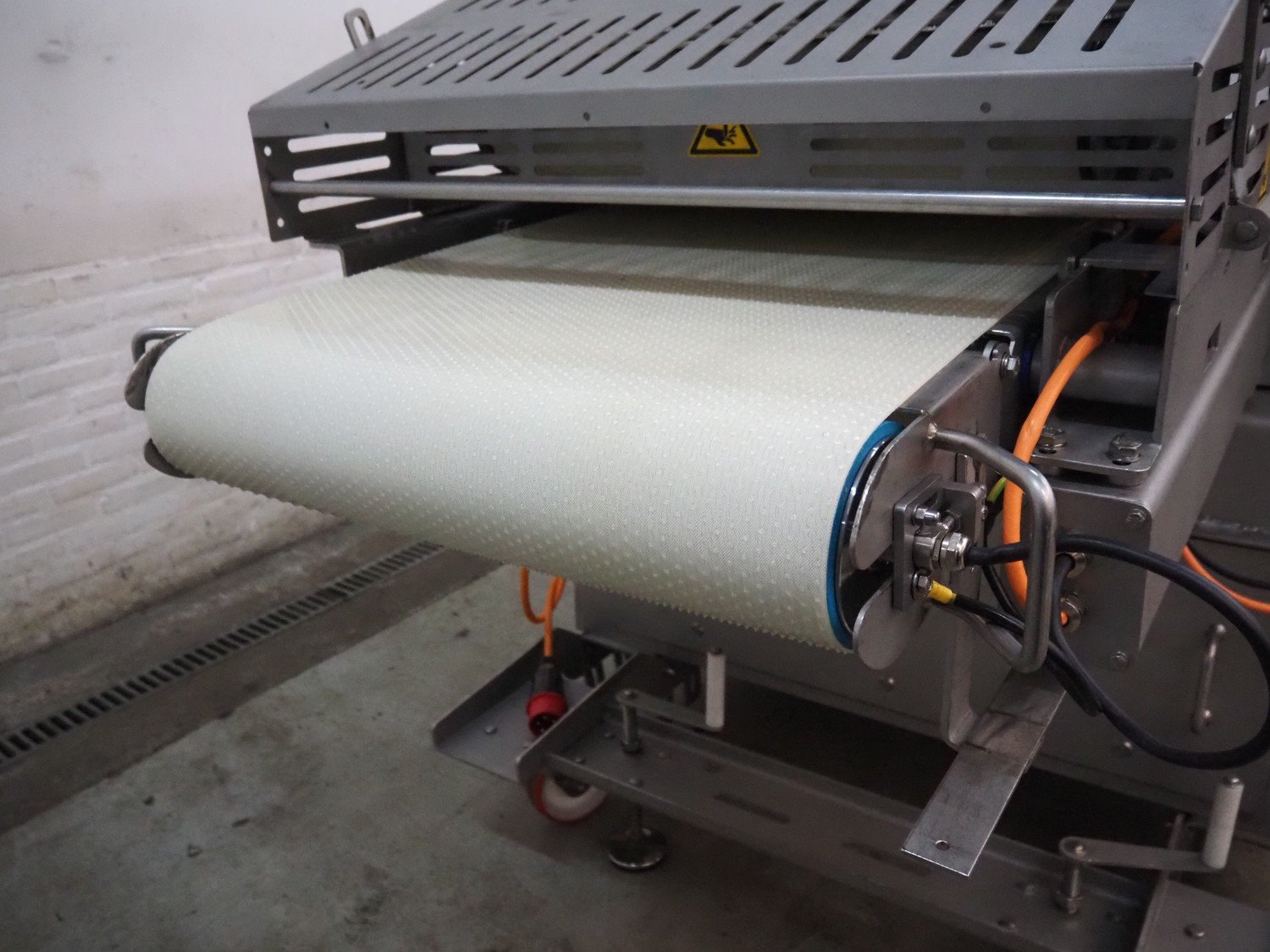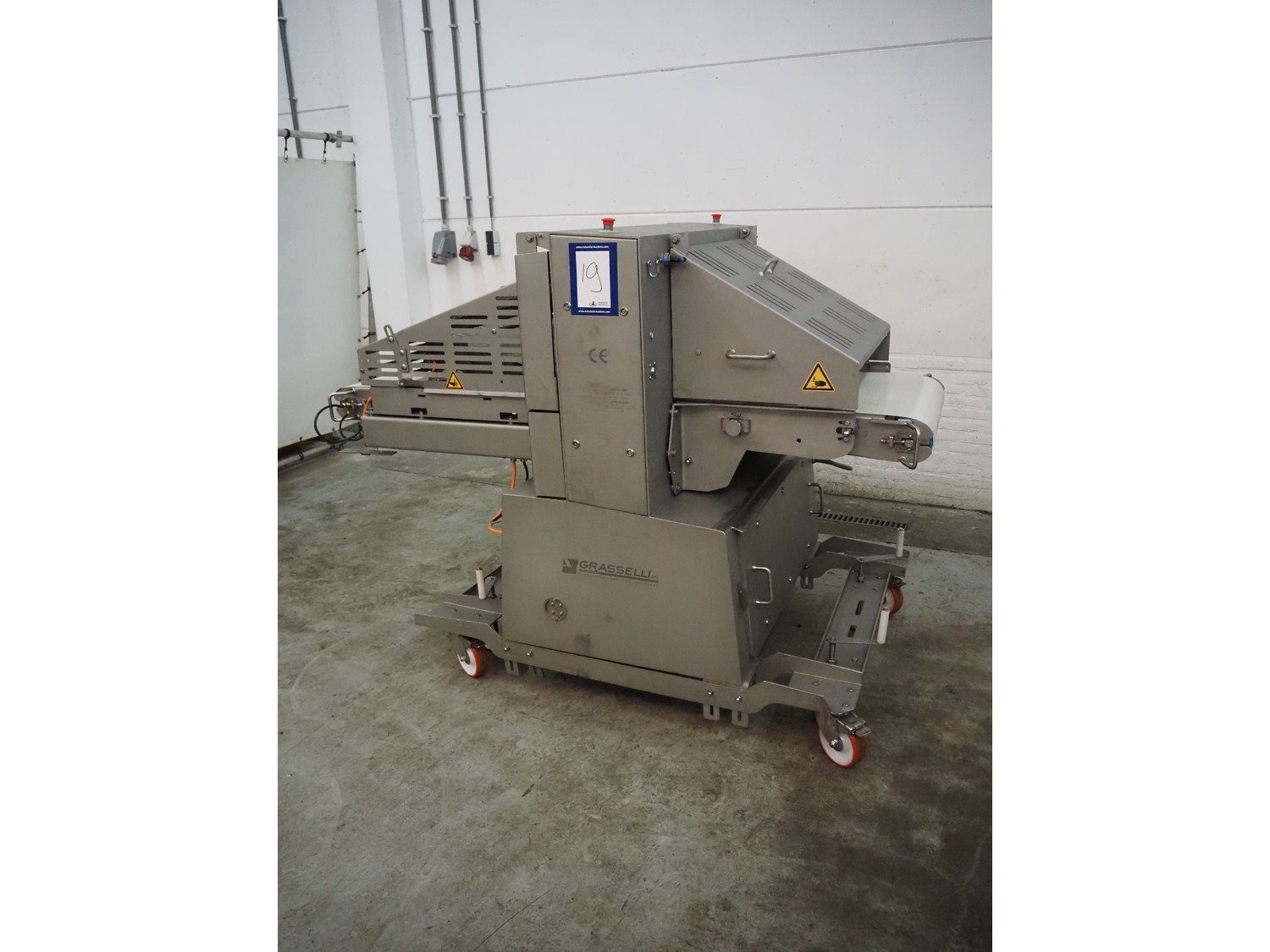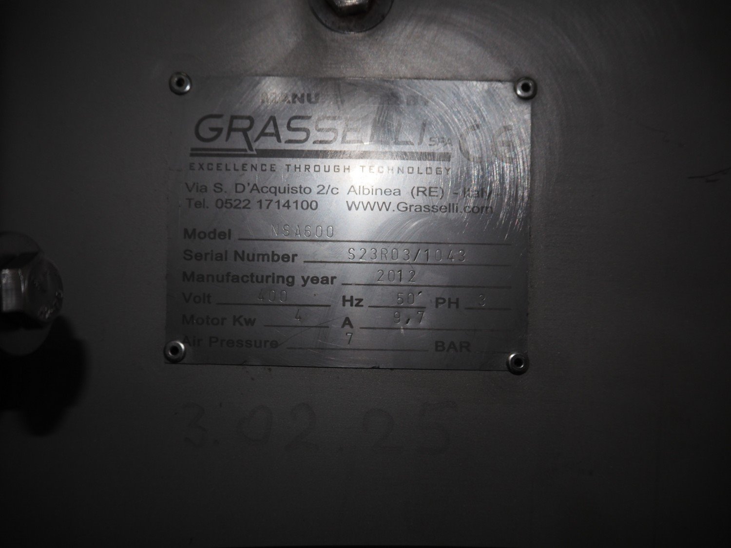 Grasselli S.p.A. mobile slicer, model: NSA600, serial number: S23R03/1043, year of construction: 2012, 400 V, 3 Ph, 50 Hz, 9.4 A, 4 kW, plastic belt, belt width: 600 mm, distance between knives: 5 mm, total dimensions: 2200 mm x 1300 mm x 1600 mm. Including spare belt. Kavel locatie: Denariusstraat 20, 4903 RC Oosterhout, Nederland