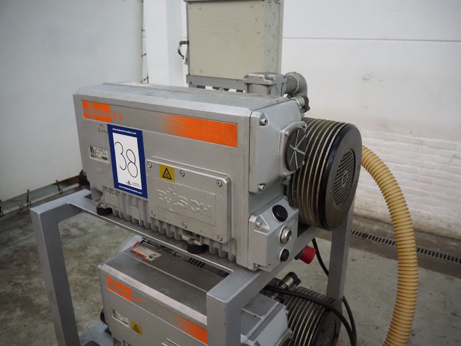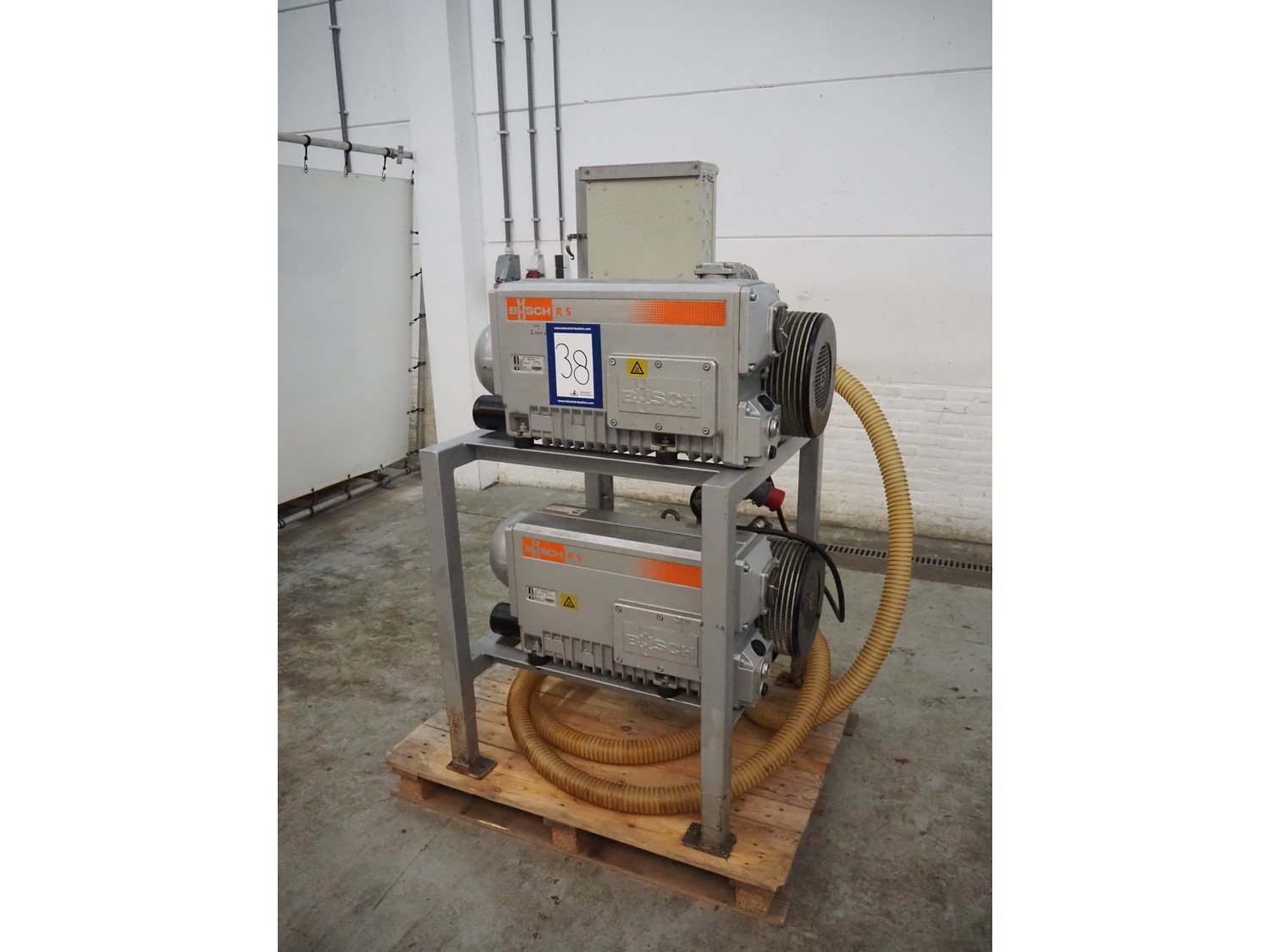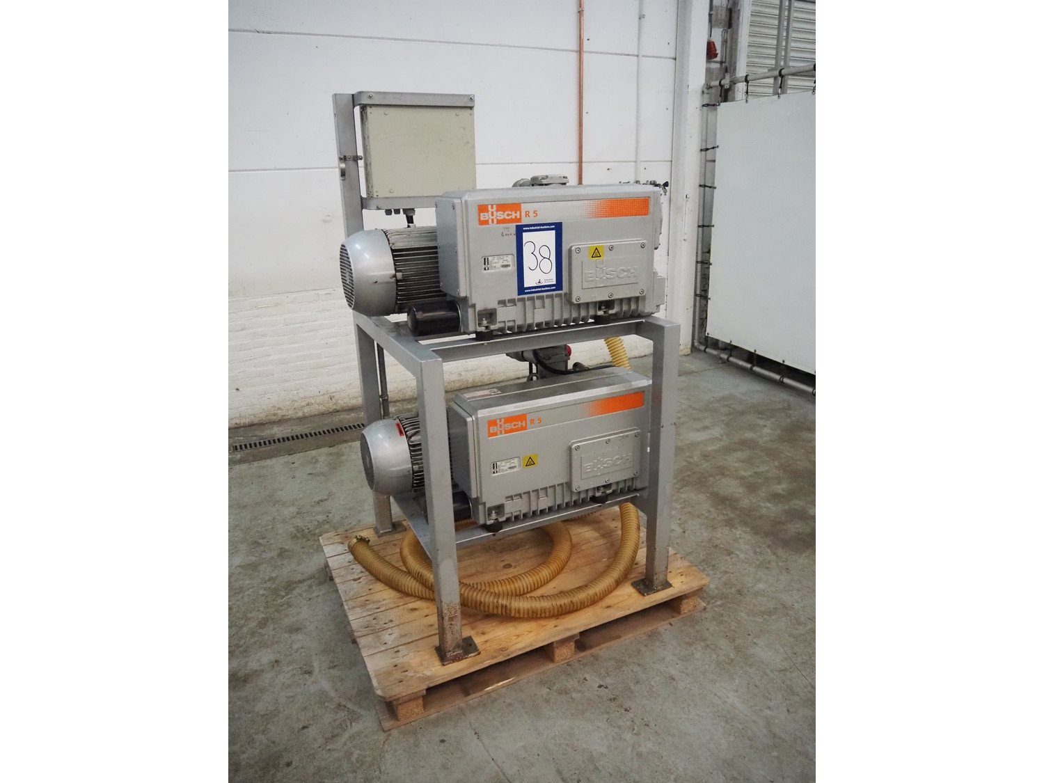 Steel frame with 2 Busch vacuum pumps, type: RA 0302 D 5Z1 CUZZ / RA 0302 D 5Z1 CWZZ, serial number: C0831000199 / C0939000266, year of construction: 2008 / 2009, capacity: (2x) 300 m³ per hour, dimensions: 1000 mm x 950 mm x 1650 mm. Kavel locatie: Denariusstraat 20, 4903 RC Oosterhout, Nederland