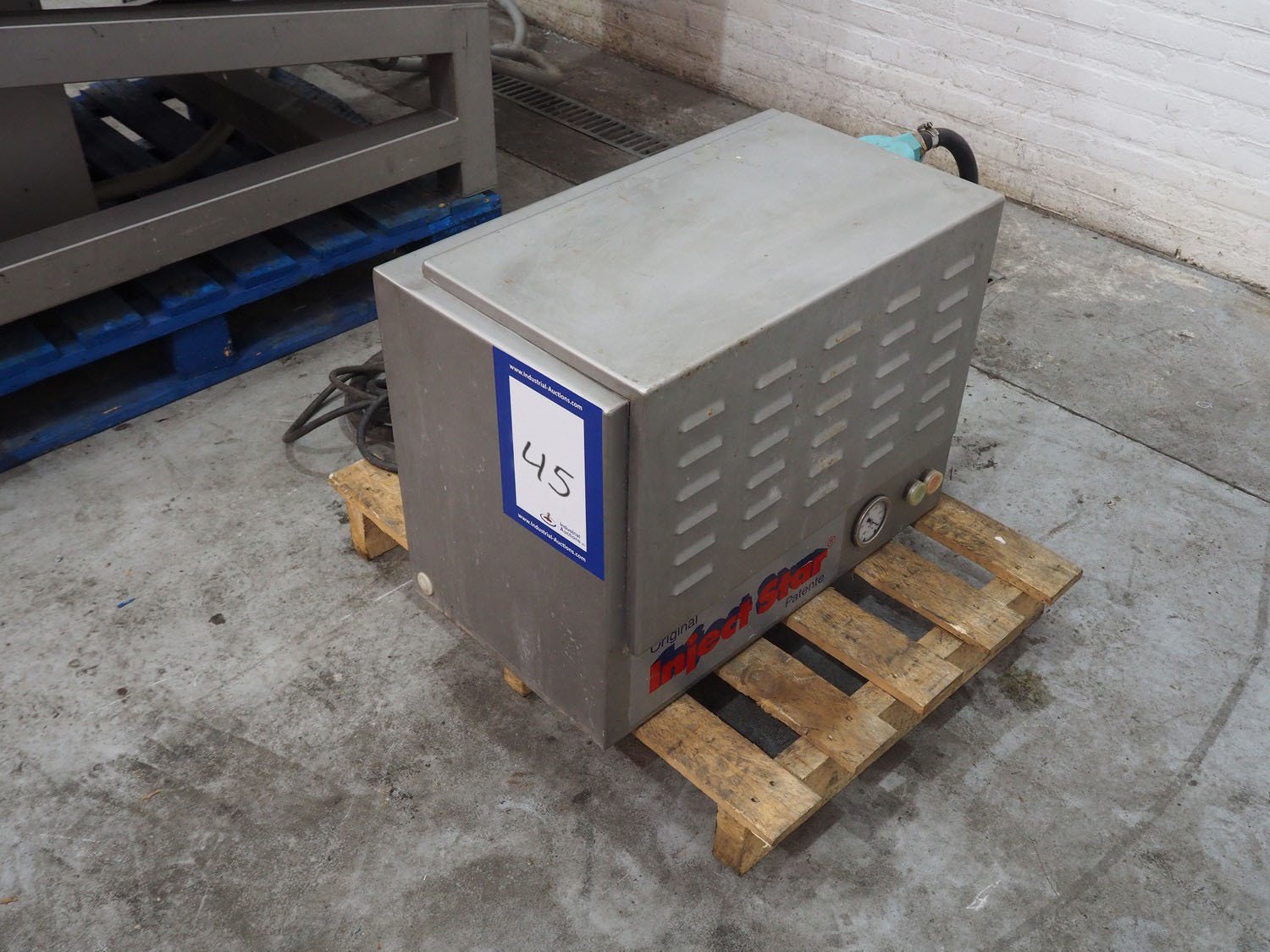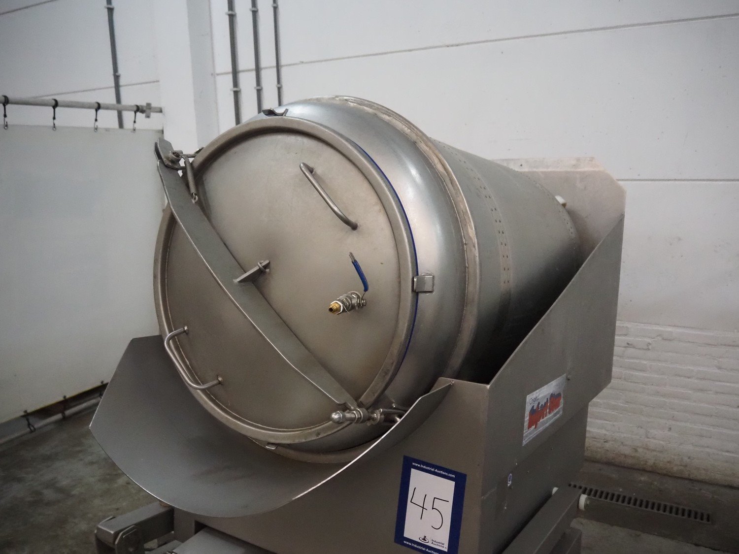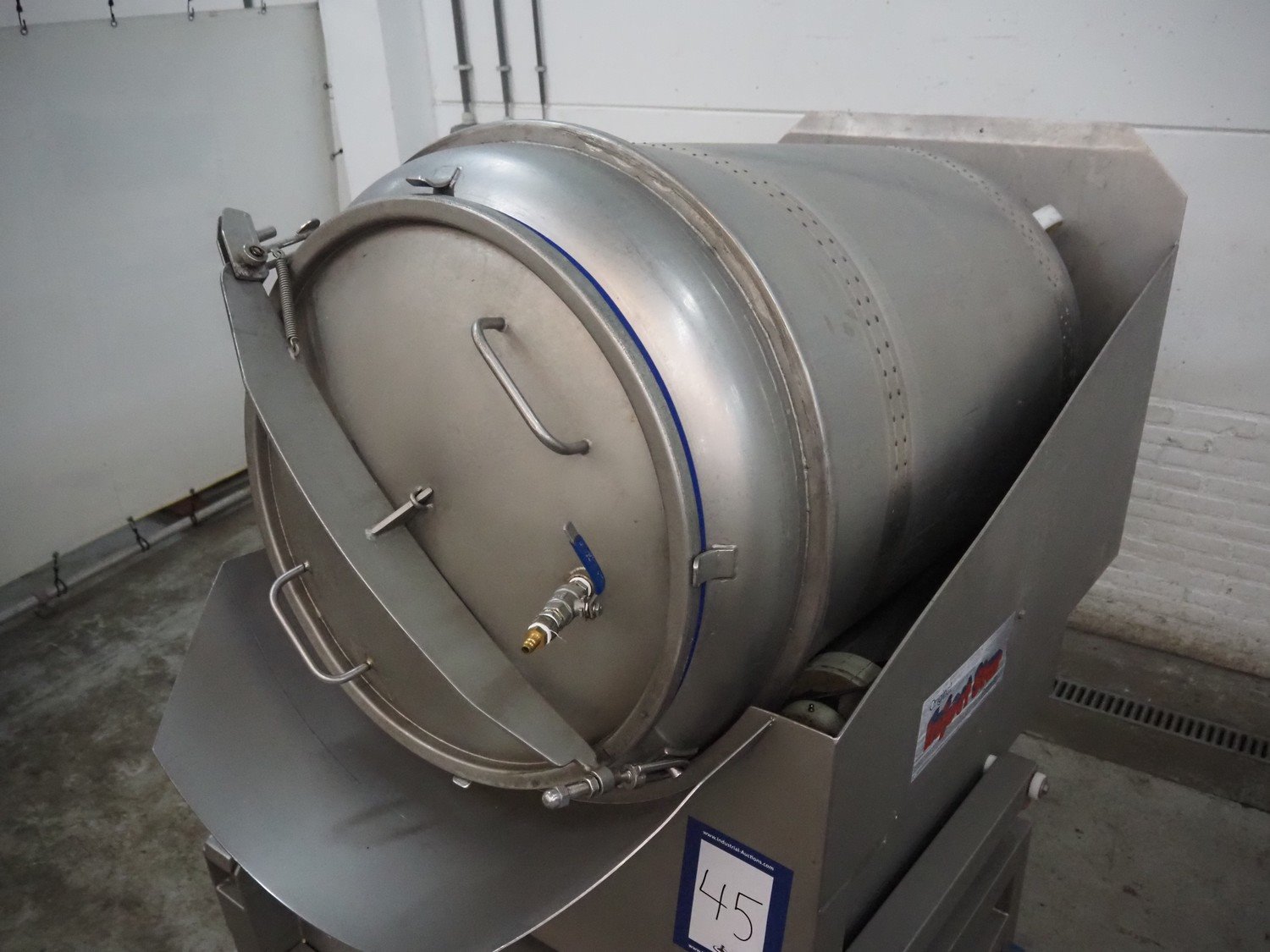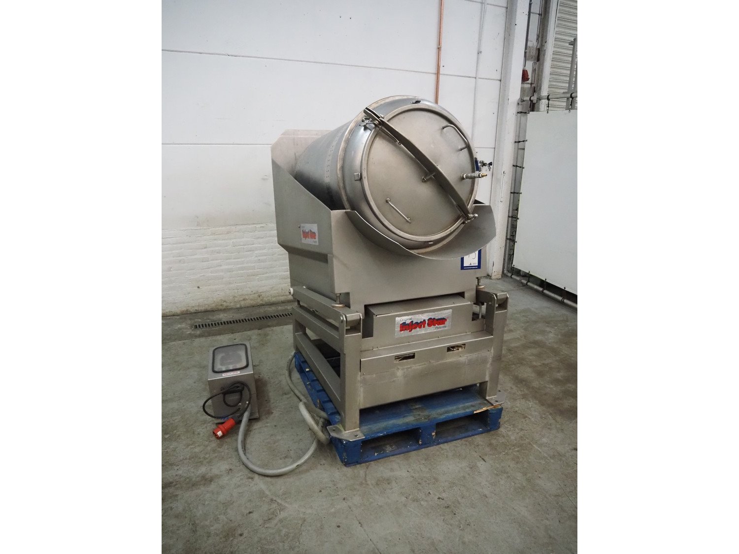 Inject Star vacuum tumbler, type: HSL-750-TC-10, number: 272, year of construction: 2000, 400 V, 3 Ph, 50 Hz, 3.8 kW, volume: 750 liter, weight: 760 kg, dimensions: 1800 mm x 1000 mm x 1780 mm. Inject star vacuum pump, type: TVAP, 380 V, 3 Ph, 50 Hz, 0.75 kW, dimensions: 710 mm x 360 mm x 460 mm. Kavel locatie: Denariusstraat 20, 4903 RC Oosterhout, Nederland