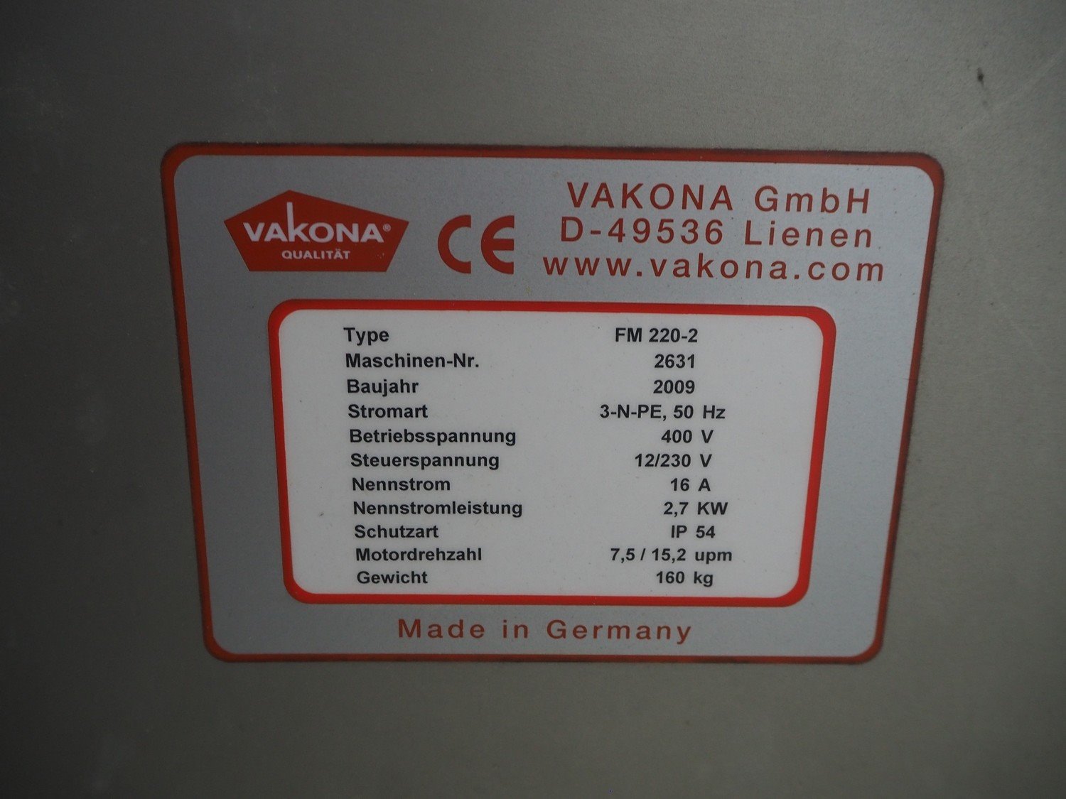 Vakona GmbH mobile tumbler, type: FM 220-2, machine number: 2631, year of construction: 2009, 400 V, 3 Ph, 50 Hz, 16 A, 2.7 kW, volume: 220 liter, weight: 160 KG, total dimensions: 1200 mm x 1000 mm x 1400 mm. Kavel locatie: Denariusstraat 20, 4903 RC Oosterhout, Nederland