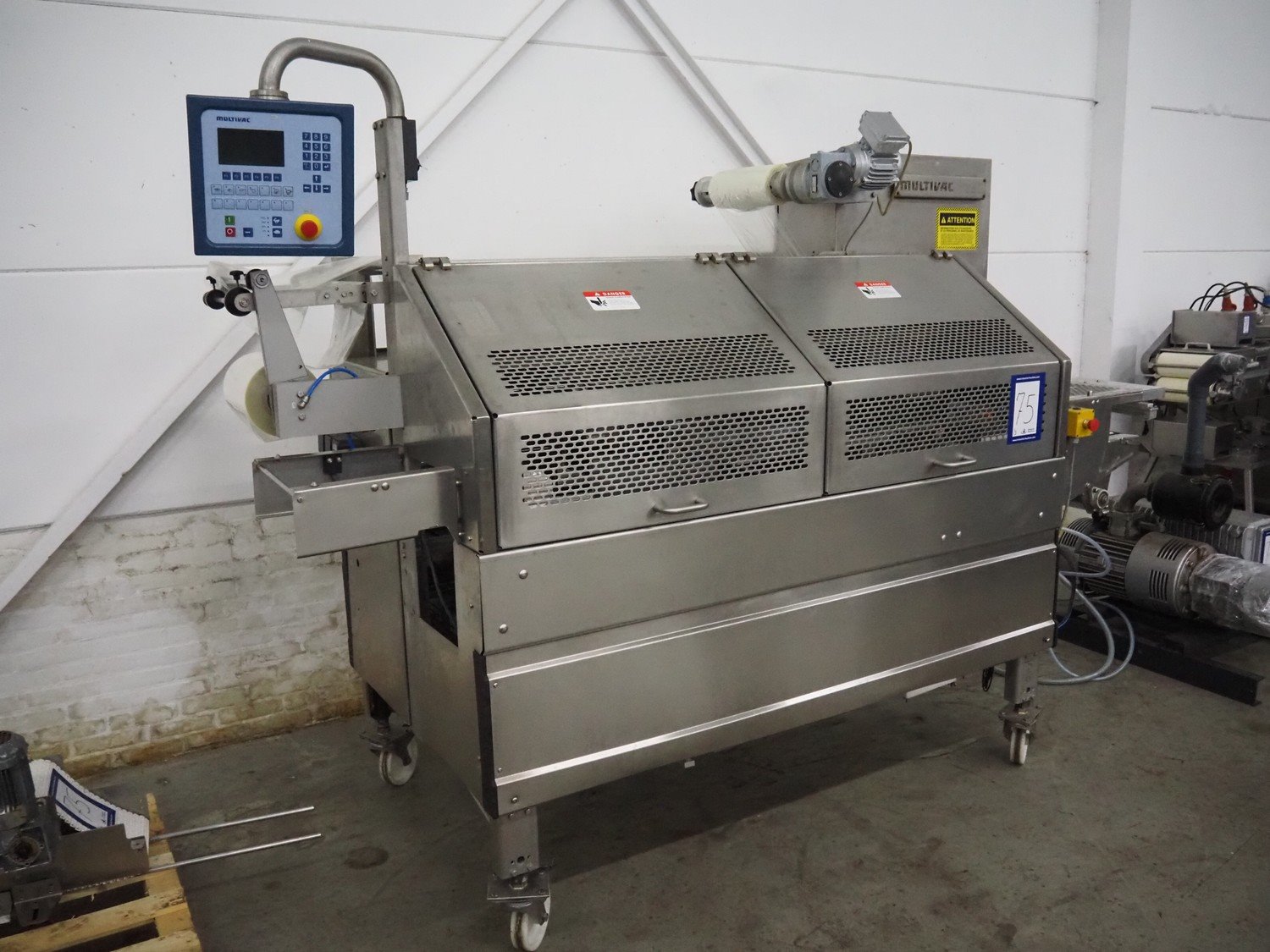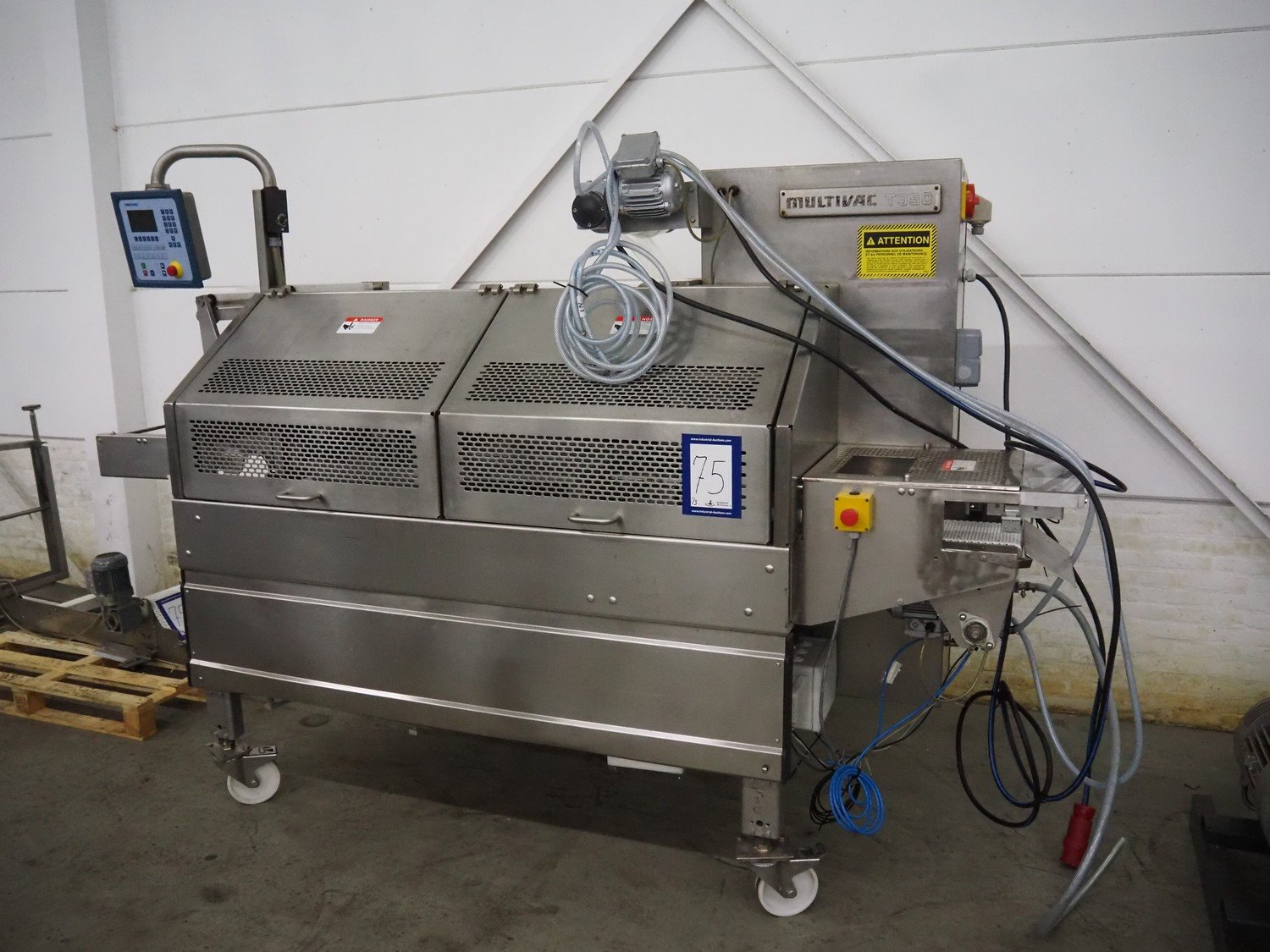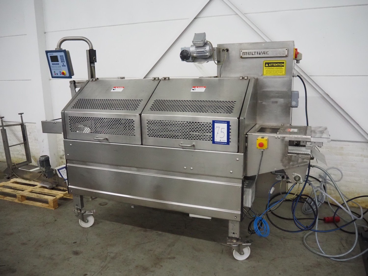 Multivac mobile traysealer, type: T350, serial number: 15, year of construction: 2004, 400 V, 3 Ph, 50 Hz, 30 A, 7.5 kW, film width: 280 mm, plastic mesh belt, belt width: 200 mm, dimensions dye: (2x) 135 mm x 170 mm, total dimensions: 3900 mm x 1200 mm x 2100 mm. Including Busch vacuum pump, type: RA 0250 D 5ZI ONXX, capacity: 250 m³ per hour. Kavel locatie: Denariusstraat 20, 4903 RC Oosterhout, Nederland