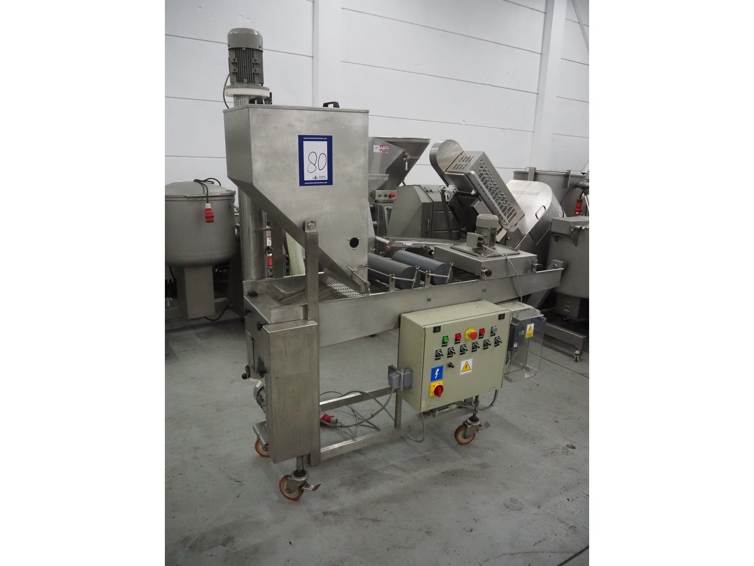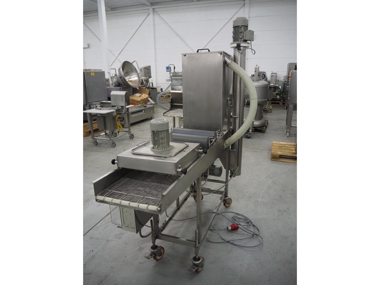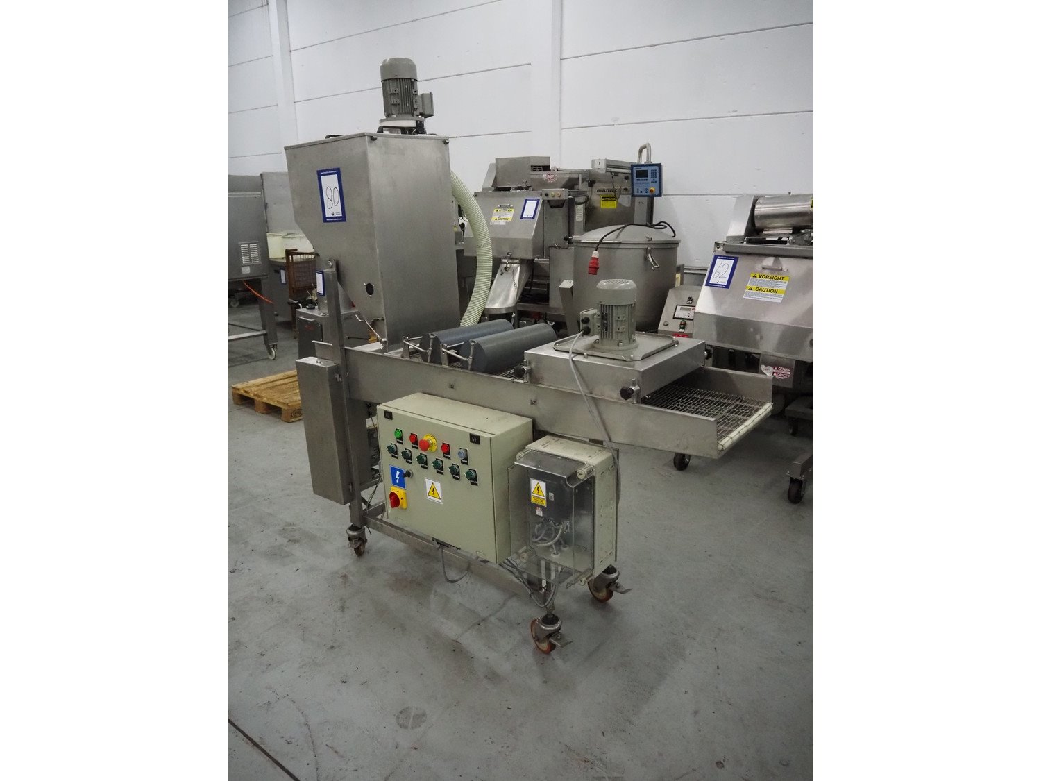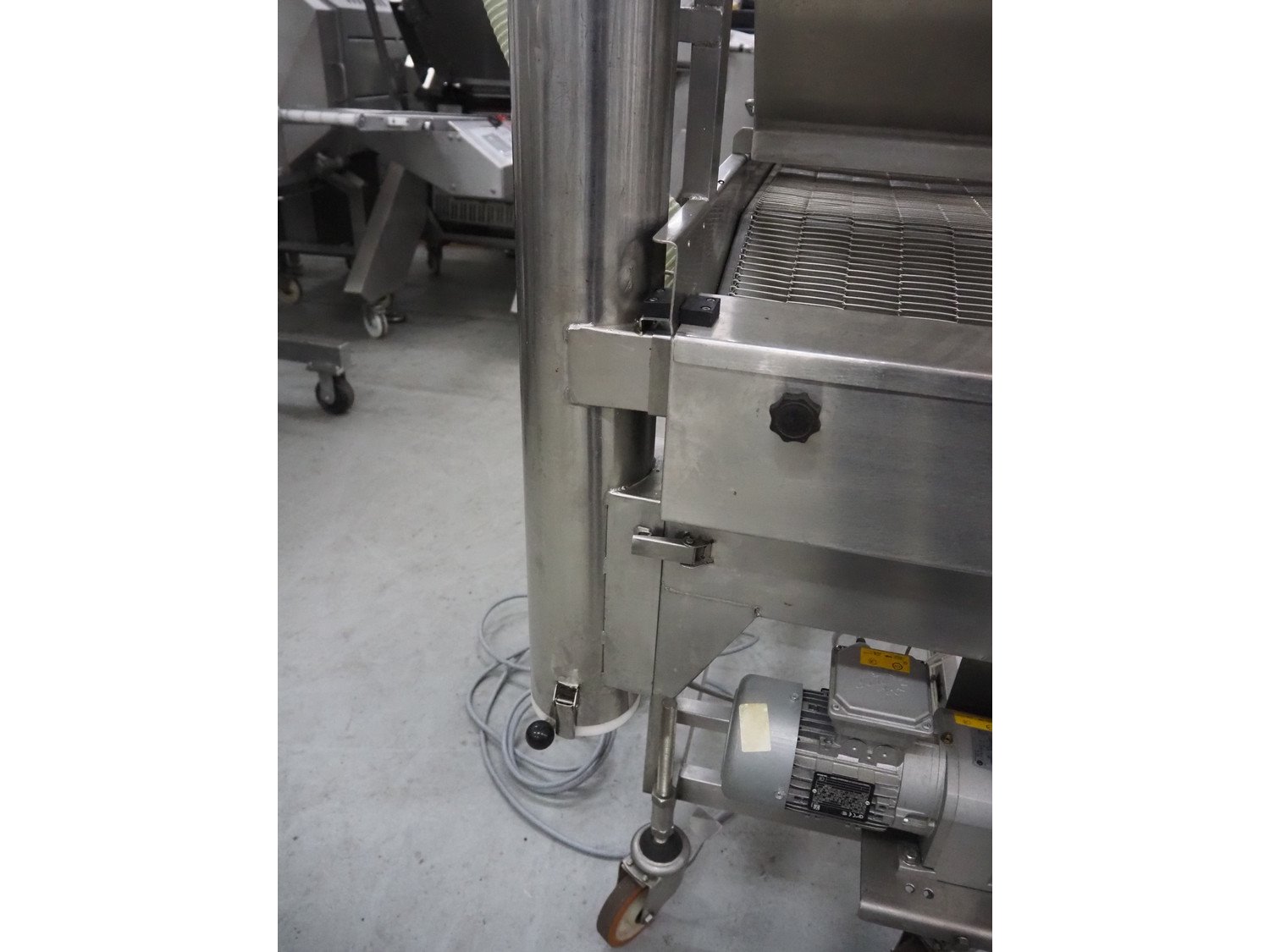 S/s mobile breading machine, s/s mesh belt, belt width: 400 mm, plastic rollers, roller width: 400 mm, total dimensions: 1820 mm x 620 mm x 2150 mm. Kavel locatie: Denariusstraat 20, 4903 RC Oosterhout, Nederland