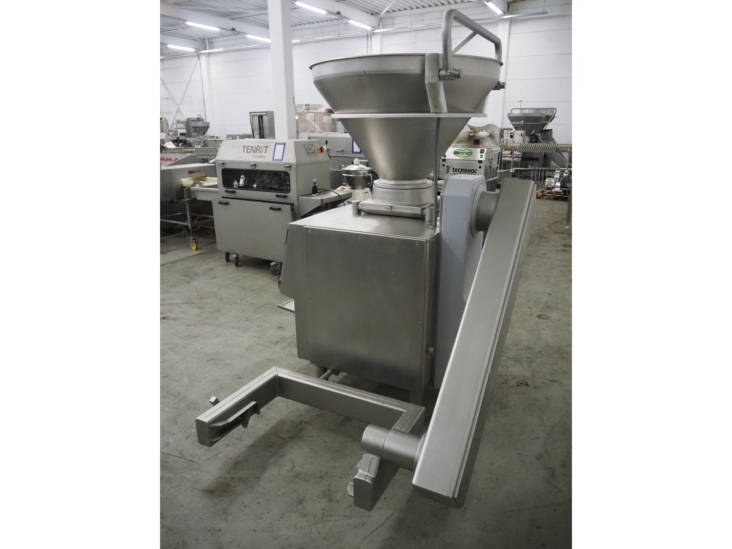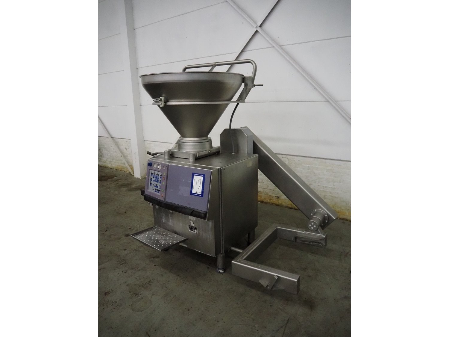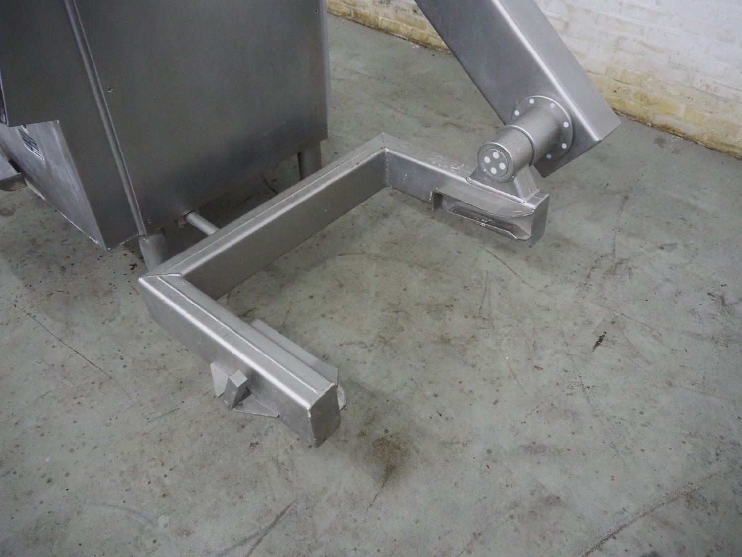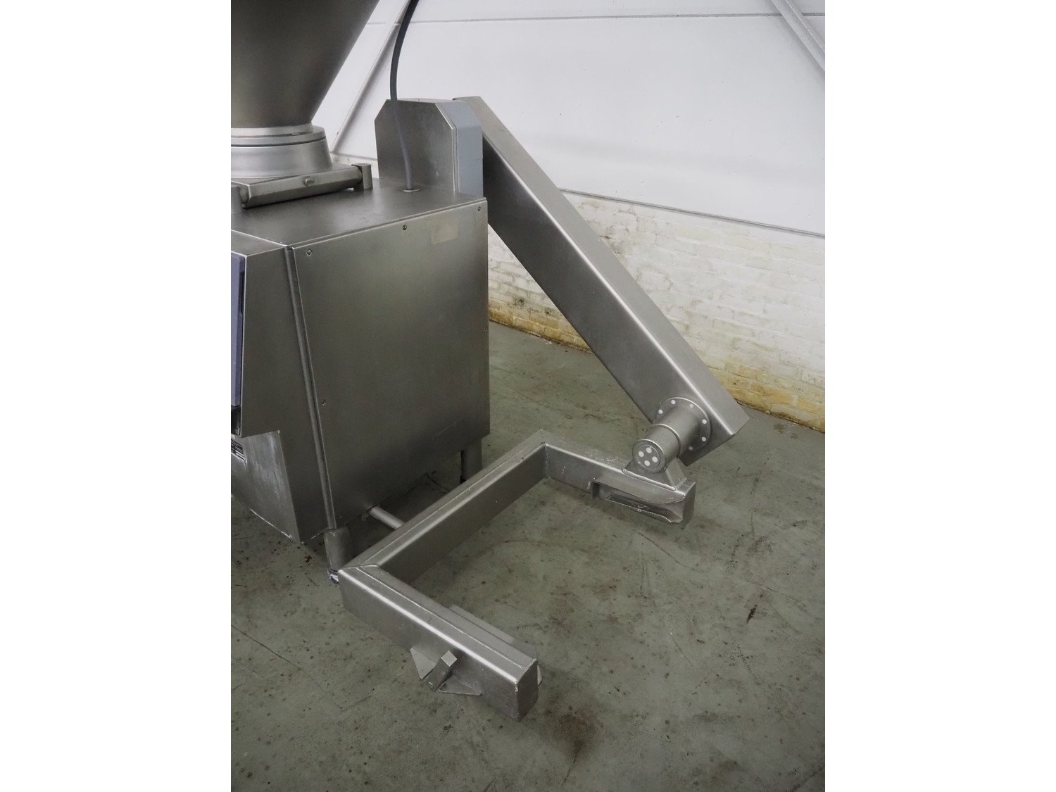 Handtmann vacuum filling machine with lifter for 200 liter meat bins and linking attachment, type: VF200 B, number: 1180, 380 V, 50 Hz, 12.6 A, 4.5 kW, type linking attachment: 34-5, number: 10938, Becker vacuum pump, type: U1.16SA-31, capacity: 16/19 m³ per hour, dimensions: 1950 mm x 1400 mm x 2050 mm. Kavel locatie: Denariusstraat 20, 4903 RC Oosterhout, Nederland