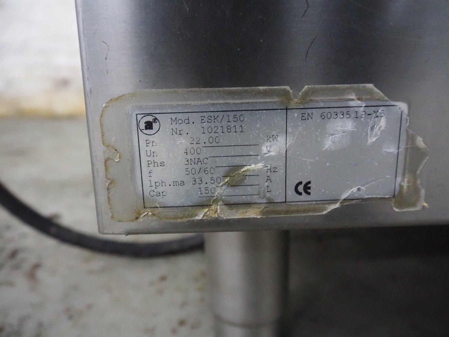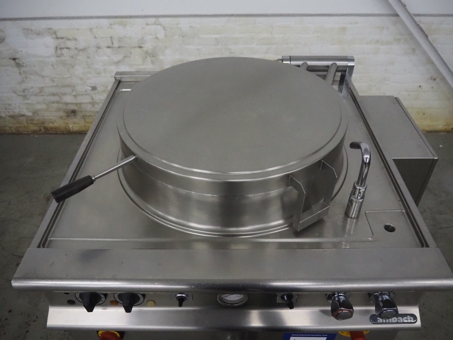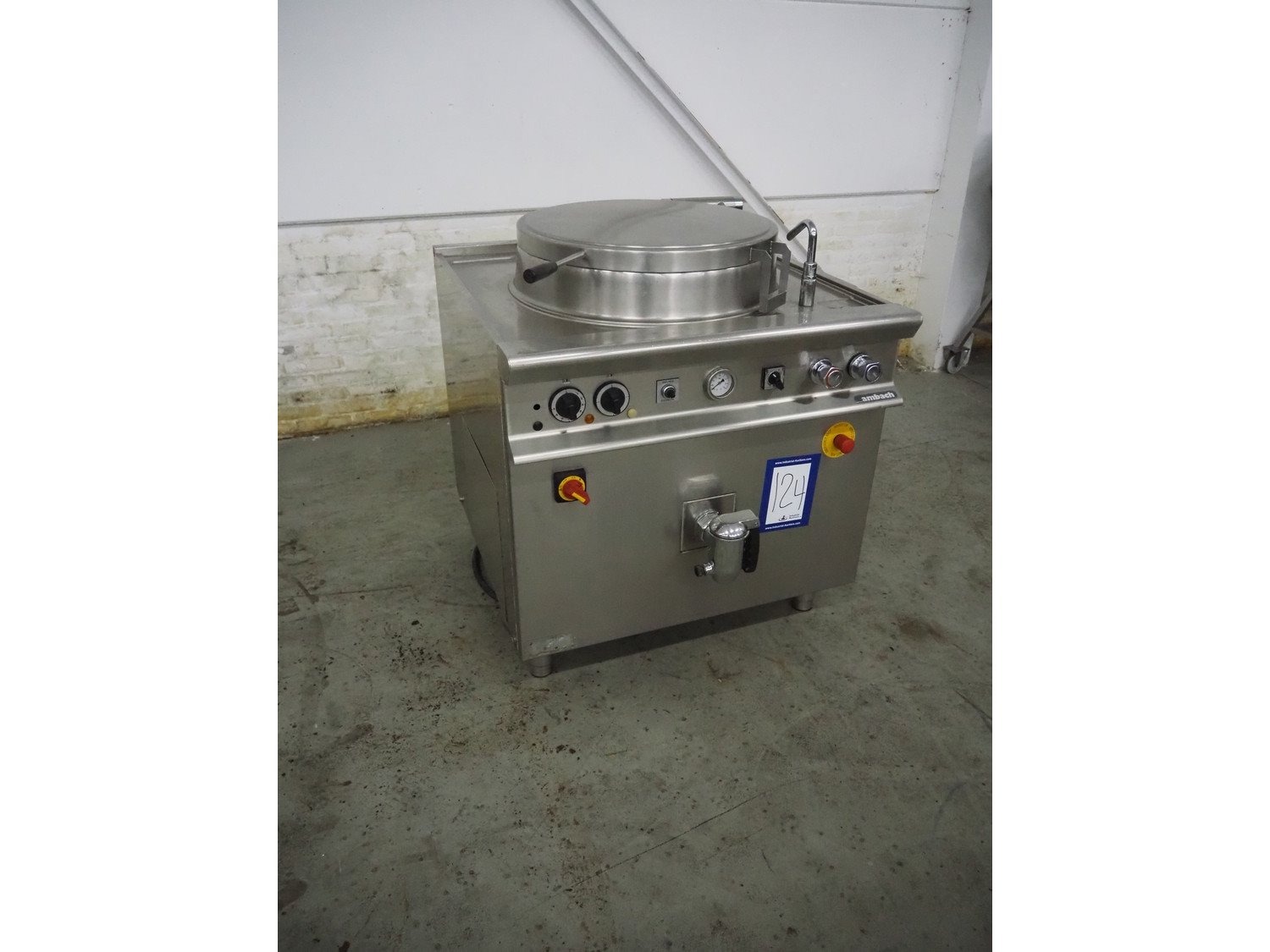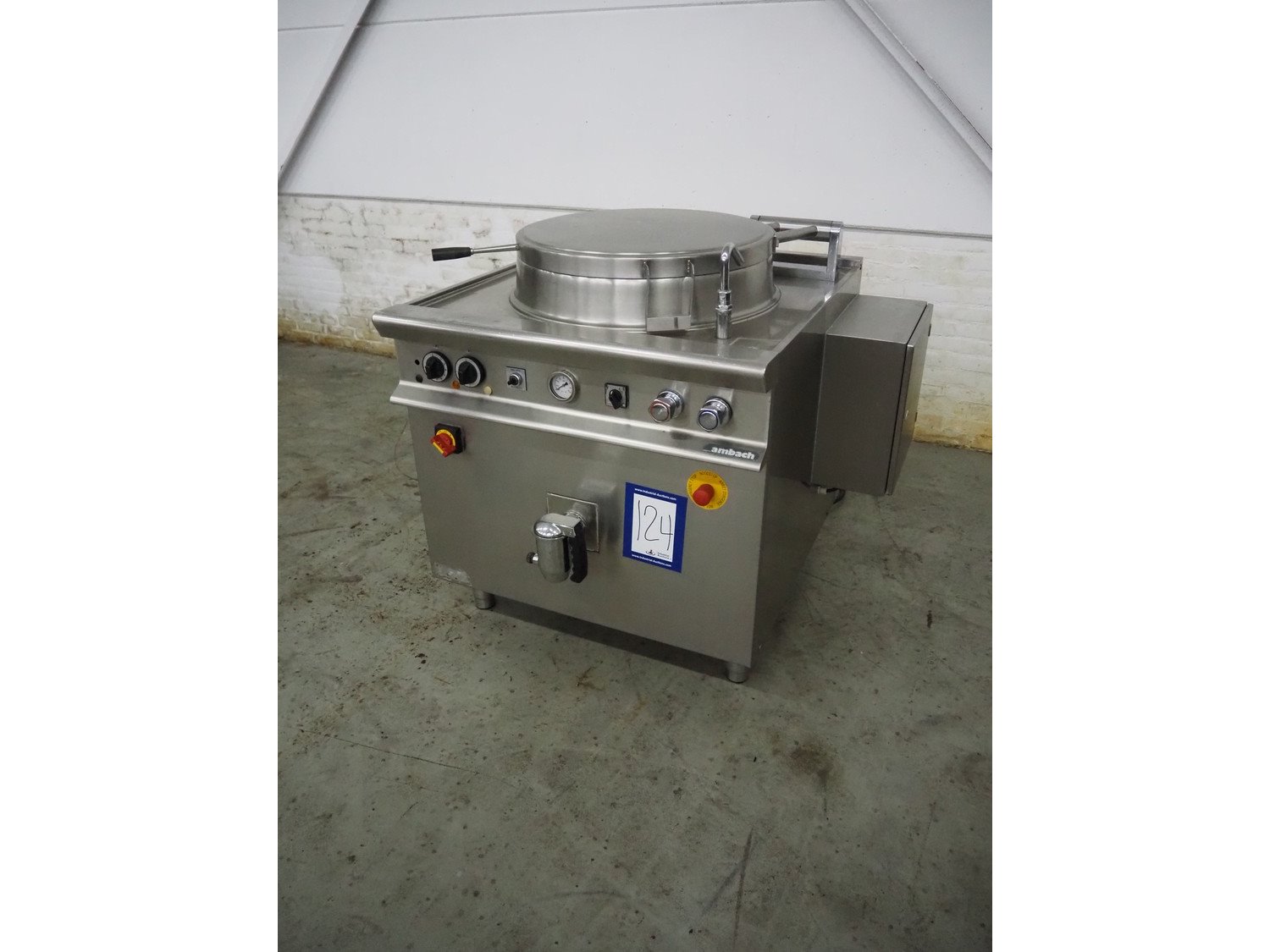 Ambach cooking vessel, model: ESK/150, number: 1021811, 400 V, 3 Ph, 50/60 Hz, 33.5 A, 22 kW, capacity: 150 liter, dimensions: 1120 mm x 1000 mm x 1050 mm. Kavel locatie: Denariusstraat 20, 4903 RC Oosterhout, Nederland