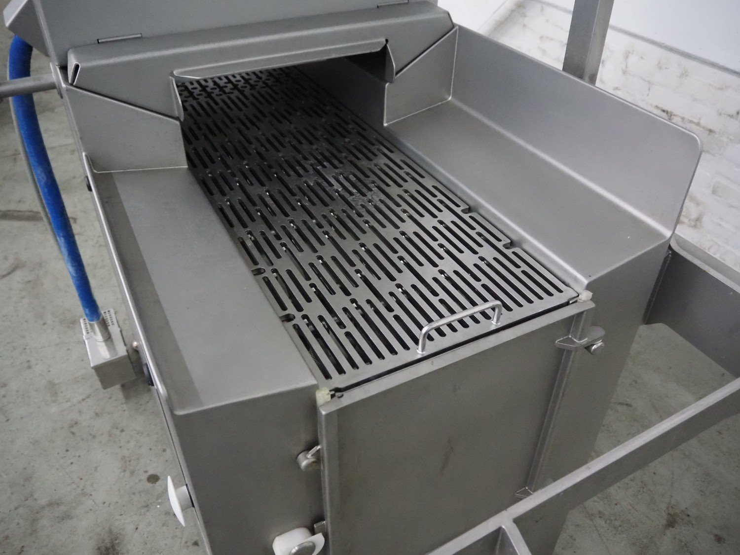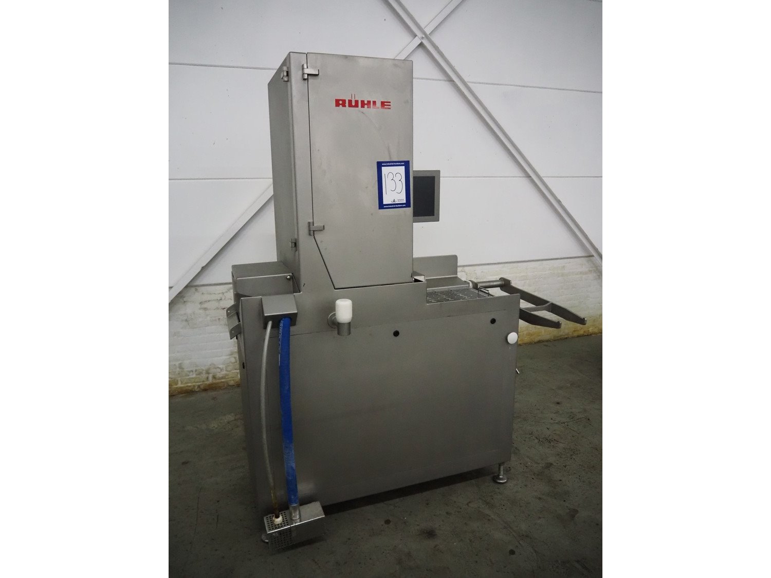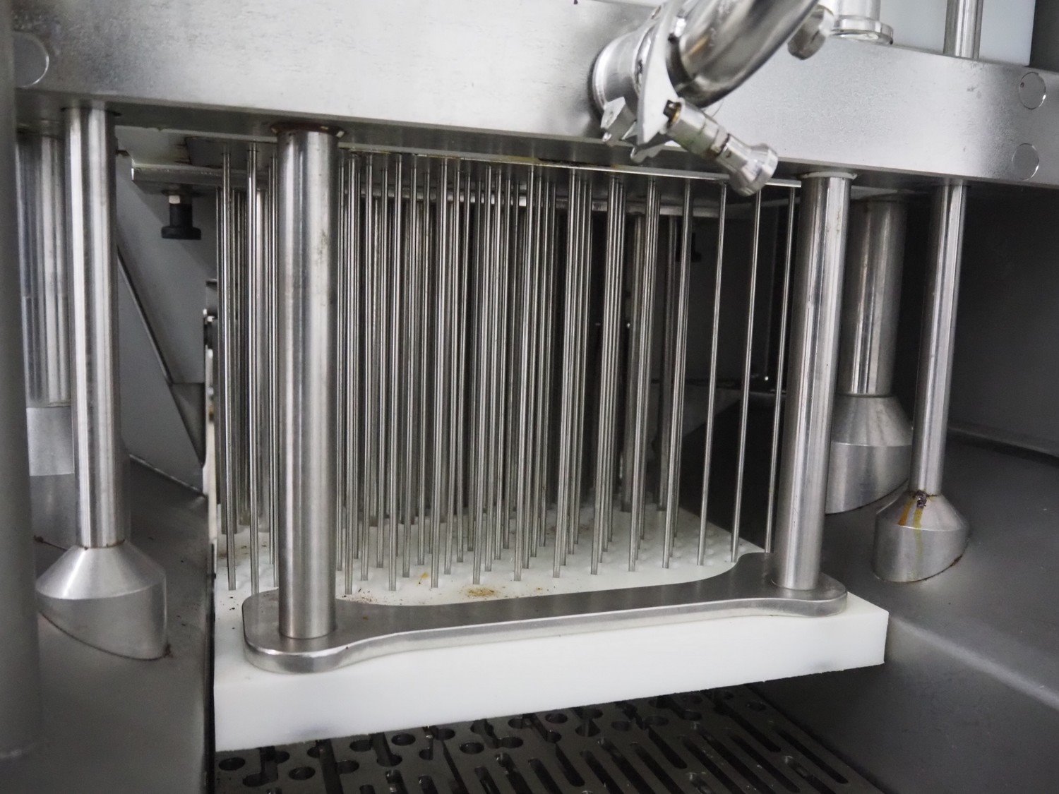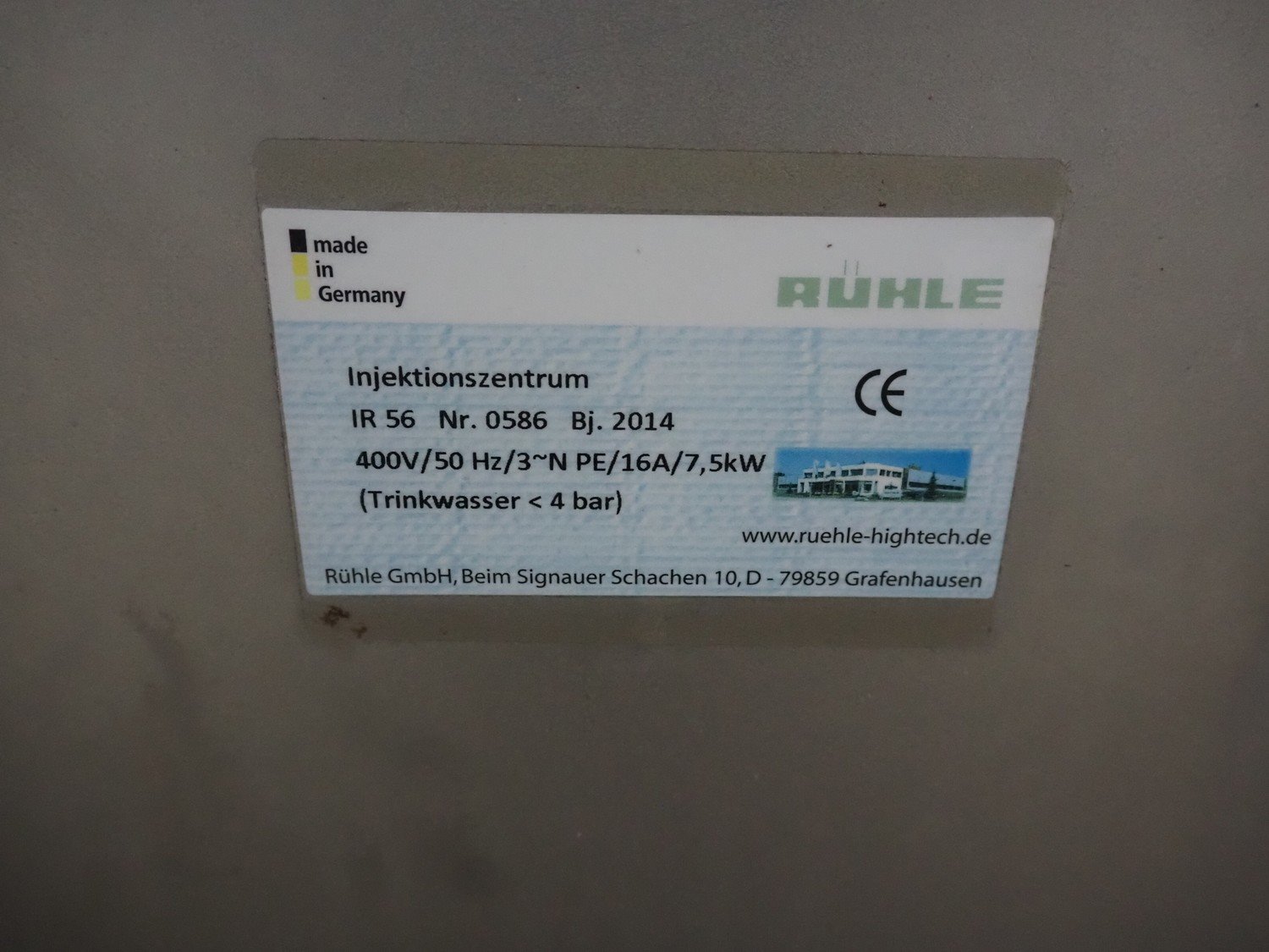 Rühle injector with lifter for E2 crates, type: IR 56, number: 0586, year of construction: 2014, 400 V, 3 Ph, 50 Hz, 7.5 kW, 16 A, 56 needles, s/s walking beam, width: 350 mm, clearance: 350 mm x 170 mm, total dimensions: 1800 mm x 1000 mm x 2050 mm. Kavel locatie: Denariusstraat 20, 4903 RC Oosterhout, Nederland