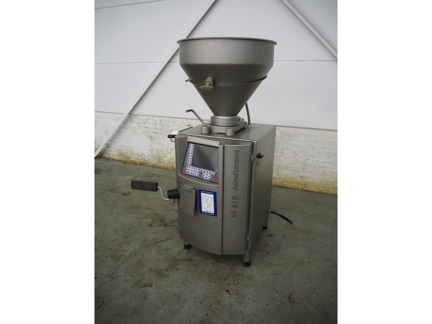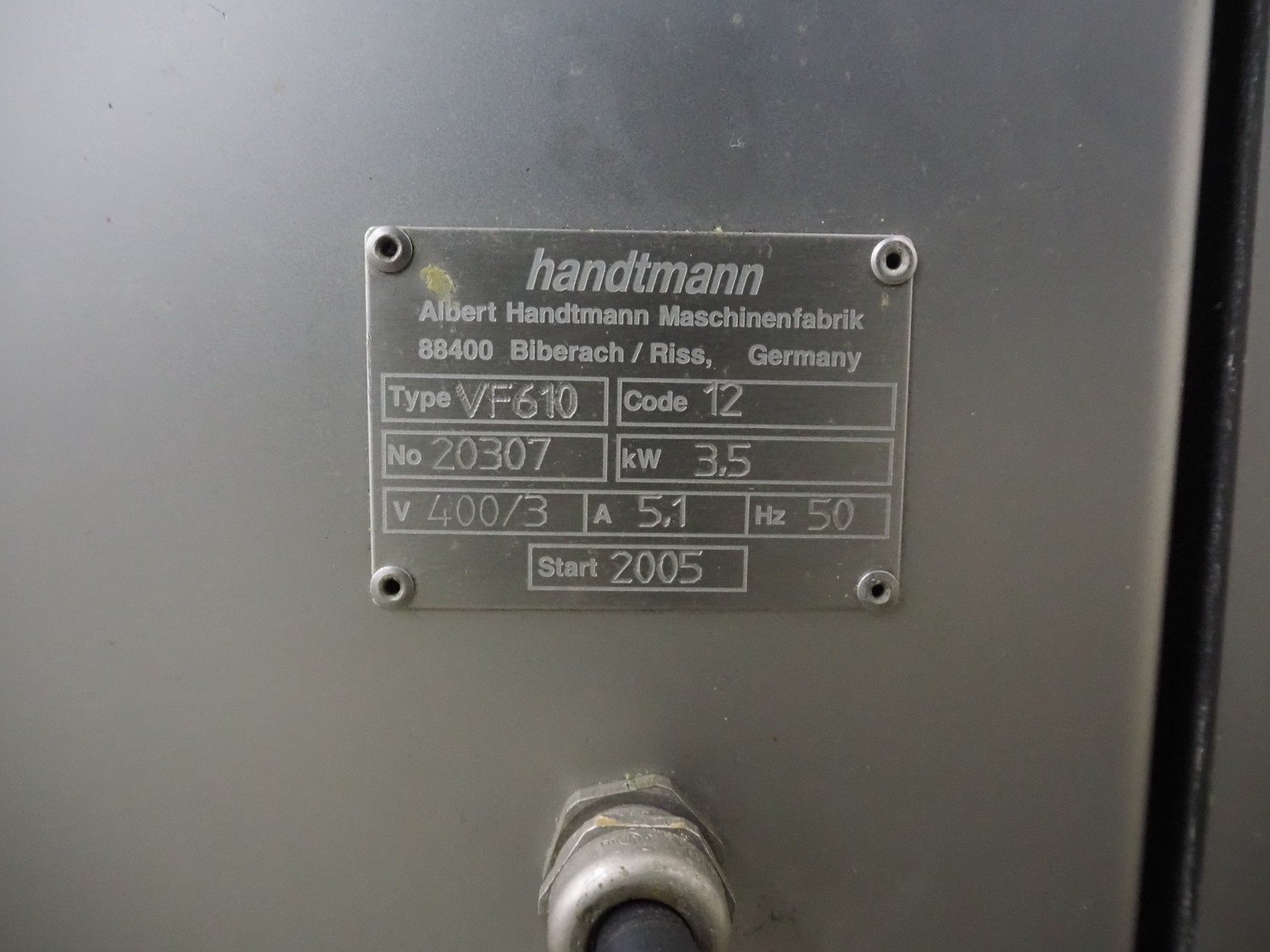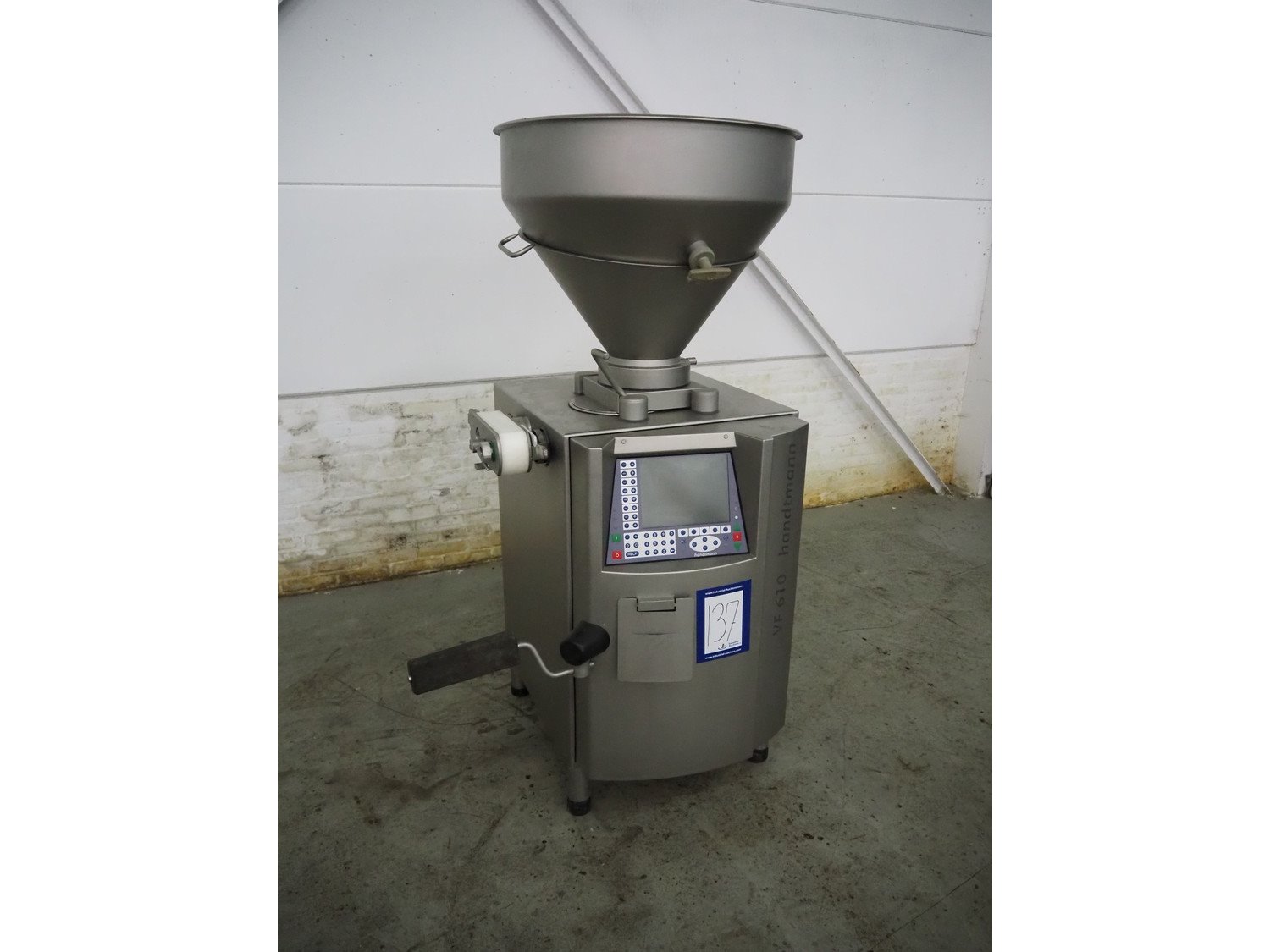 Handtmann vacuum filling machine with linking attachment, type: VF610, number: 20307, year of construction: 2005, 400 V, 3 Ph, 50 Hz, 3.5 kW, 5.1 A, linking attachment type: 34-5, number: 14137, Busch vacuum pump, model: KC 0016 E, capacity: 16 m³per hour, dimensions: 1150 mm x 950 mm x 1730 mm. Kavel locatie: Denariusstraat 20, 4903 RC Oosterhout, Nederland