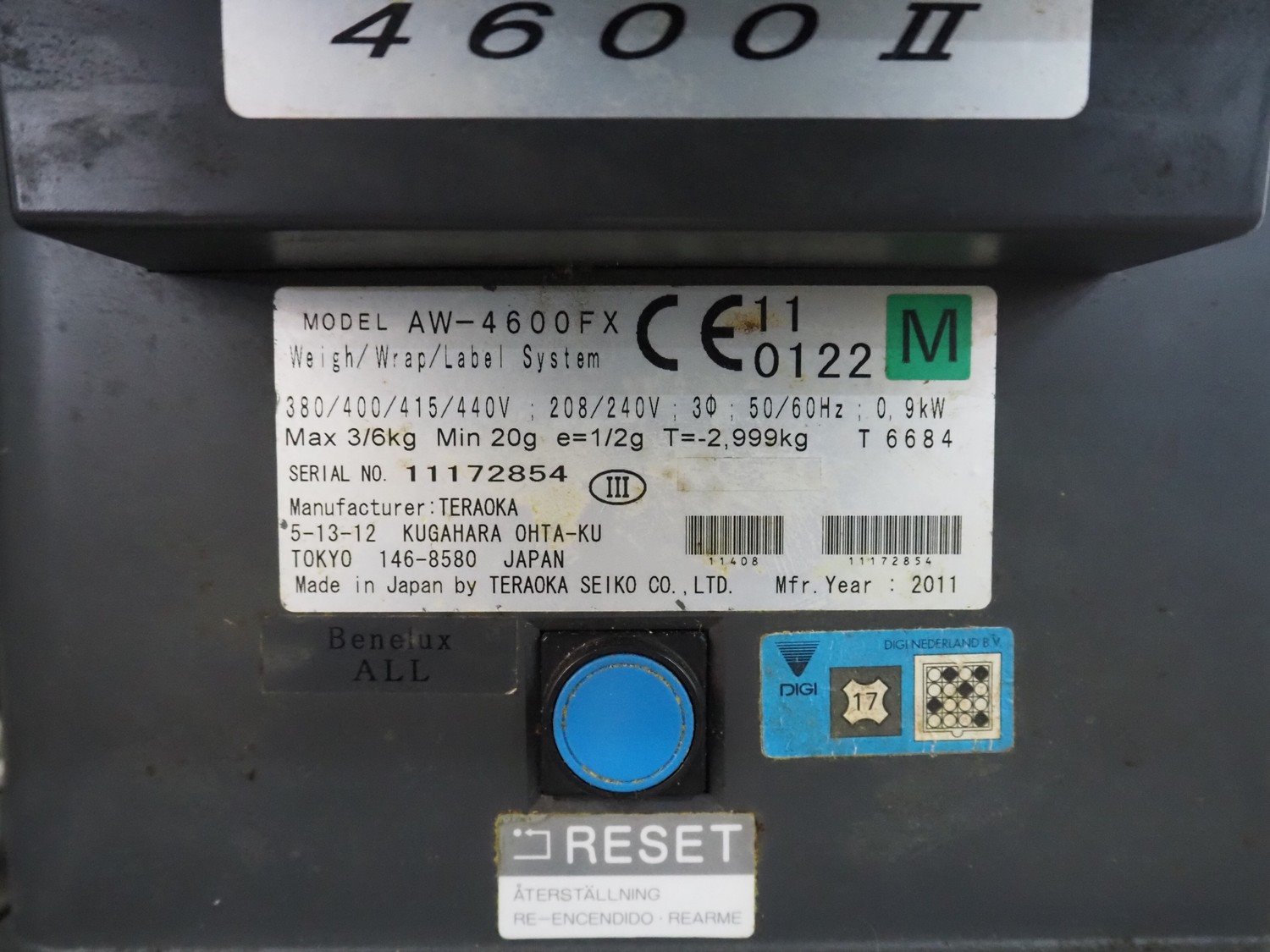 Digi / Teraoka Seiko Co., Ltd. mobile weigh-, wrap-, and label machine, model: AW-4600FX, serial number: 11172854, year of construction: 2011, 380/400/415 V, 3 Ph, 50/60 Hz, 0.9 kW, max: 3/6 kg, min: 20 g, e= 1/2 g, film width: 400 mm, total dimensions: 1000 mm x 860 mm x 1650 mm. Kavel locatie: Denariusstraat 20, 4903 RC Oosterhout, Nederland