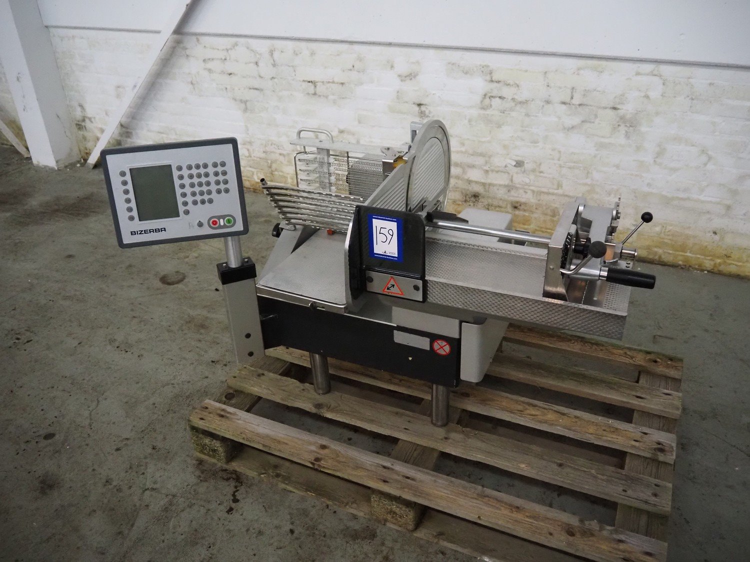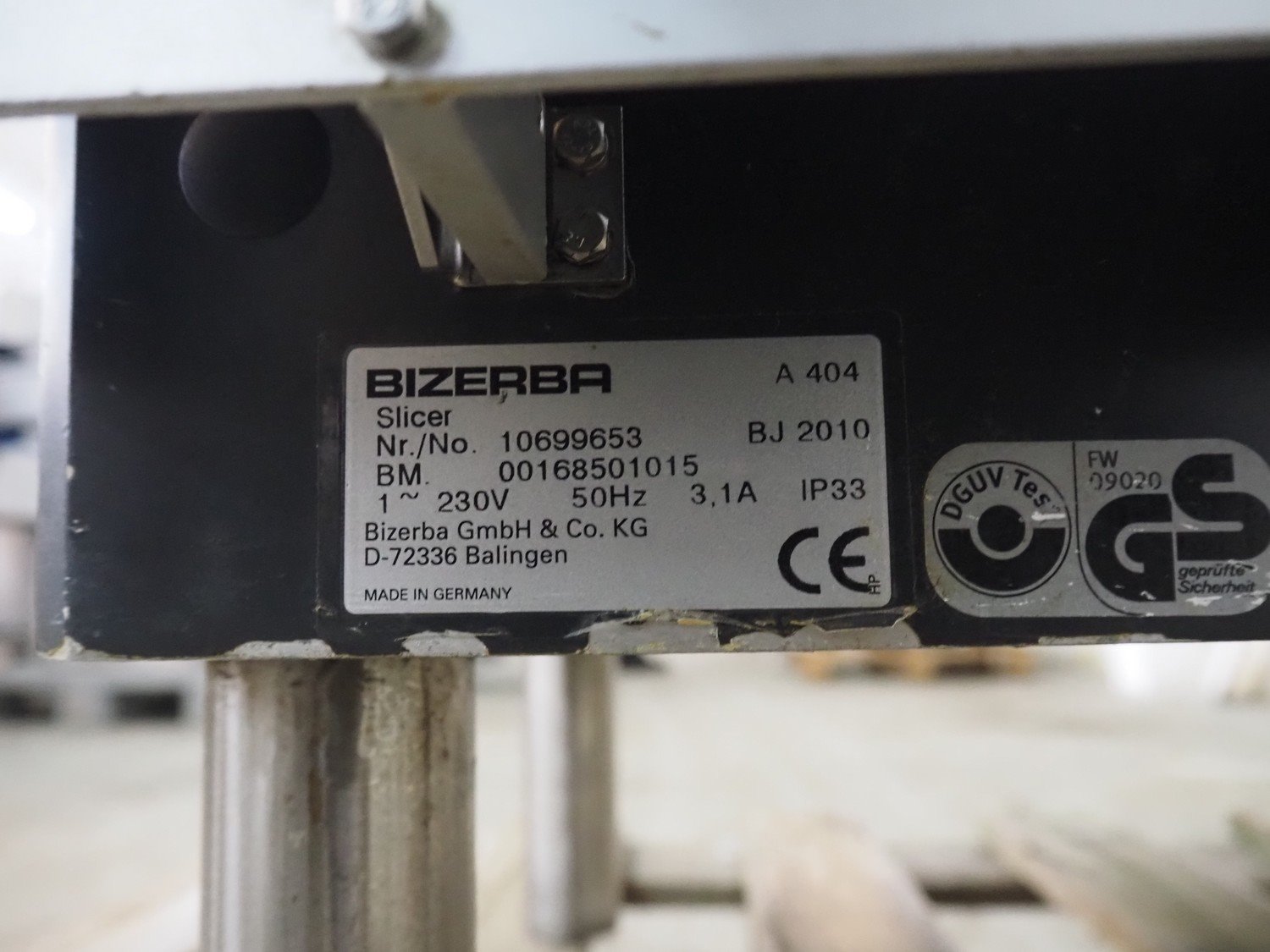 Bizerba automatic slicer, type: A 404, number: 10699653, year of construction: 2010, 230 V, 1 Ph, 50 Hz, 3.1 A, dimensions: 1160 mm x 850 mm x 760 mm. Kavel locatie: Denariusstraat 20, 4903 RC Oosterhout, Nederland