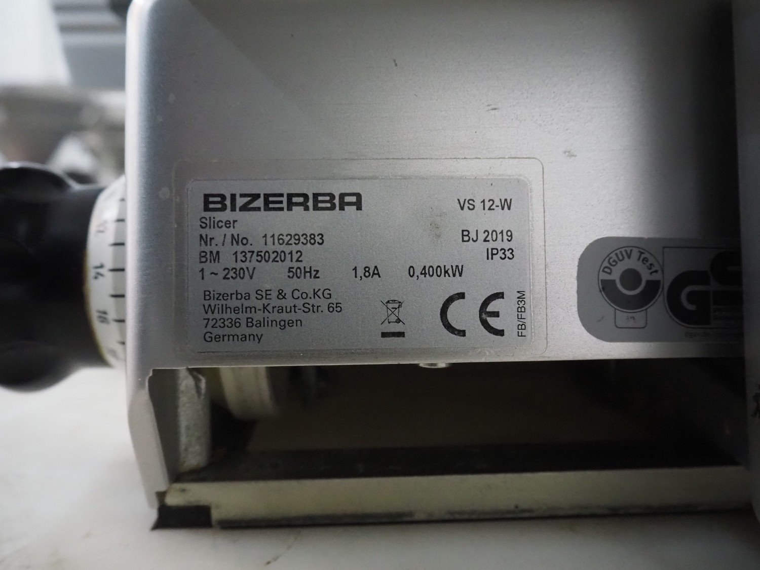 Bizerba slicer with weighing scale, type: VS 12-W, number: 11629383, year of construction: 2019, 230 V, 1 Ph, 50 Hz, 1.8 A, 0.400 kW, dimensions scale: 260 mm x 245 mm, total dimensions: 630 mm x 520 mm x 420 mm. Kavel locatie: Denariusstraat 20, 4903 RC Oosterhout, Nederland