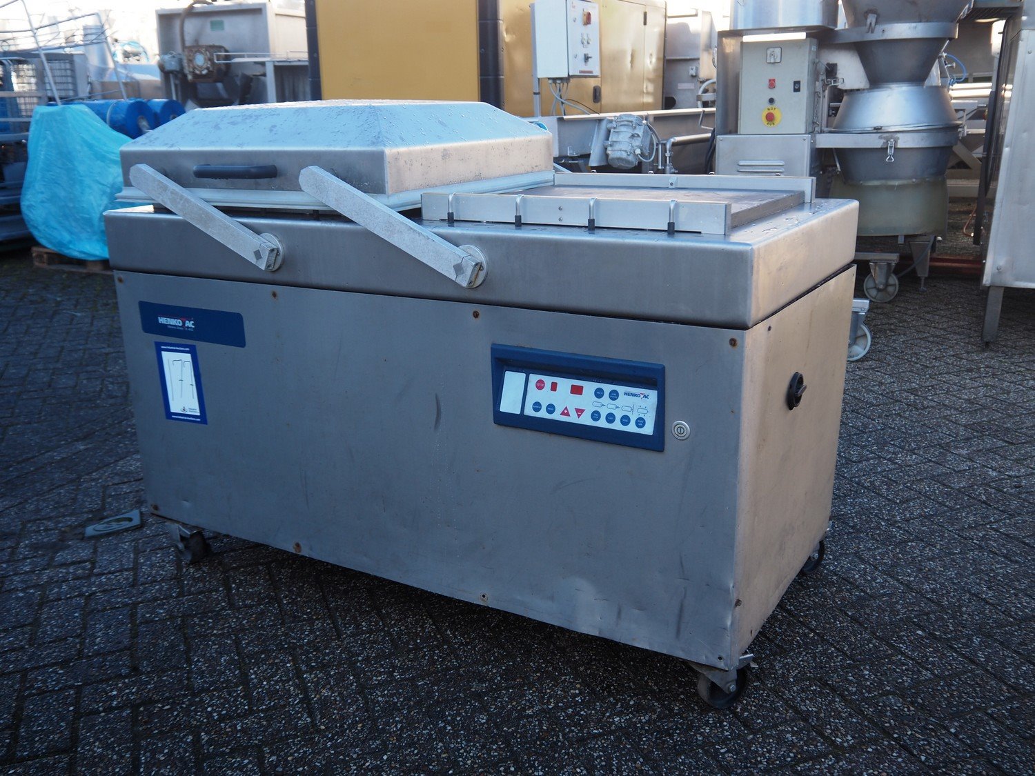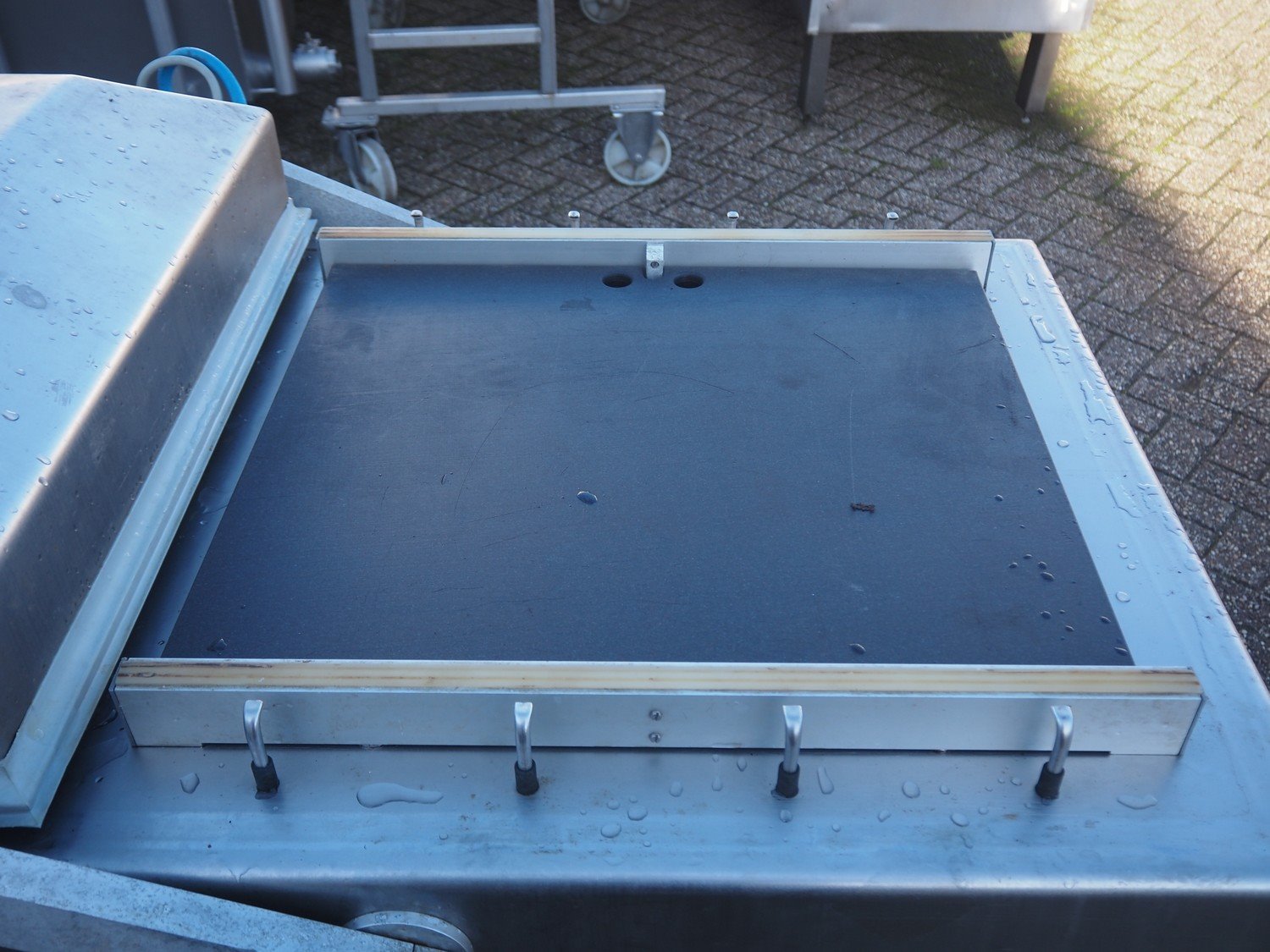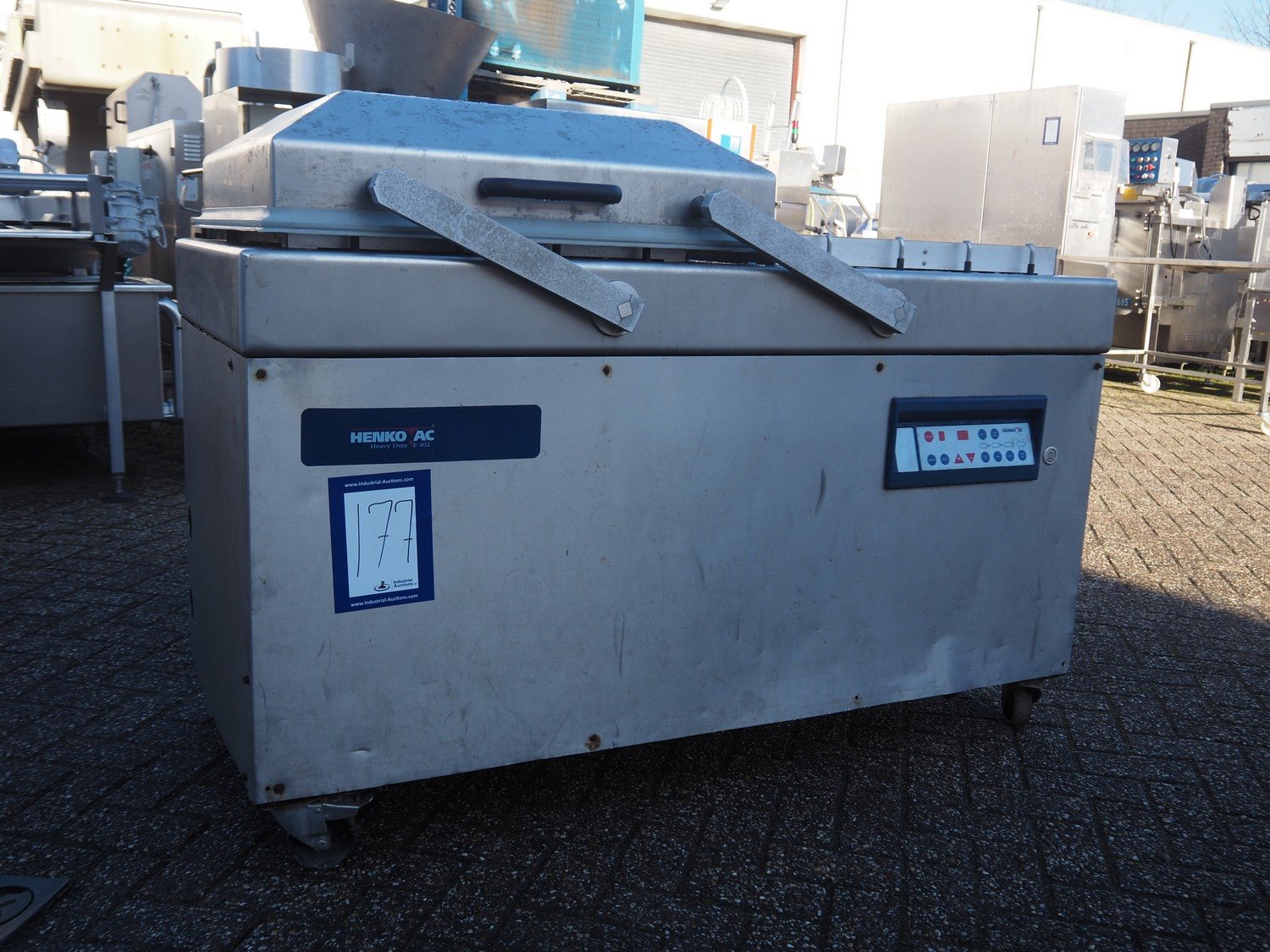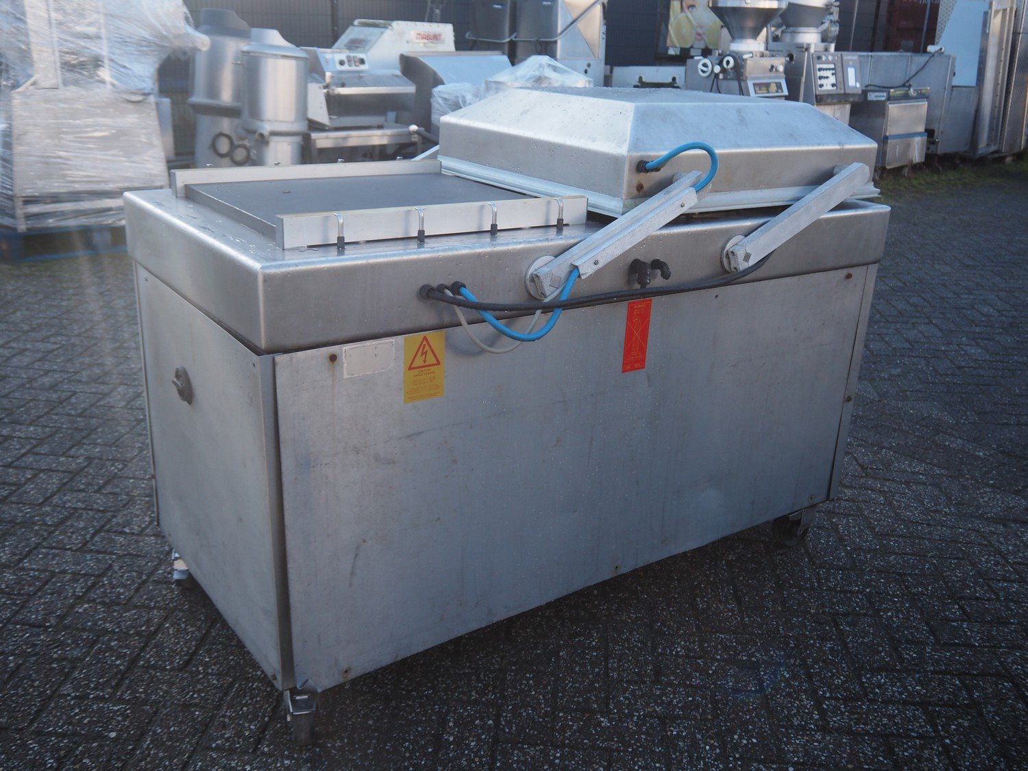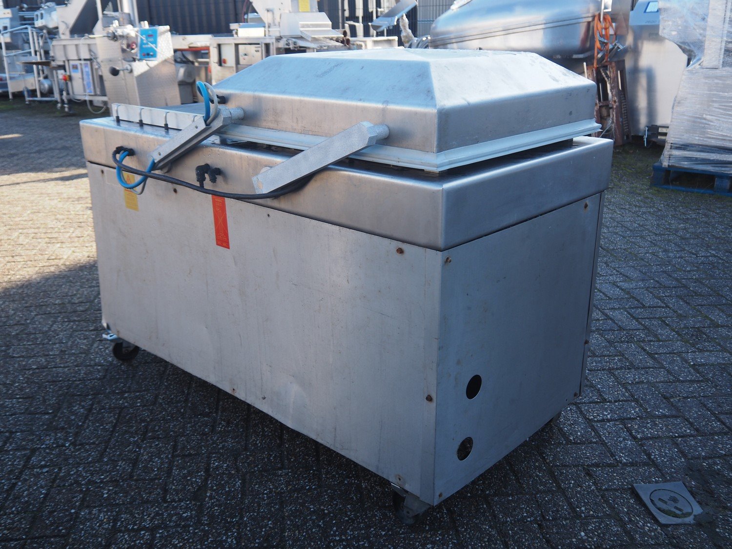 Henkovac mobile double chamber vacuum machine, seal length: (4x) 620 mm, chamber dimensions: (2x) 520 mm x 600 mmm, vacuum pump, total dimensions: 1600 mm x 870 mm x 1150 mm. Kavel locatie: Denariusstraat 20, 4903 RC Oosterhout, Nederland