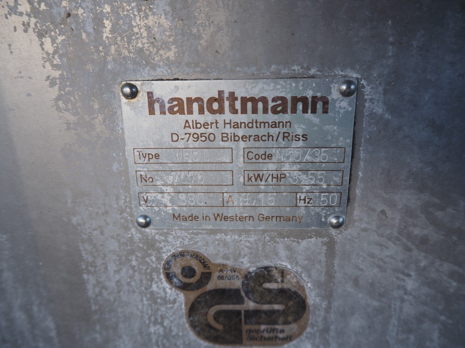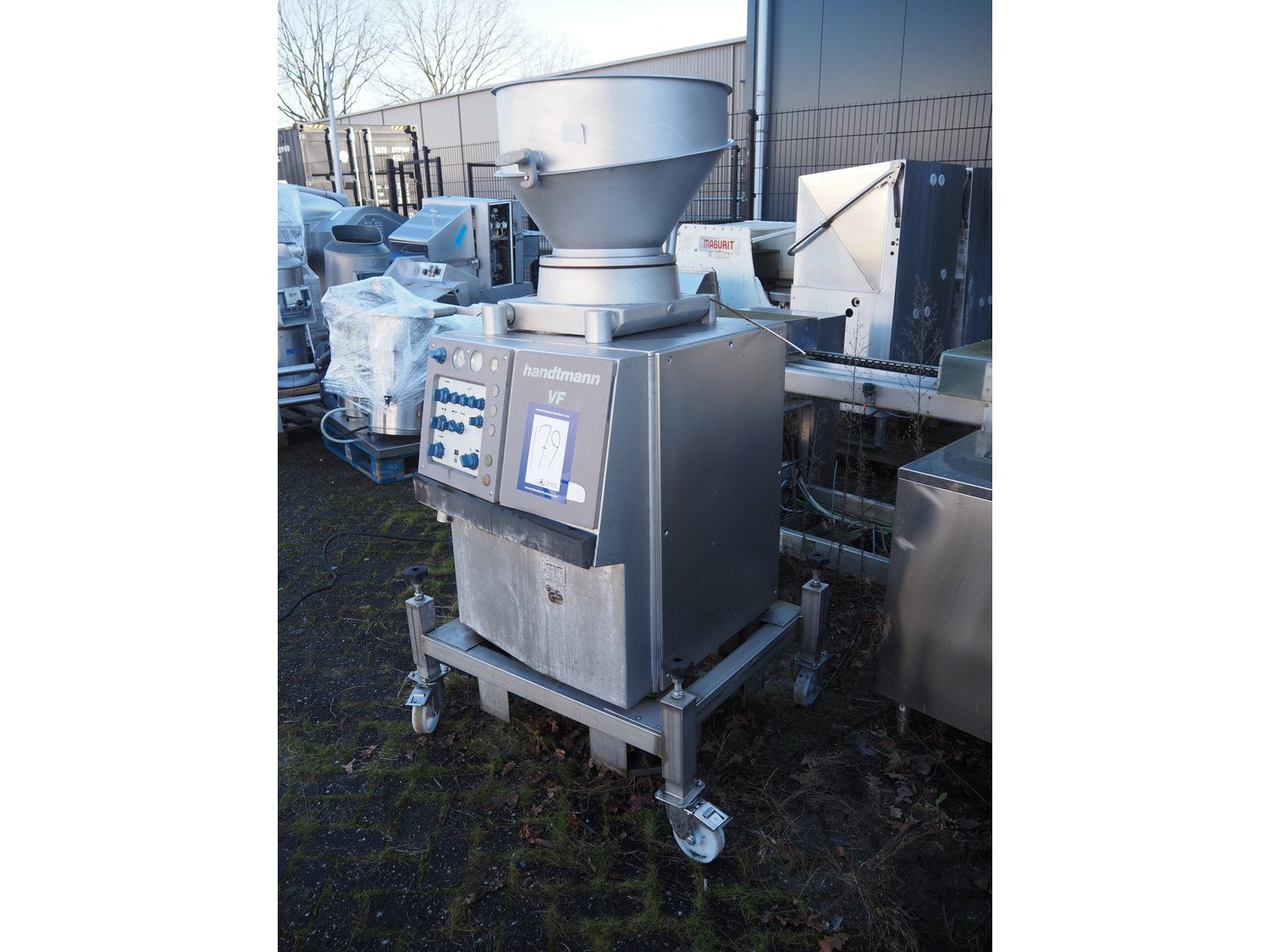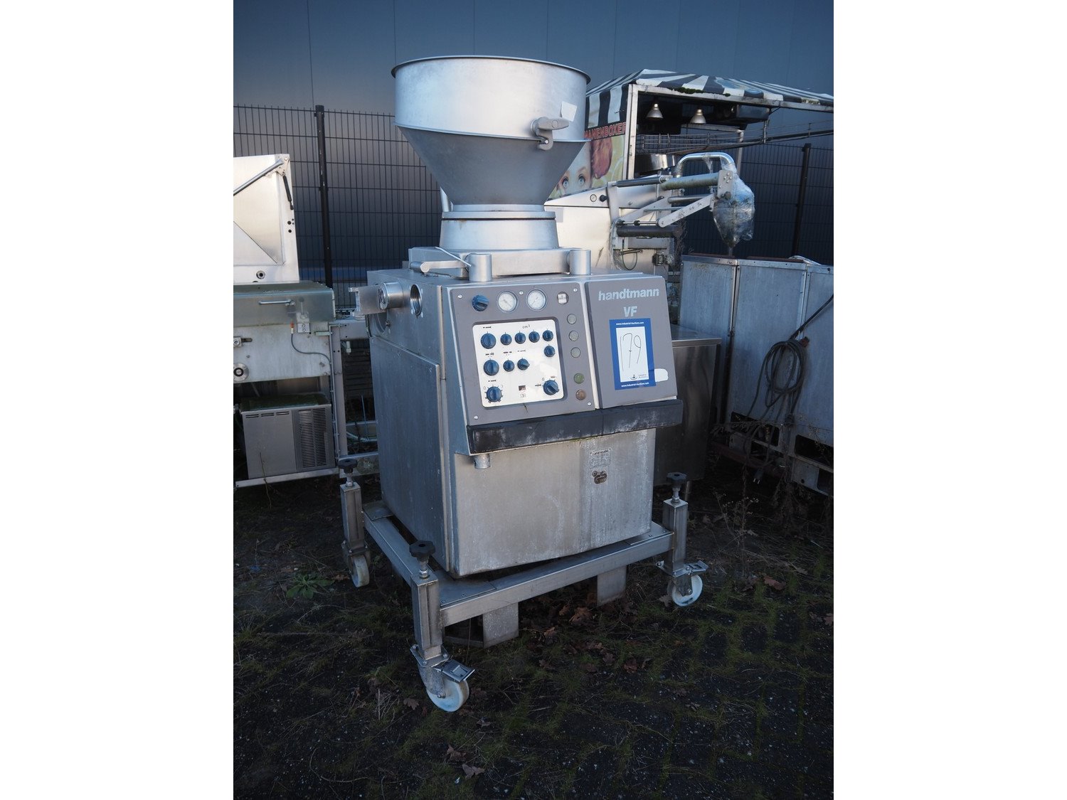 Handtmann vacuum filling machine om mobile frame, type: VF80, number: 1070, 380 V, 50 Hz, 9.15 A, 3.55 kW, vacuum pump, dimensions: 1050 mm x 880 mm x 1670 mm. Incomplete, without rotor and vanes. Kavel locatie: Denariusstraat 20, 4903 RC Oosterhout, Nederland