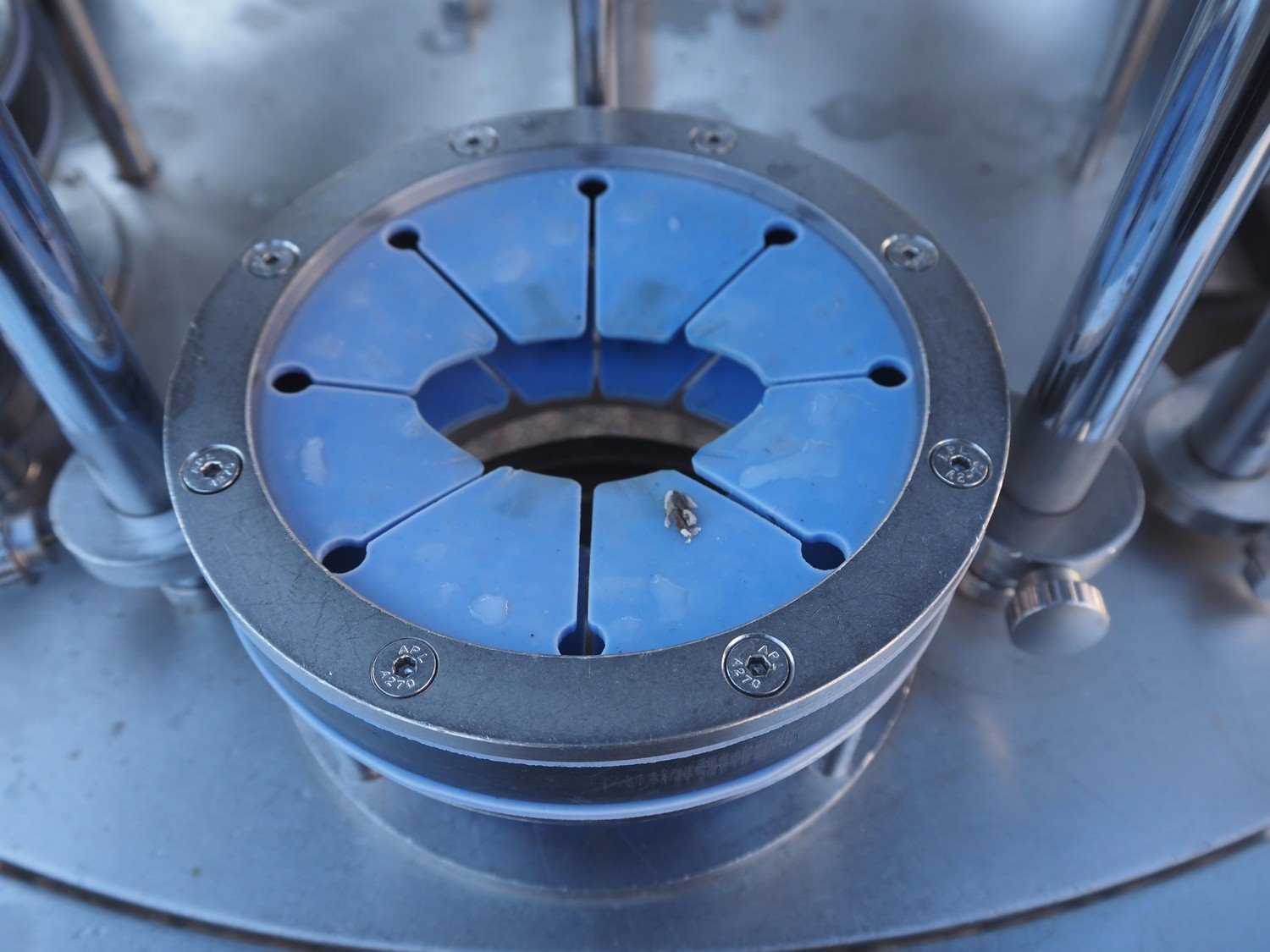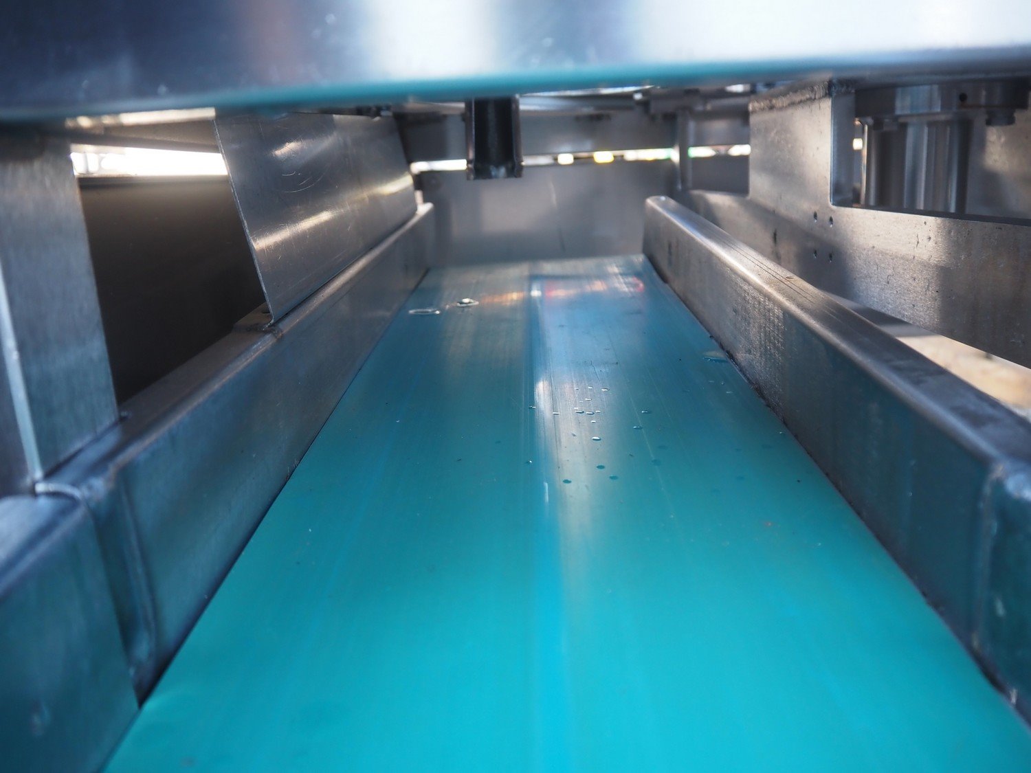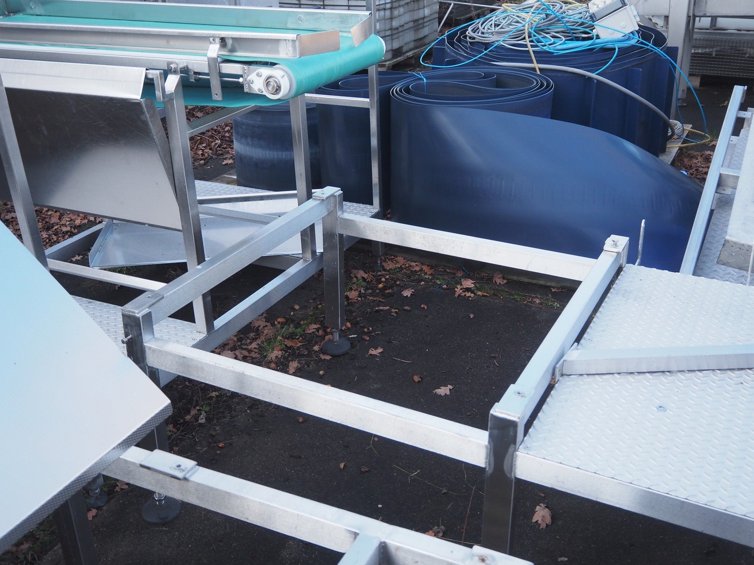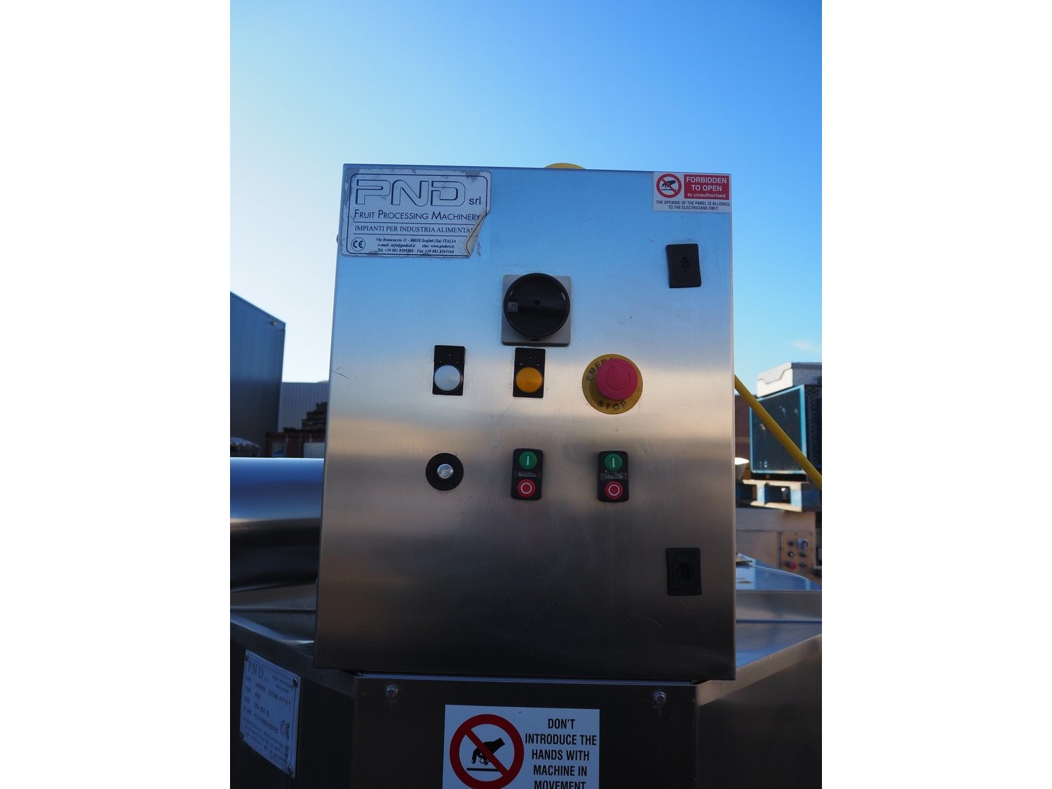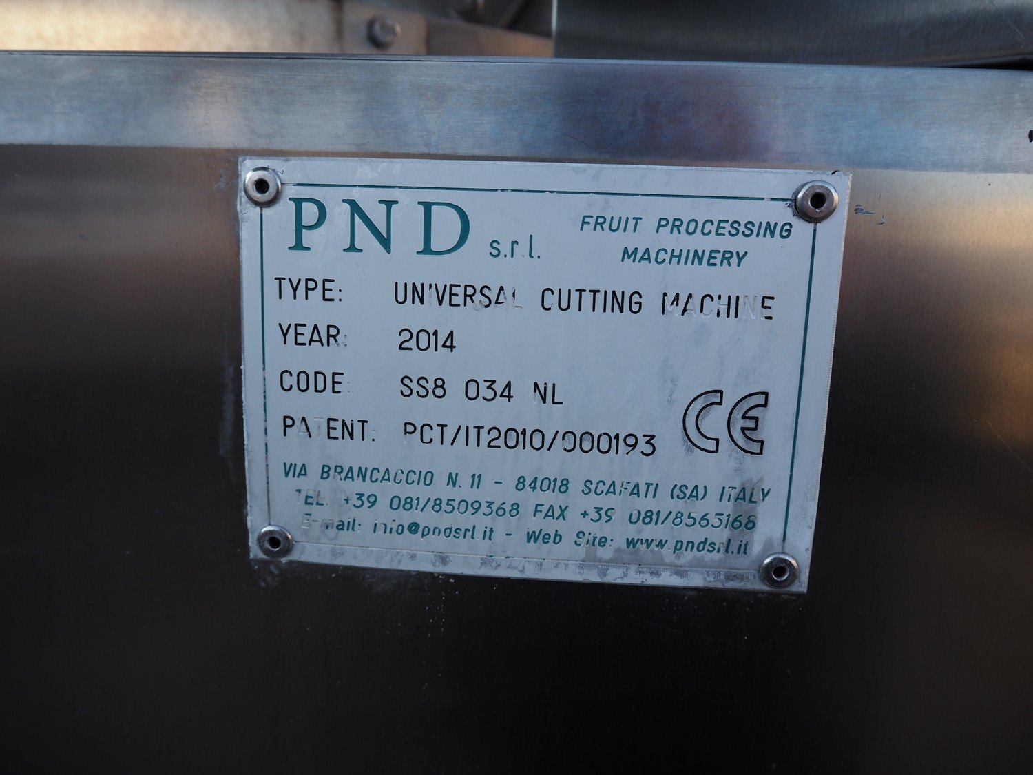 PND s.r.l. fruit slicer, type: universal cutting machine, year of construction: 2014, clearance: Ø 125 mm, plastic belt, belt width: 220 mm, total dimensions: 3100 mm x 1450 mm x 1960 mm. Including platform, dimensions: 2060 mm x 1500 mm x 1420 mm. Kavel locatie: Denariusstraat 20, 4903 RC Oosterhout, Nederland