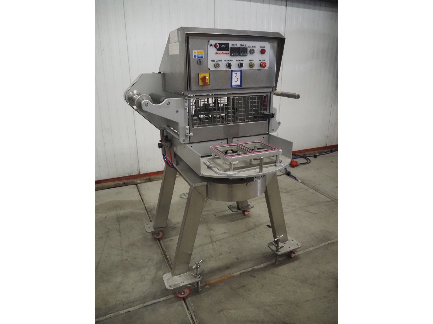 Proseal mobile traysealer, model: Revolution, serial number: PR30-1005, 240 V, 50 Hz, dimensions dye: (x2) 170 mm x 130 mm, film width: 320 mm, total dimensions: 1100 mm x 1100 mm x 1680 mm. Kavel locatie: Bedrijfsweg 7, 8304 AA Emmeloord, Nederland