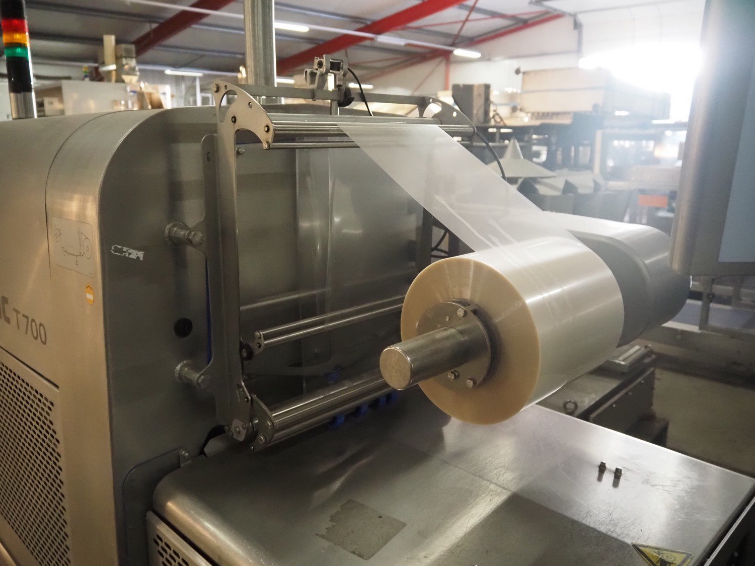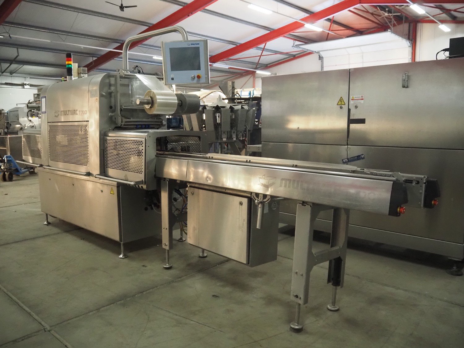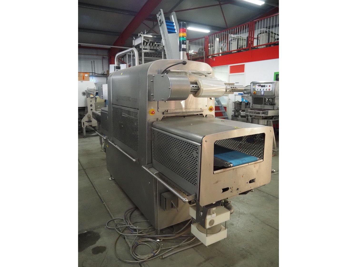 Multivac traysealer, type: T700, serial number: 269525, year of construction: 2018, 400/230 V, 3 Ph, 50 Hz, 26.4 A, 8.2 kW, operating hours: 10862, chain infeed belt, belt width: 185 mm, dye: (3x) Ø 120 mm, plastic outfeed belt, belt width: 245 mm, film width: 225 mm, total dimensions: 4900 mm x 1040 mm x 2050 mm. Without vacuum pump. Kavel locatie: Bedrijfsweg 7, 8304 AA Emmeloord, Nederland