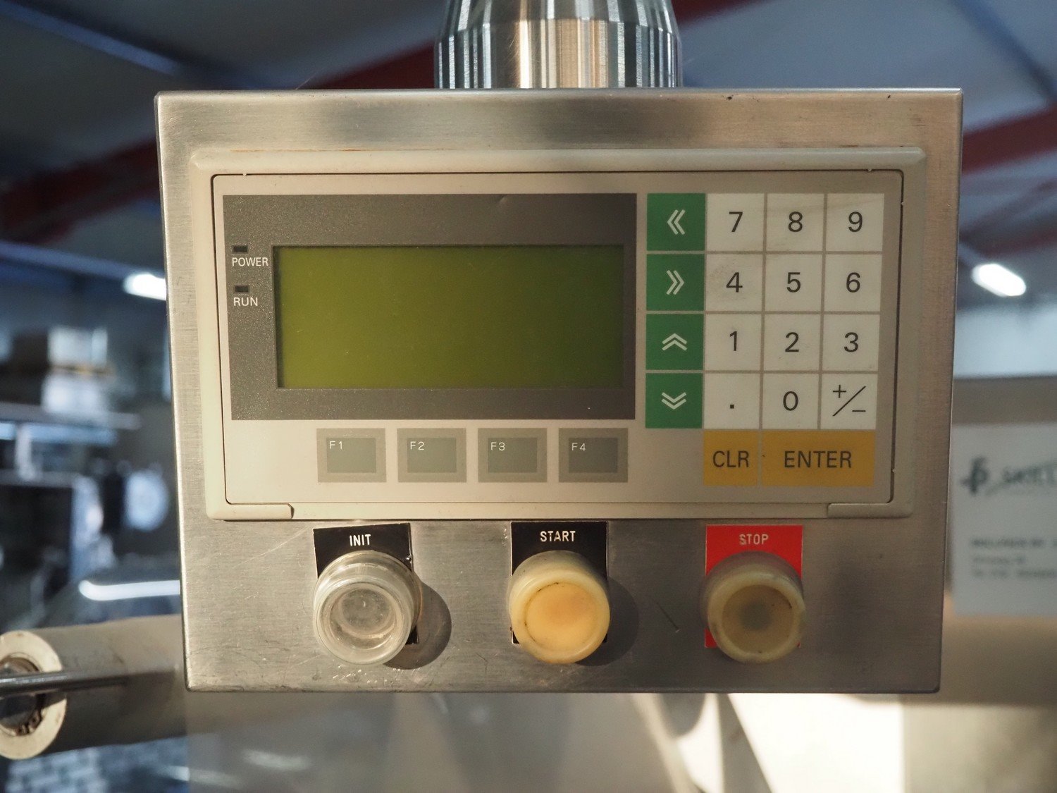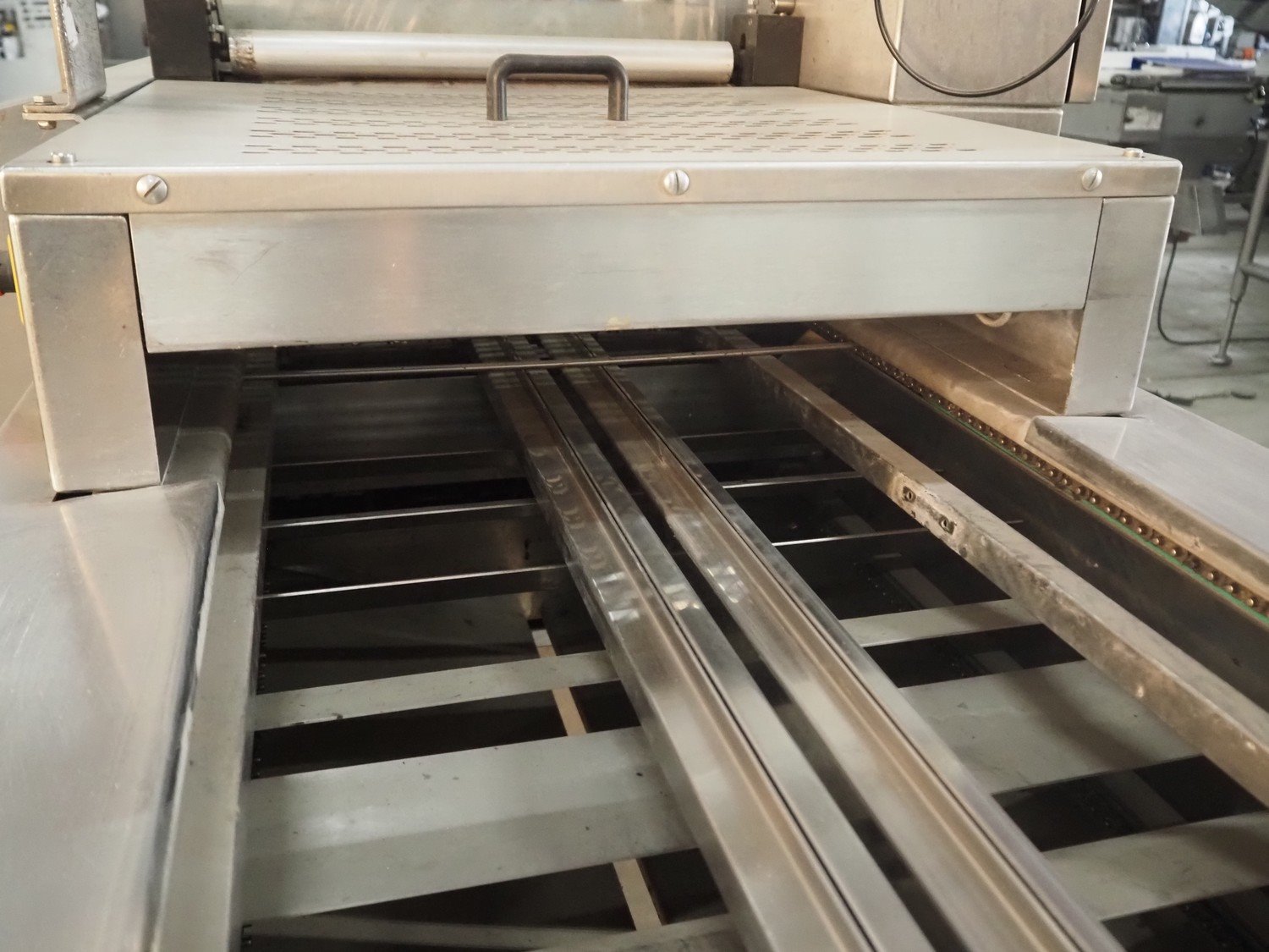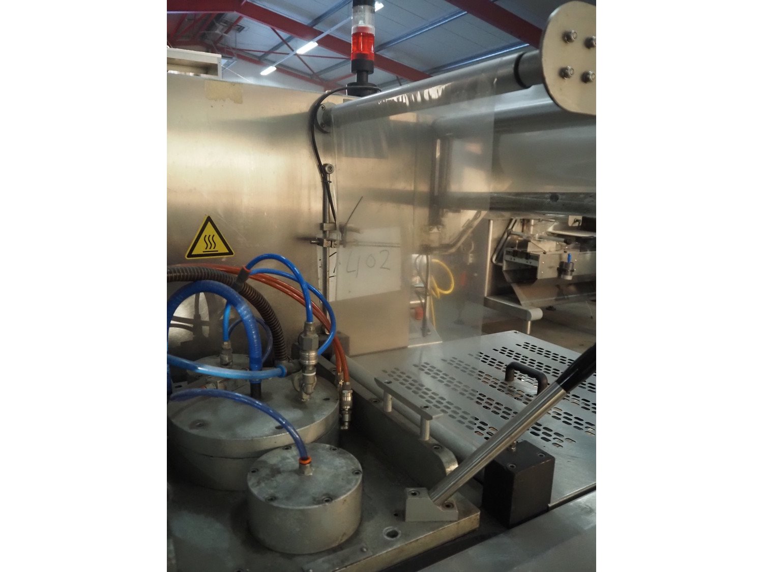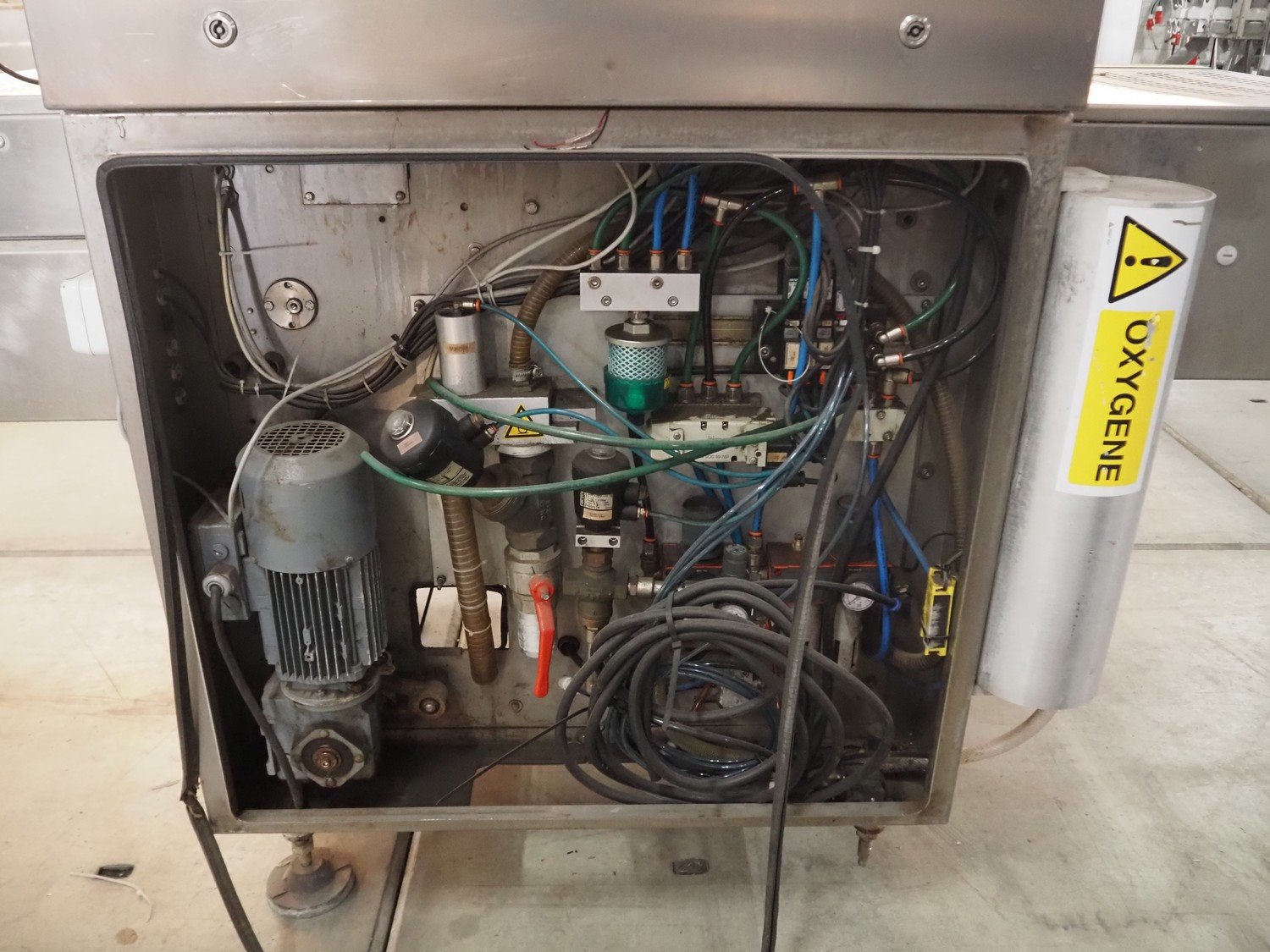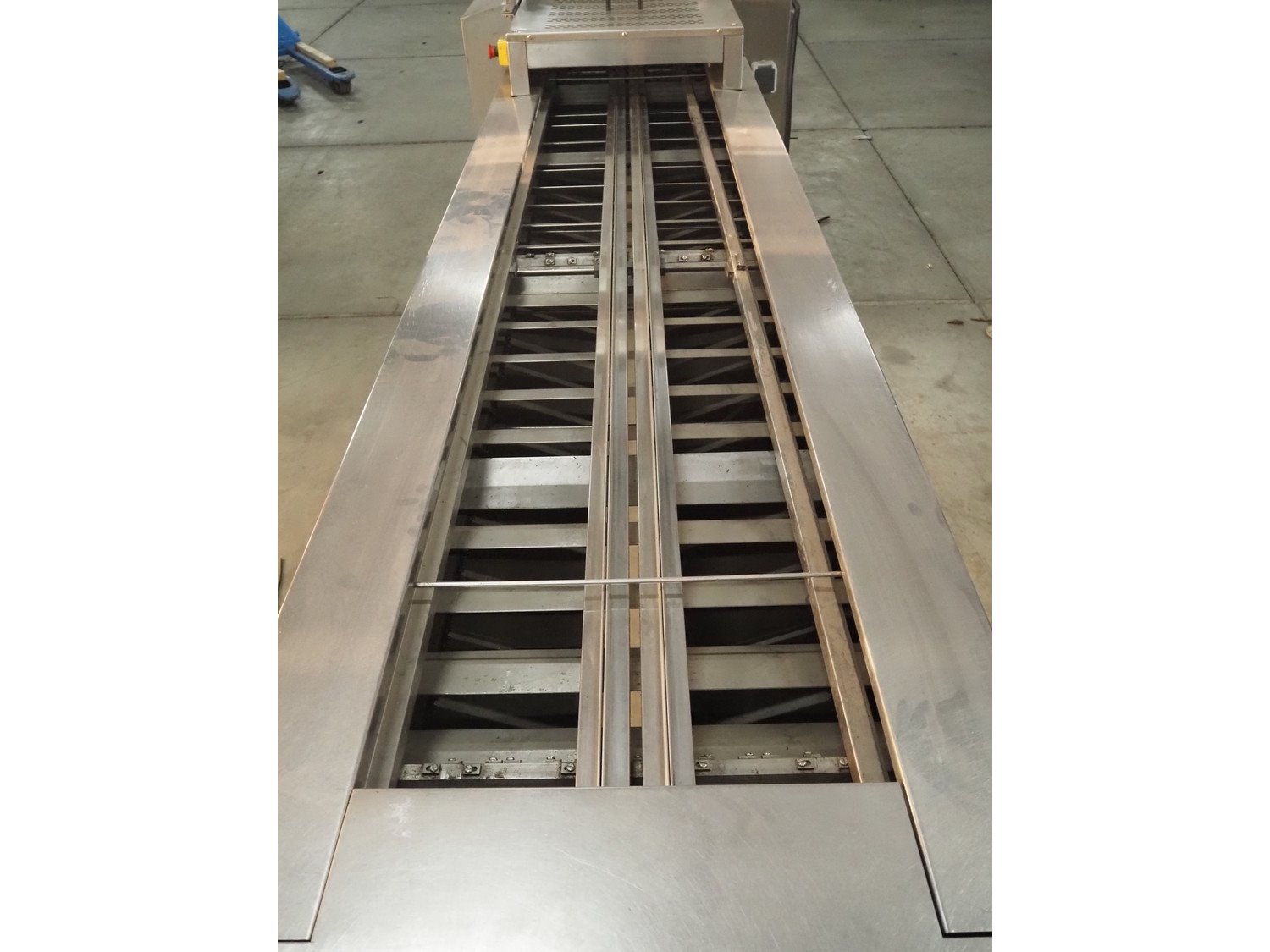 Meca Plastic traysealer, type: Meca2003, number: 5433, year of construction: 03.03, chain infeed conveyor with dividers, belt width: 450 mm, distance between dividers: 380 mm, divider height: 20 mm, film width: 450 mm, dimensions dye: (2x) 285 mm x 185 mm, total dimensions: 4080 mm x 1050 mm x 1950 mm. Incomplete, missing outfeed belt and cover. Kavel locatie: Bedrijfsweg 7, 8304 AA Emmeloord, Nederland
