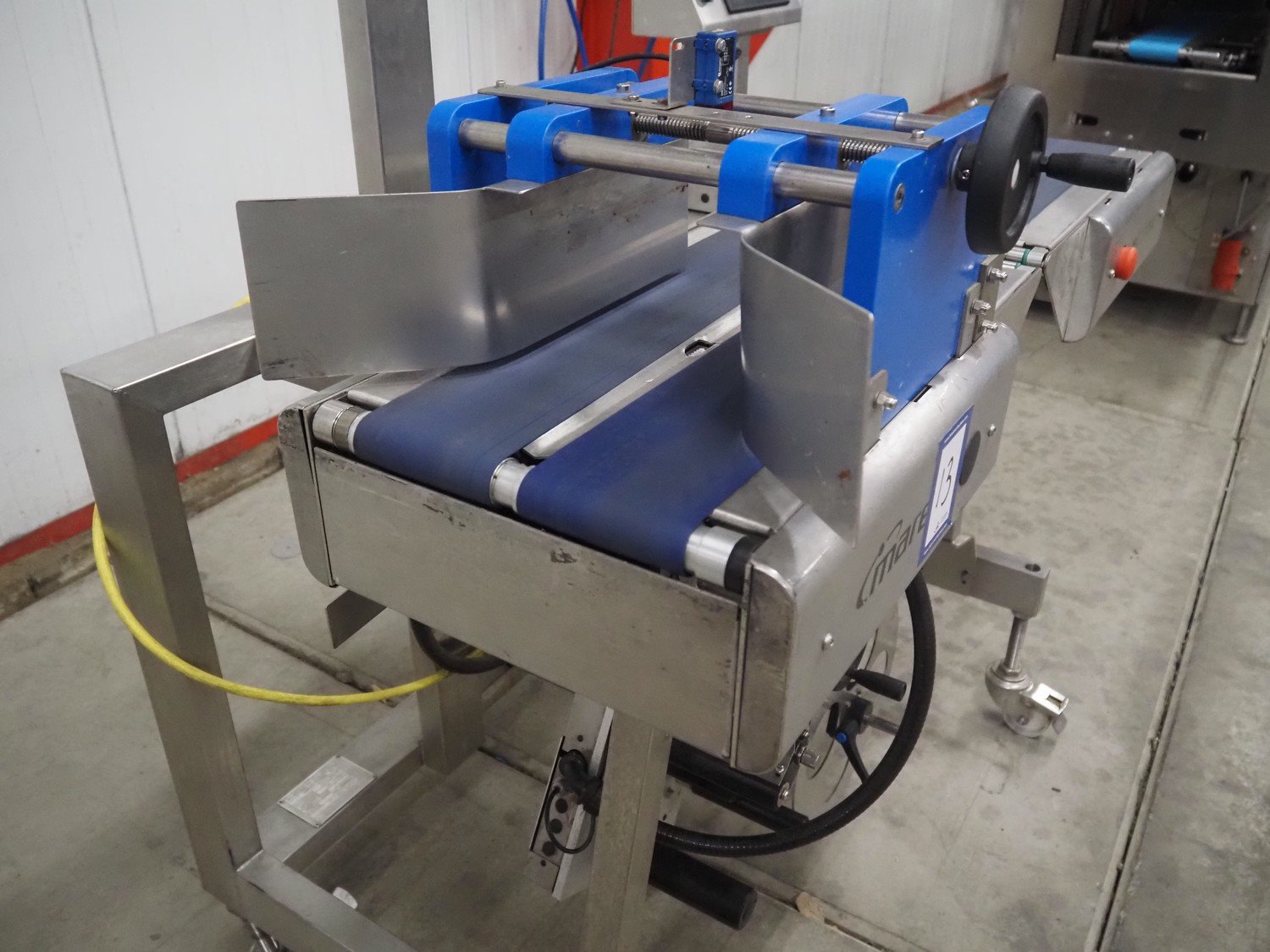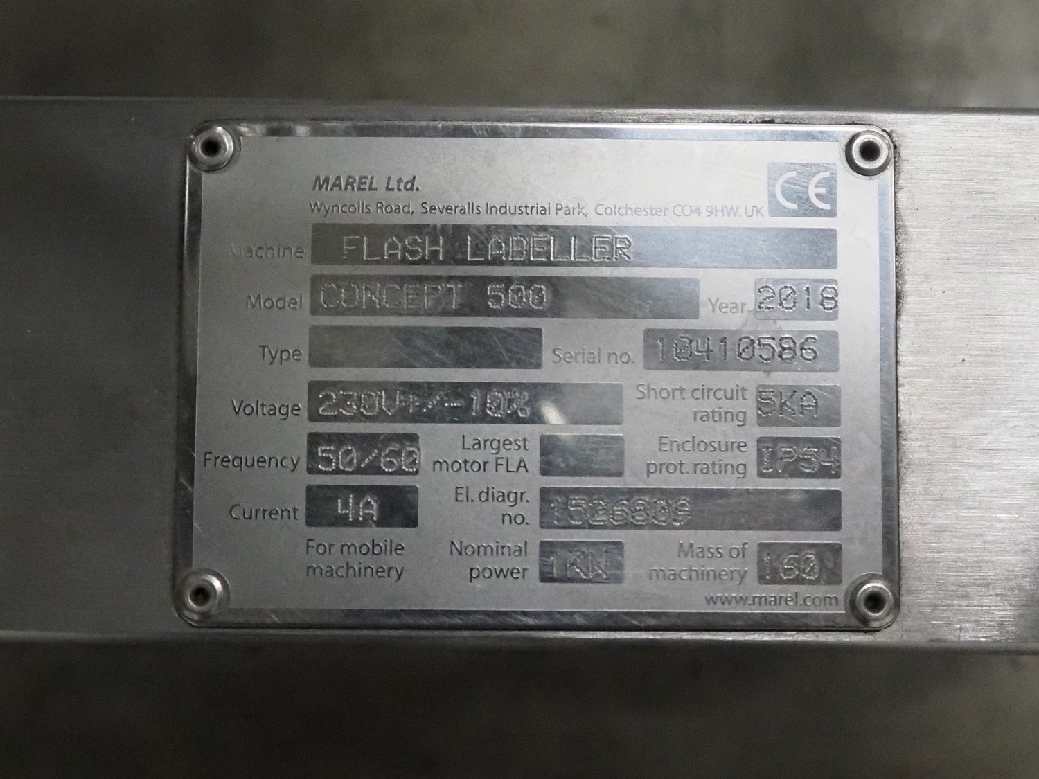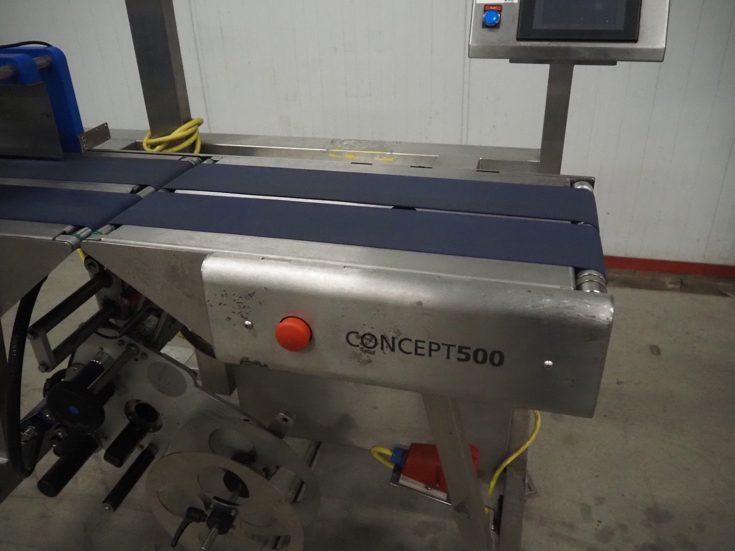 Marel bottom labelling machine, model: Concept 500, serial number: 10410586, year of construction: 2018, 230 V, 50/60 Hz, 4 A, plastic belts, belt width: (4x) 110 mm, total dimensions: 1300 mm x 780 mm x 1260 mm. Kavel locatie: Bedrijfsweg 7, 8304 AA Emmeloord, Nederland