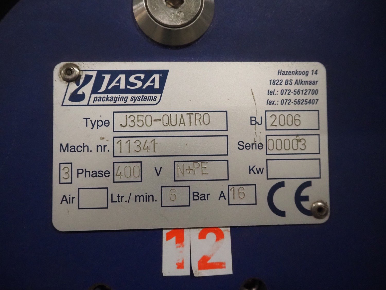 Jasa Packaging Systems vertical form- fill- and seal machine, type: J350-QUATRO, machine number: 11341, year of construction: 2006, 400 V, 3 Ph, 16 A, funnel dimensions: 115 mm x 100 mm, vertical seal length: 360 mm, horizontal seal length: 280 mm, Markem-Imaje SmartDate X60 inkjet printer, total dimensions: 2050 mm x 1050 mm x 2100 mm. Kavel locatie: Bedrijfsweg 7, 8304 AA Emmeloord, Nederland