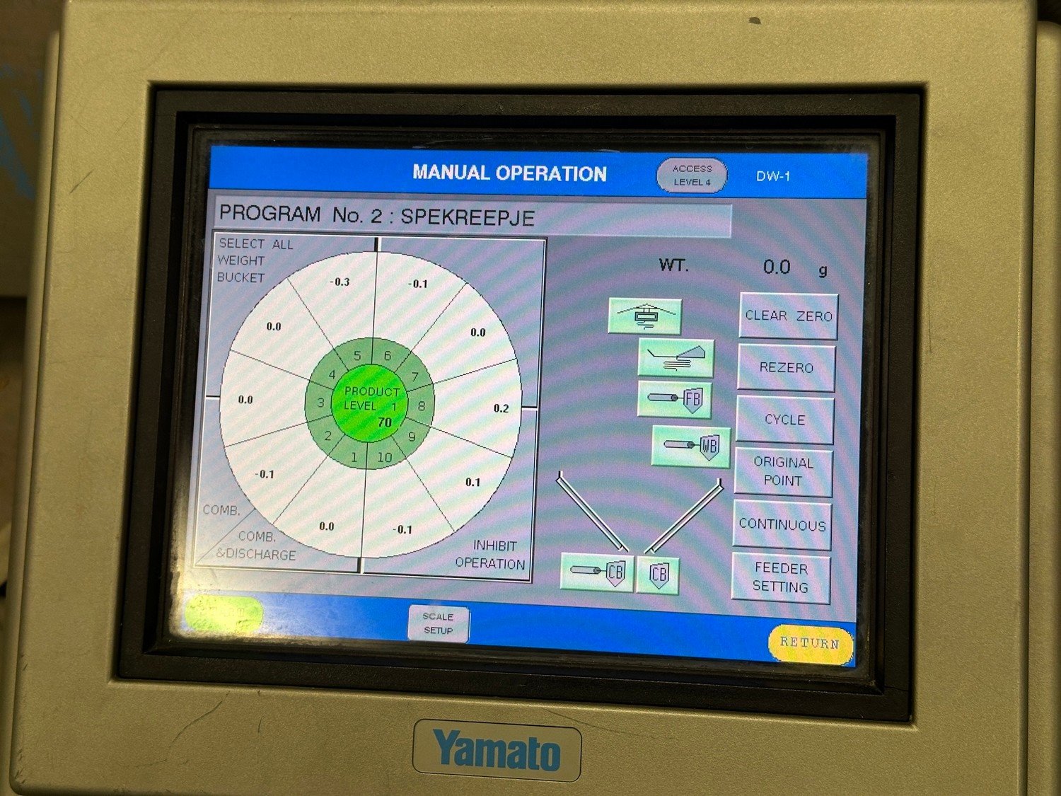Yamato 10-heads multihead weigher, model: ADW-410SV, serial number: WG060924, 200-240 V, 1 Ph, 50/60 Hz, 5 A, weighing range: 8 g - 1000 g, dimensions: 1000 mm x 1000 mm x 1600 mm. Kavel locatie: Bedrijfsweg 7, 8304 AA Emmeloord, Nederland