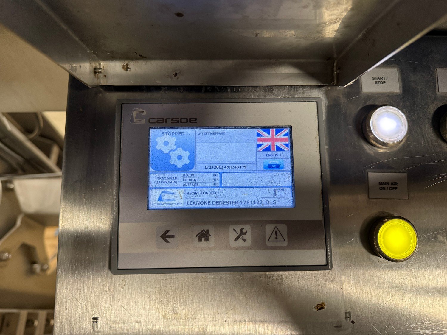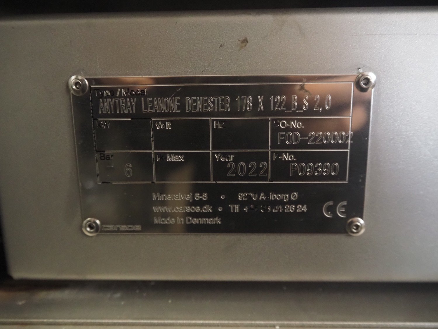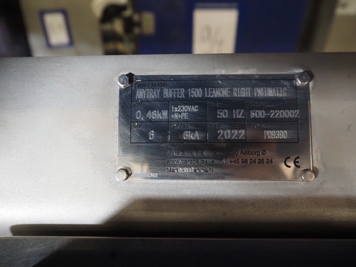 Carsoe tray denester, type/model: ANYTRAY BUFFER 1500 LEANONE RIGHT PNEUMATIC, year of construction: 2022, 230 V, 1 Ph, 50 Hz, 0.46 kW, plastic belt, belt width: 270 mm, Carsoe tray dispenser, type/model: ANYTRAY LEANONE DENESTER 178 x 122 B S 2.0, year of construction: 2022, total dimensions: 1900 mm x 700 mm x 1700 mm. Kavel locatie: Bedrijfsweg 7, 8304 AA Emmeloord, Nederland