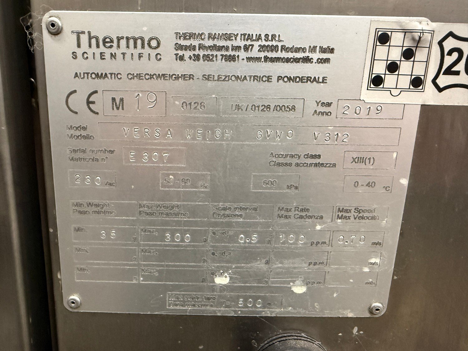 Thermo Scientific checkweigher, model VERSA WEIGH GVW) V312, serial number: E 307, year of construction: 2019, 230 V, 50/60 Hz, minimum weight: 35 gram, maximum weight: 300 gram, e=d= 0.5 gram, total dimensions: 1150 mm x 920 mm x 1550 mm. Without transport belt. Kavel locatie: Bedrijfsweg 7, 8304 AA Emmeloord, Nederland