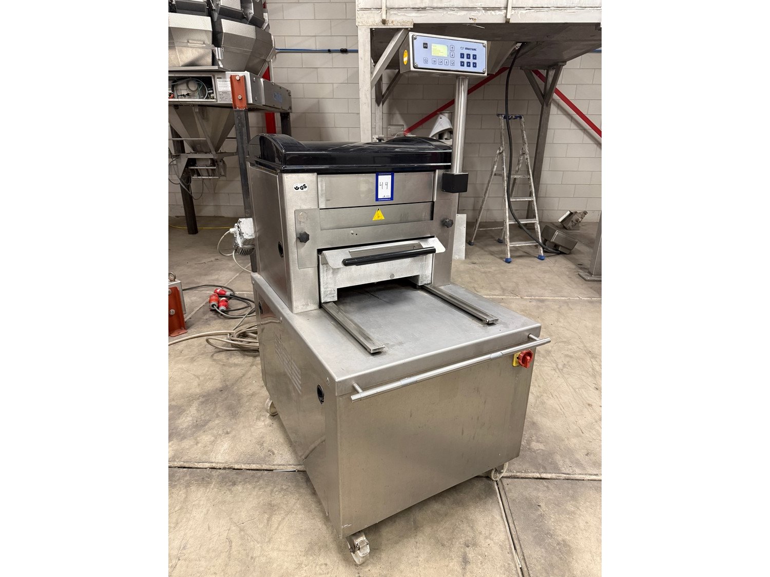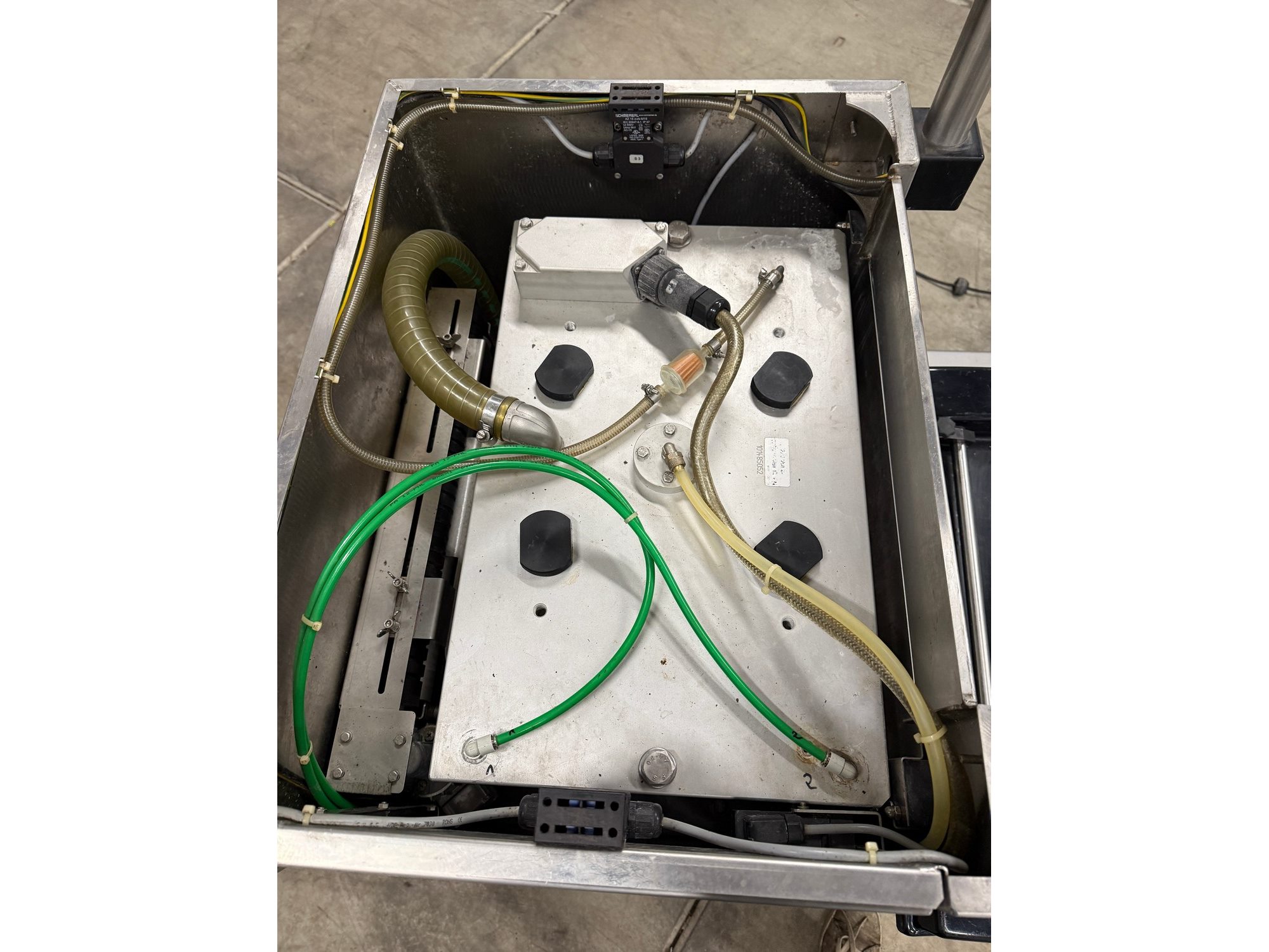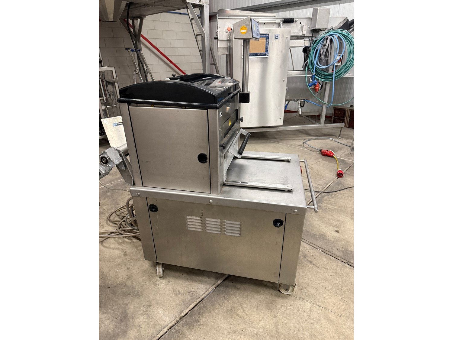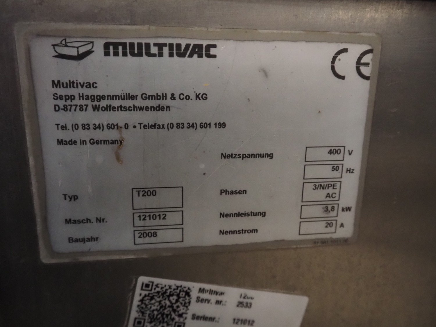 Multivac mobile traysealer, type: T200, machine number: 121012, year of construction: 2008, 400 V, 3 Ph, 50 Hz, 20 A, 3.8 kW, dimensions dye: (2x) 240 mm x 140 mm, total dimensions: 1350 mm x 750 mm x 1600 mm. Kavel locatie: Bedrijfsweg 7, 8304 AA Emmeloord, Nederland