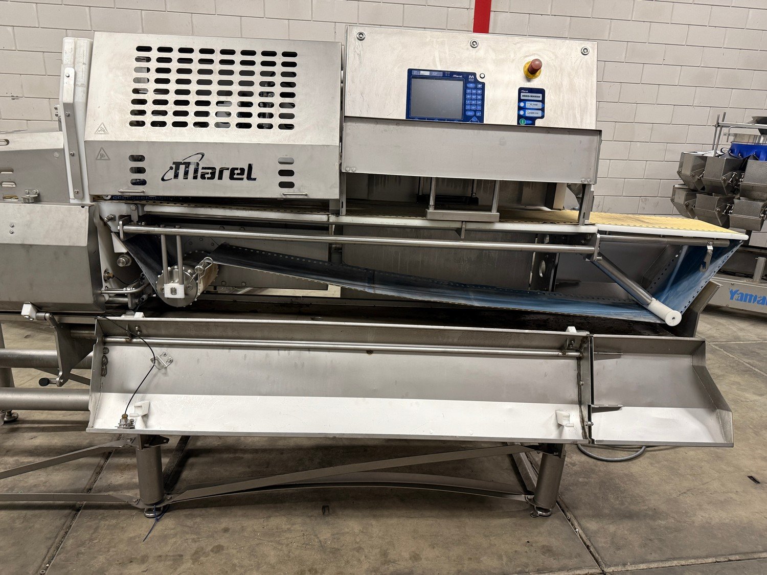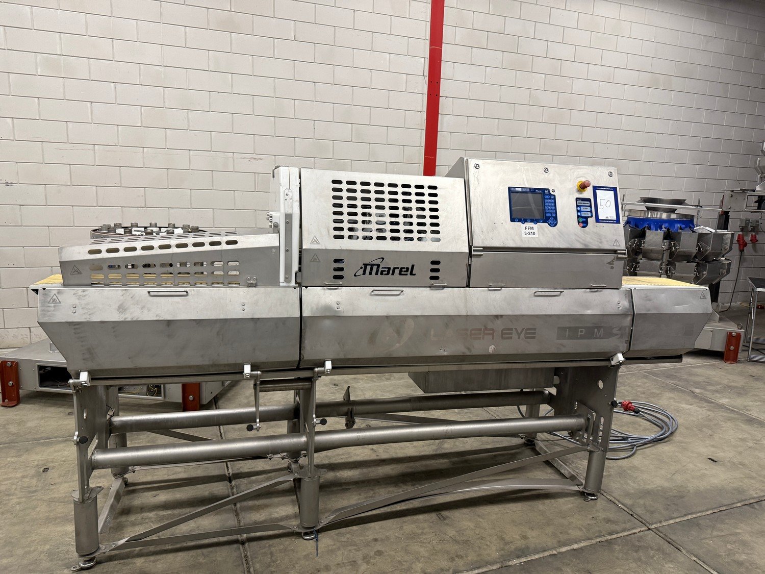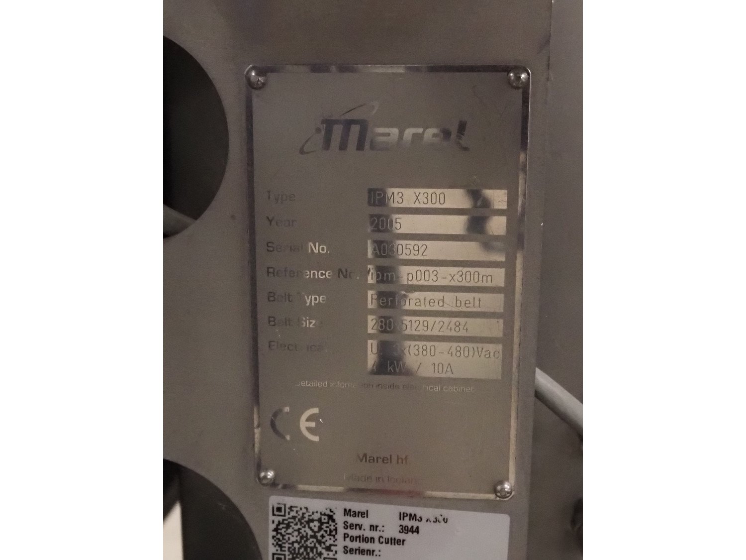 Marel optical portion cutter, type: IPM3 X300, serial number: A030592, year of construction: 2005, 380-480 V, 3 Ph, 10 A, 4 kW, plastic belt, belt width: 280 mm, total dimensions: 3300 mm x 950 mm x 1900 mm. Kavel locatie: Bedrijfsweg 7, 8304 AA Emmeloord, Nederland