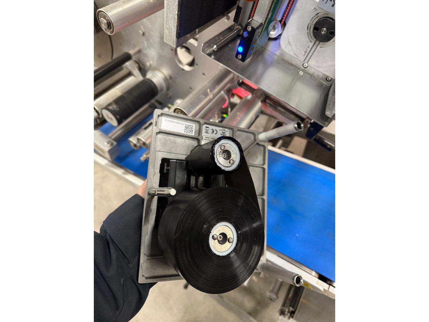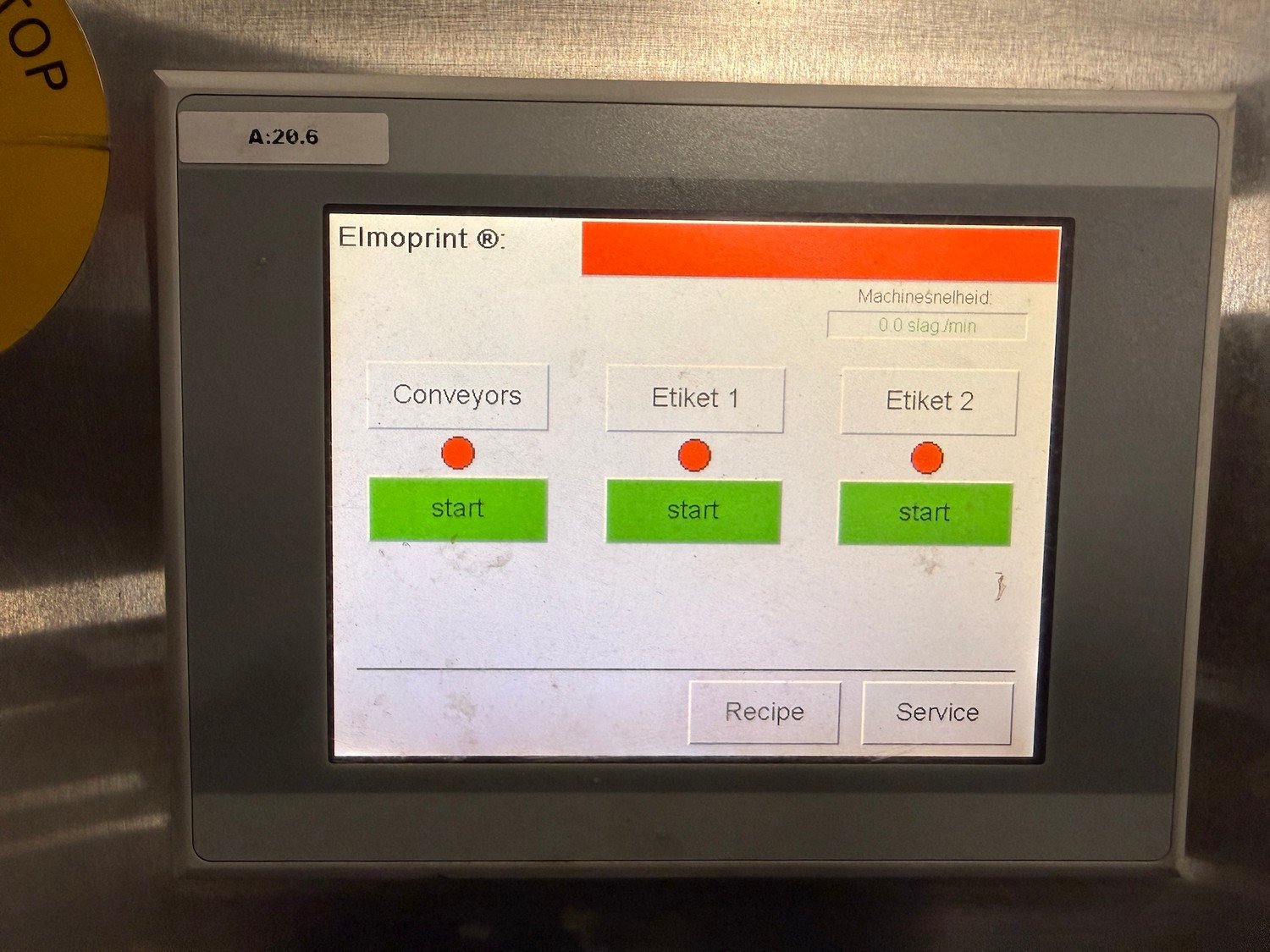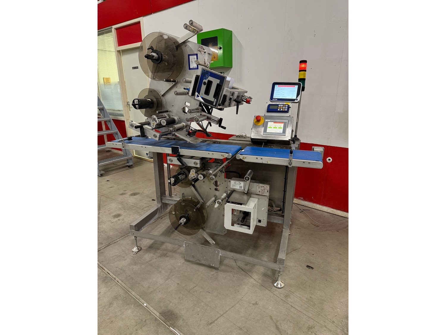 Falcon labelling machine with top and bottom labeller, plastic belt, belt width: 240 mm, total dimensions: 1600 mm x 800 mm x 1750 mm. Kavel locatie: Bedrijfsweg 7, 8304 AA Emmeloord, Nederland