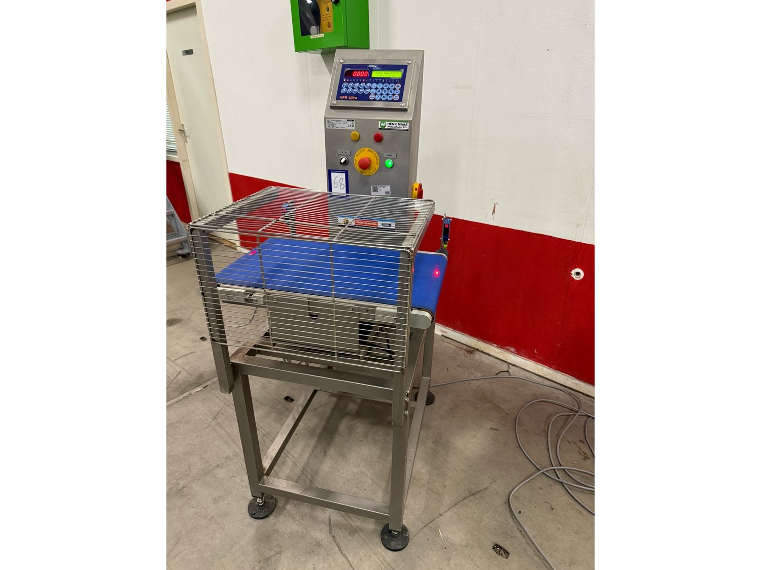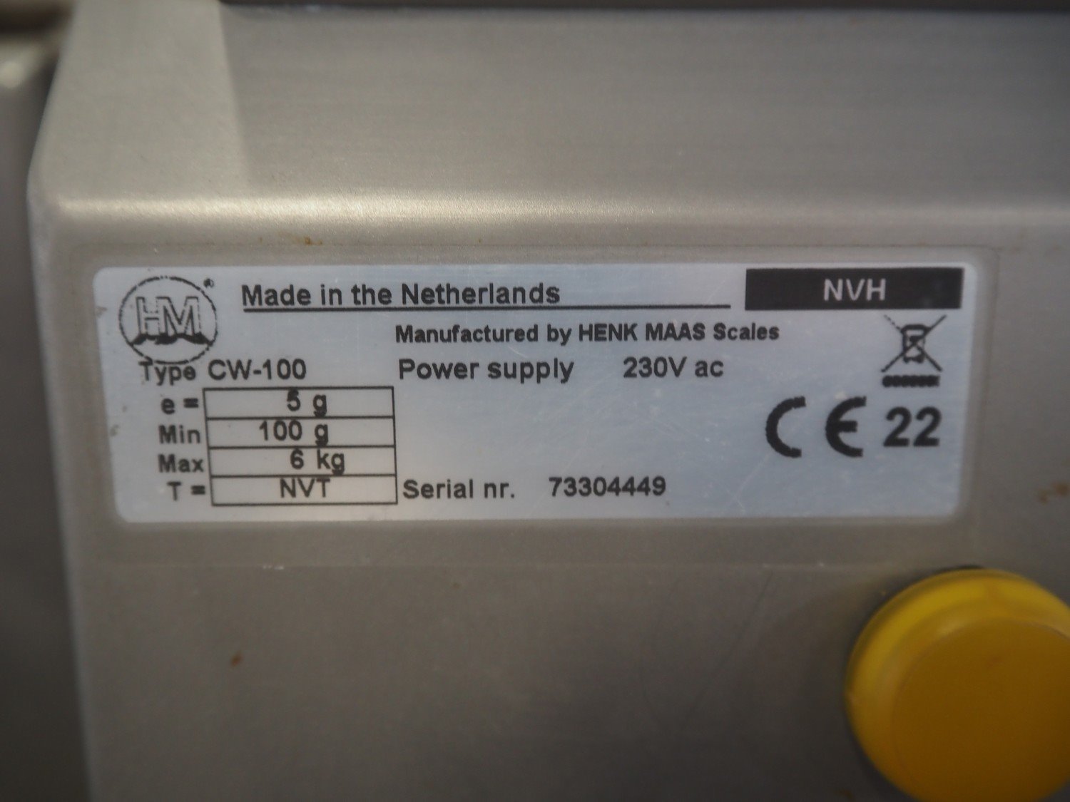 HENK MAAS Scales checkweigher, type: CW-100, serial number: 73304449, 230 V, maximum: 6 kg, minimum: 100 gram, e - 5 gram, total dimensions: 820 mm x 650 mm x 1510 mm. Kavel locatie: Bedrijfsweg 7, 8304 AA Emmeloord, Nederland