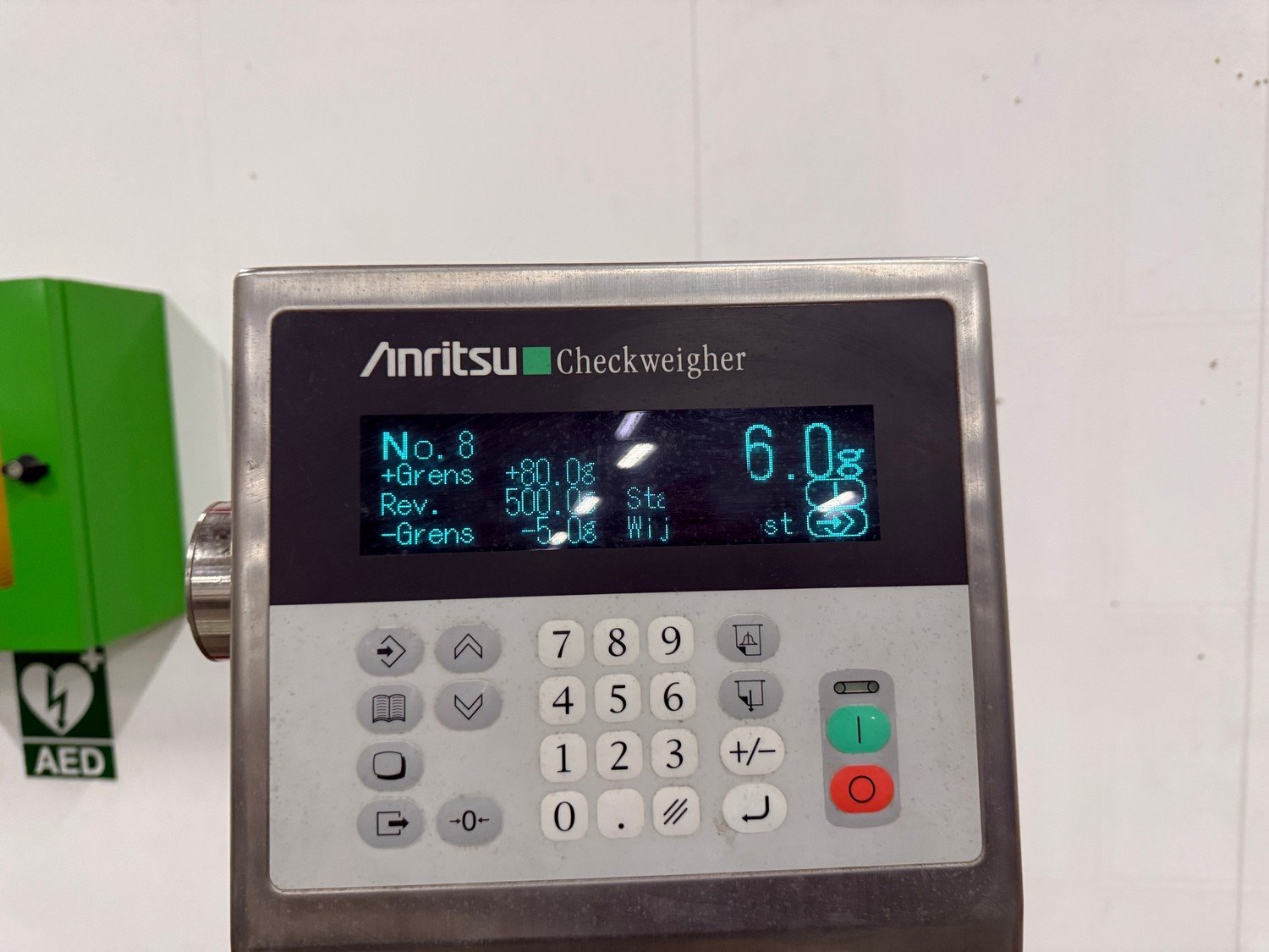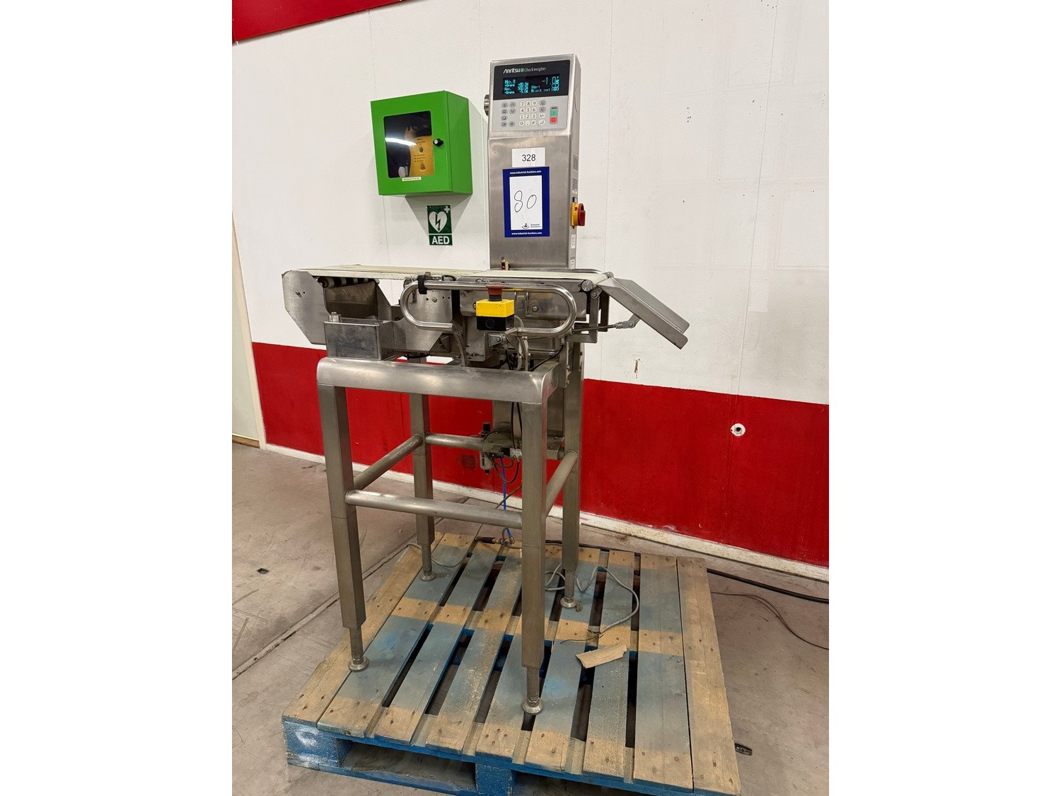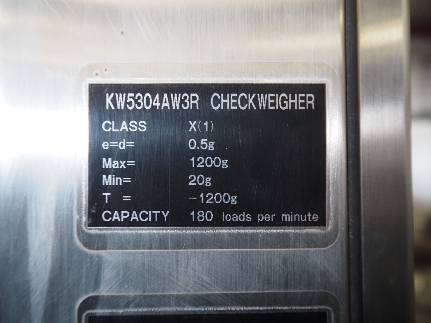 Anritsu checkweigher, type: KW5304AW3R, serial number: K119048, year of construction: 1999, 100-120/200-240 V, 50/60 Hz, 480 VA, maximum weight: 1200 g, minimum weight: 20 g, e=d= 0.5 g, T=-1200 g, plastic belt, belt width: 220 mm, total dimensions: 900 mm x 700 mm x 1750 mm. Kavel locatie: Bedrijfsweg 7, 8304 AA Emmeloord, Nederland