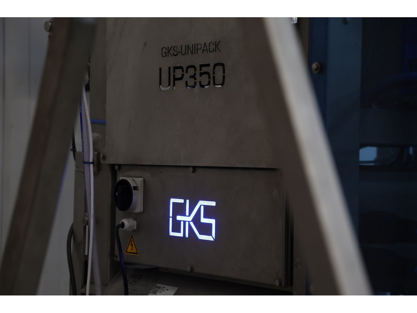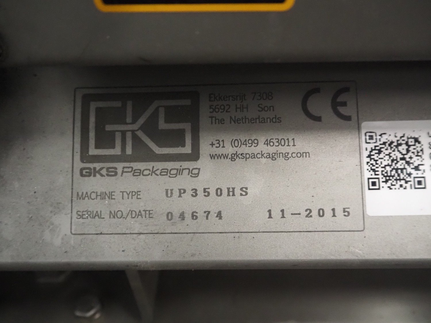 GKS Packaging mobile vertical form- fill- and seal machine, type: UP350HS, serial number: 04674, year of construction: 11-2015, diameter filling pipe: 200 mm, vertical seal length: 480 mm, horizontal seal length: 360 mm, total dimensions: 1550 mm x 930 mm x 2300 mm. Kavel locatie: Bedrijfsweg 7, 8304 AA Emmeloord, Nederland