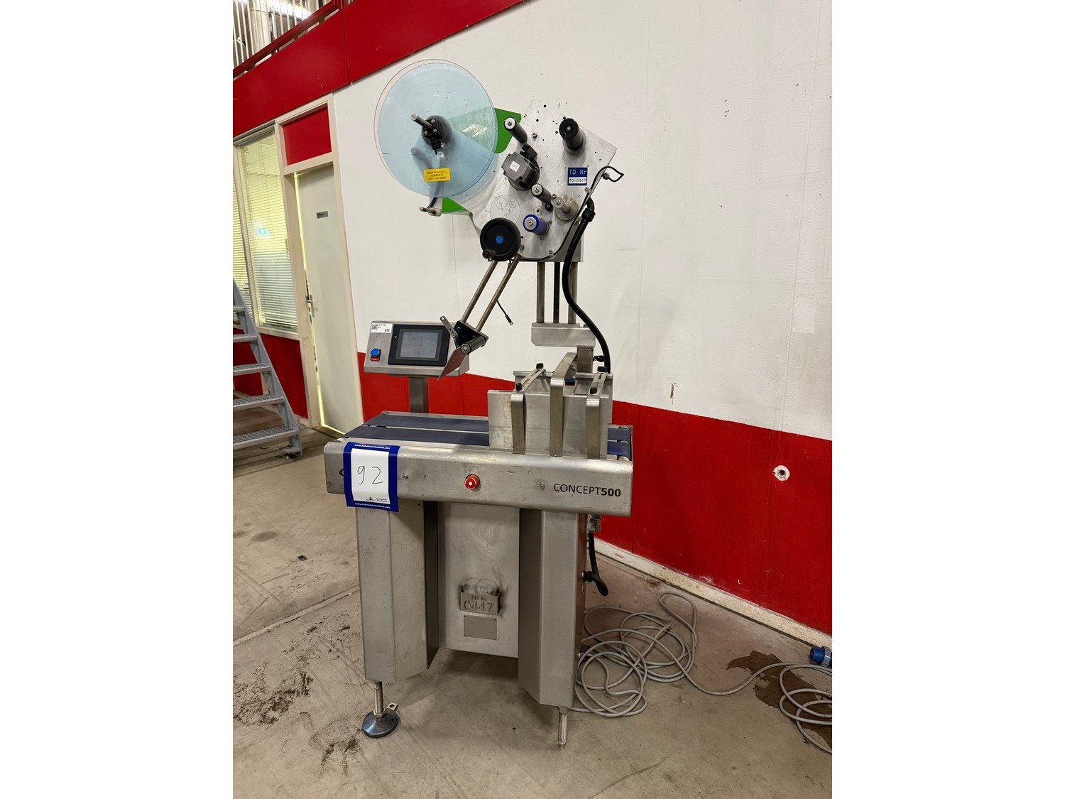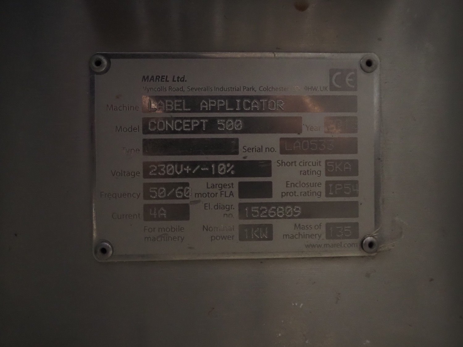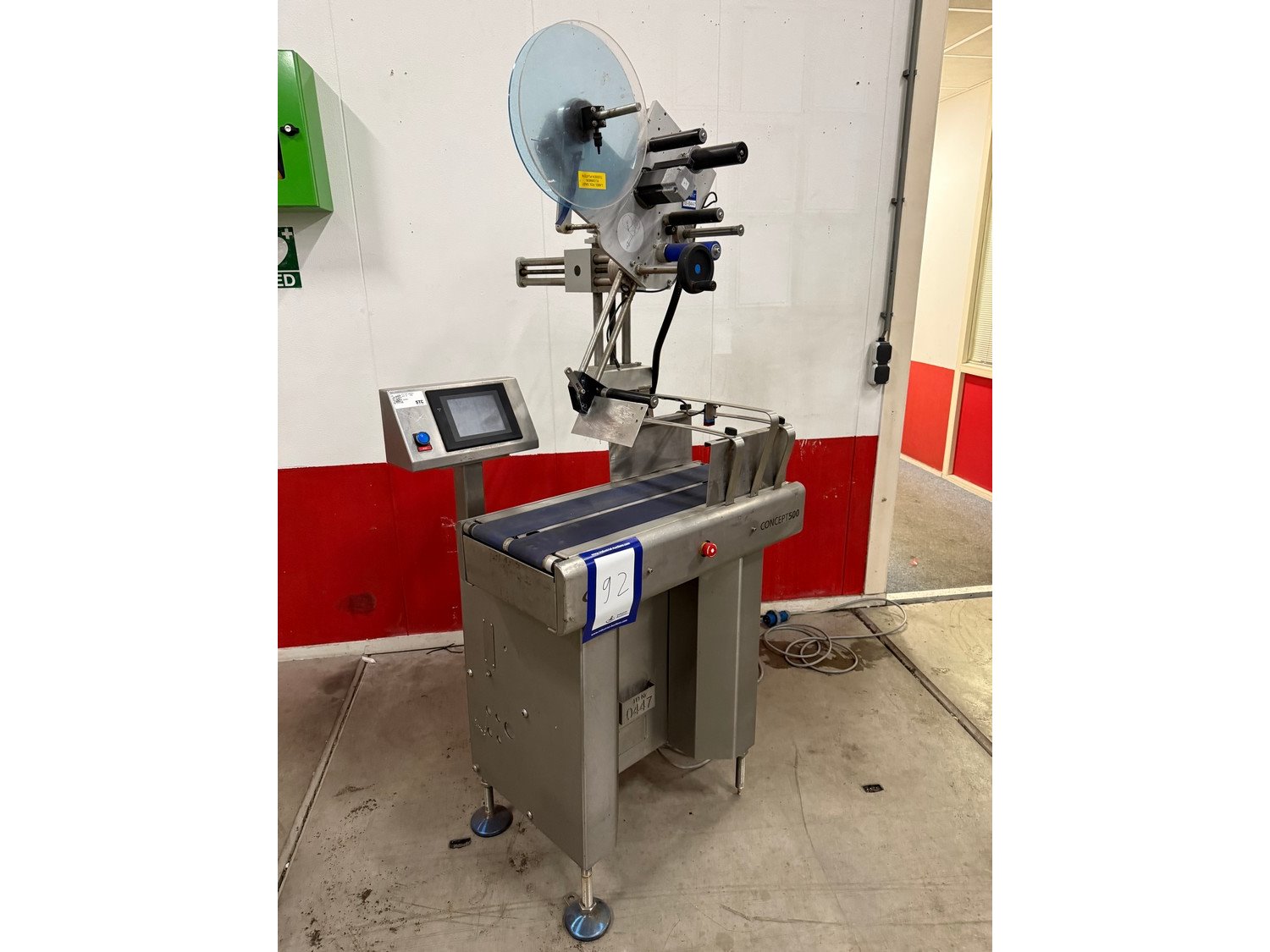 Marel labelling machine, model: CONCEPT 500, serial number: LA0533, year of construction: 2012, 230 V, 50/60 Hz, 4 A, 1 kW, plastic belt, belt width: (2x) 110 mm, total dimensions: 750 mm x 850 mm x 1830 mm. Kavel locatie: Bedrijfsweg 7, 8304 AA Emmeloord, Nederland