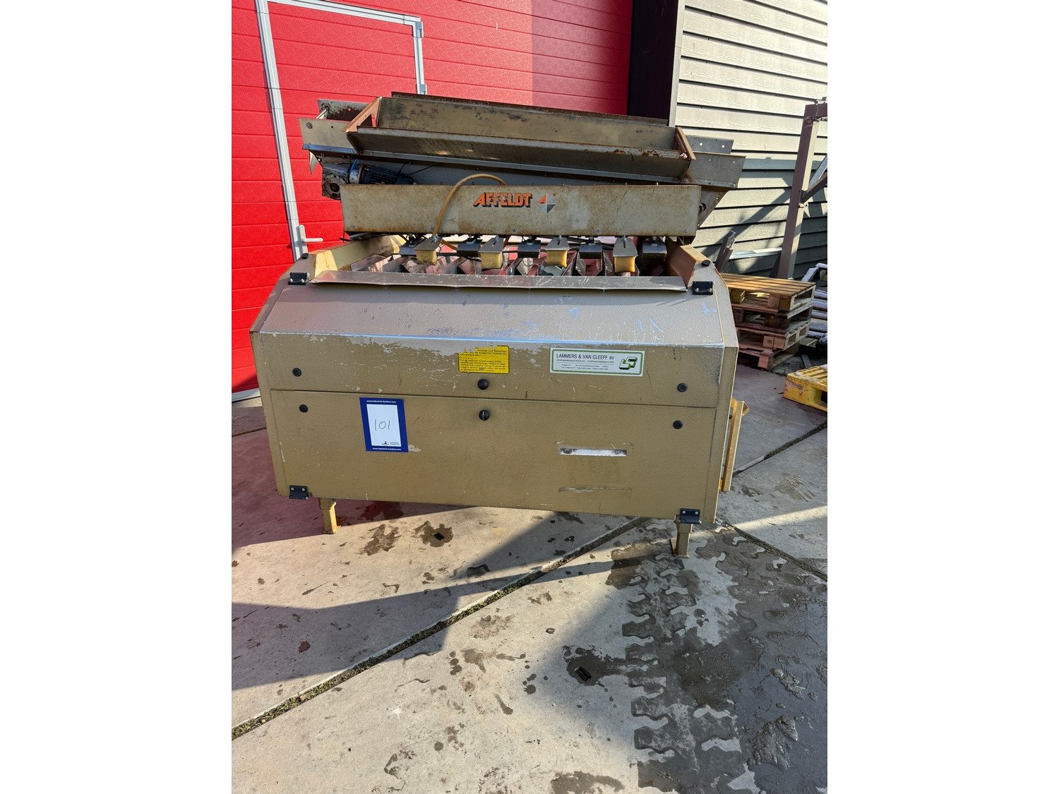 Affeldt 10-lanes lineair weigher, lane width: 120 mm, total dimensions: 1800 mm x 1500 mm x 1400 mm. Kavel locatie: Bedrijfsweg 7, 8304 AA Emmeloord, Nederland