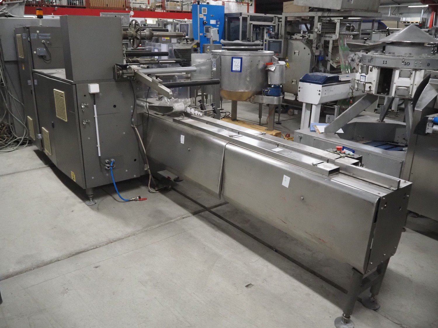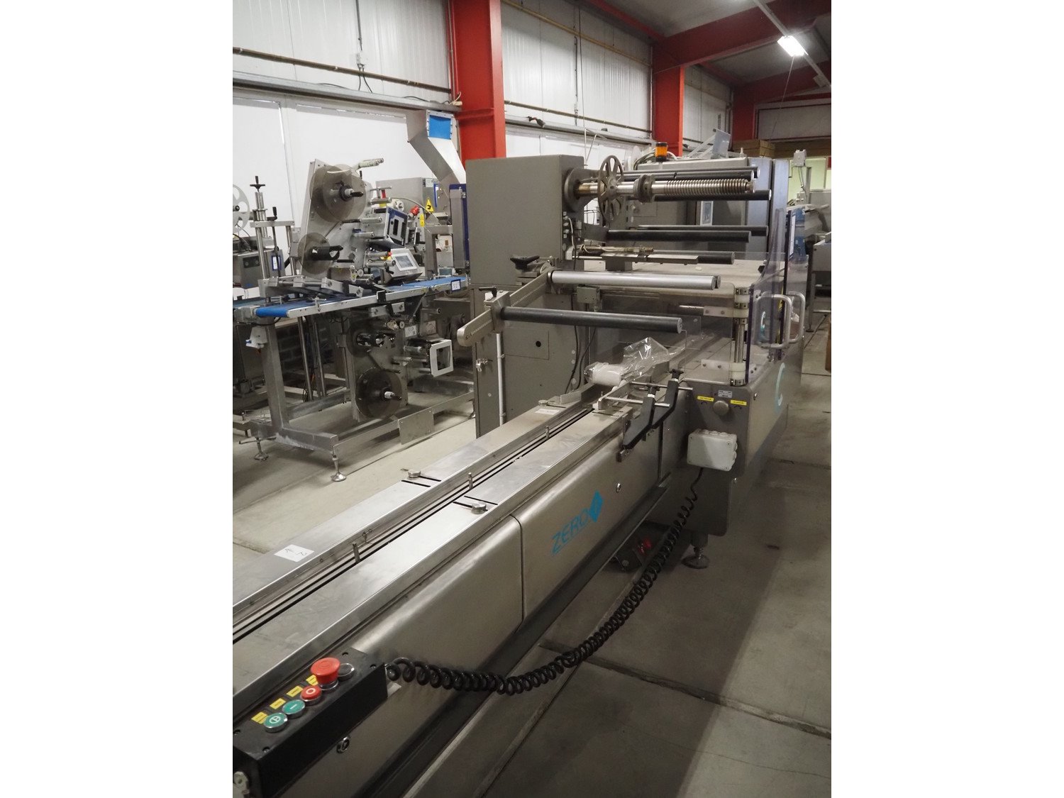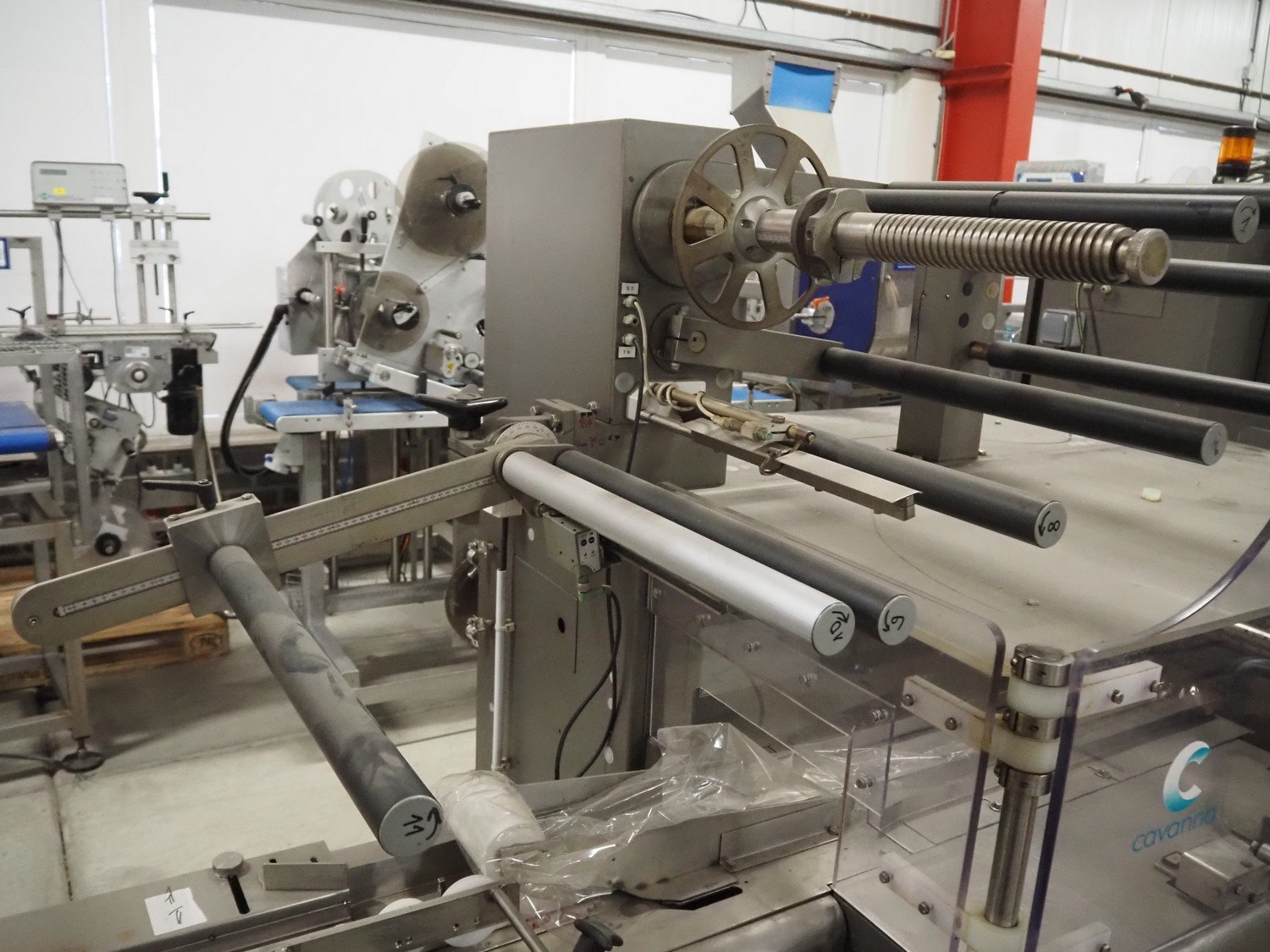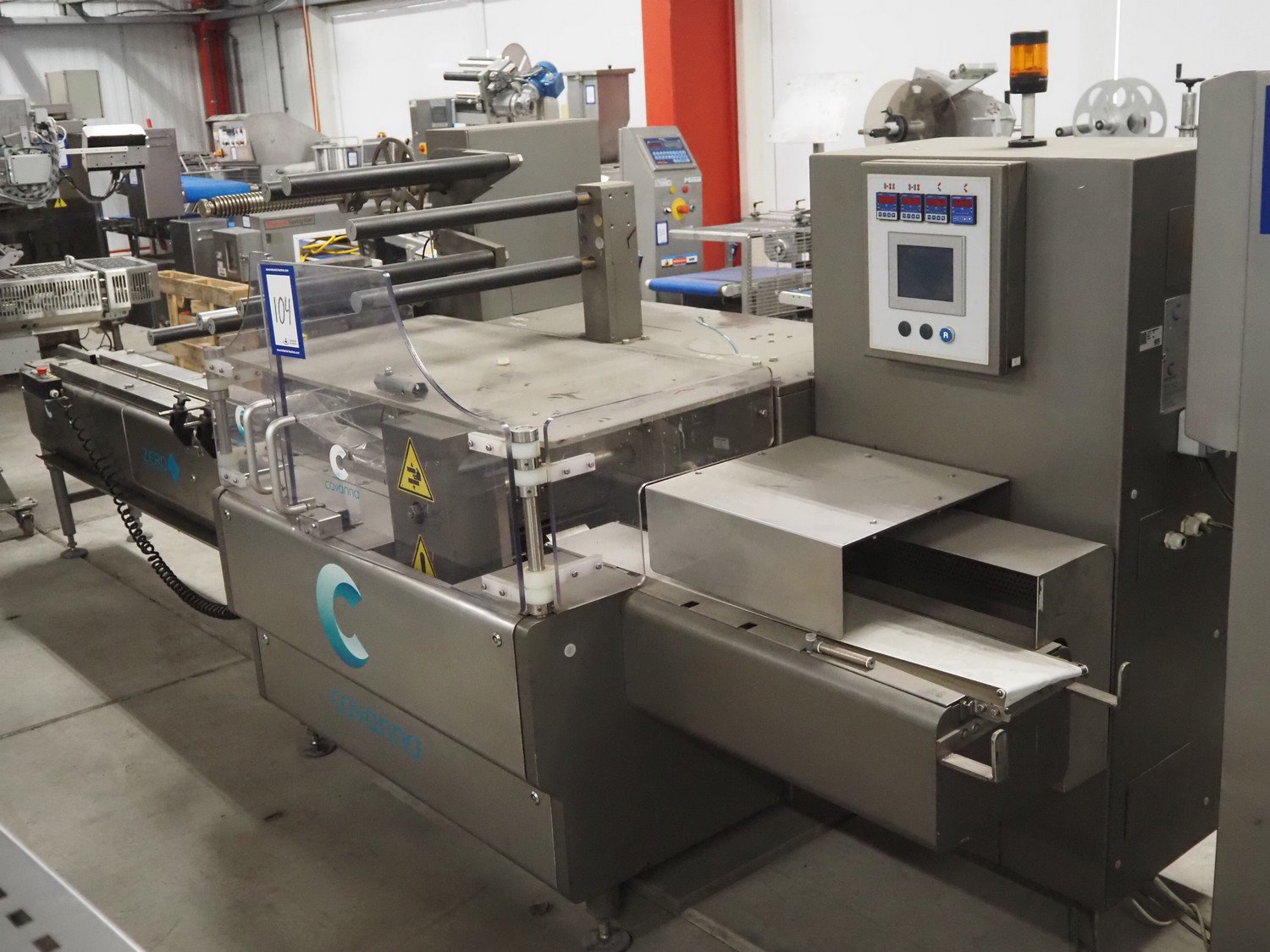Cavanna flowpacker, model: ZERO 1/E, serial number: 4308, year of construction: 2005, 400 V, 3 Ph, 50 Hz, width infeed lane: 80 mm, distance between dividers: 300 mm, seal width: 250 mm, plastic outfeed belt, belt width: 180 mm, total dimensions: 4600 mm x 1200 mm x 1540 mm. Kavel locatie: Bedrijfsweg 7, 8304 AA Emmeloord, Nederland