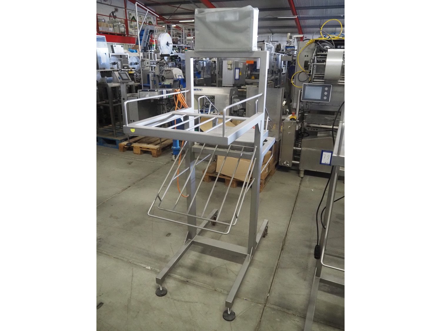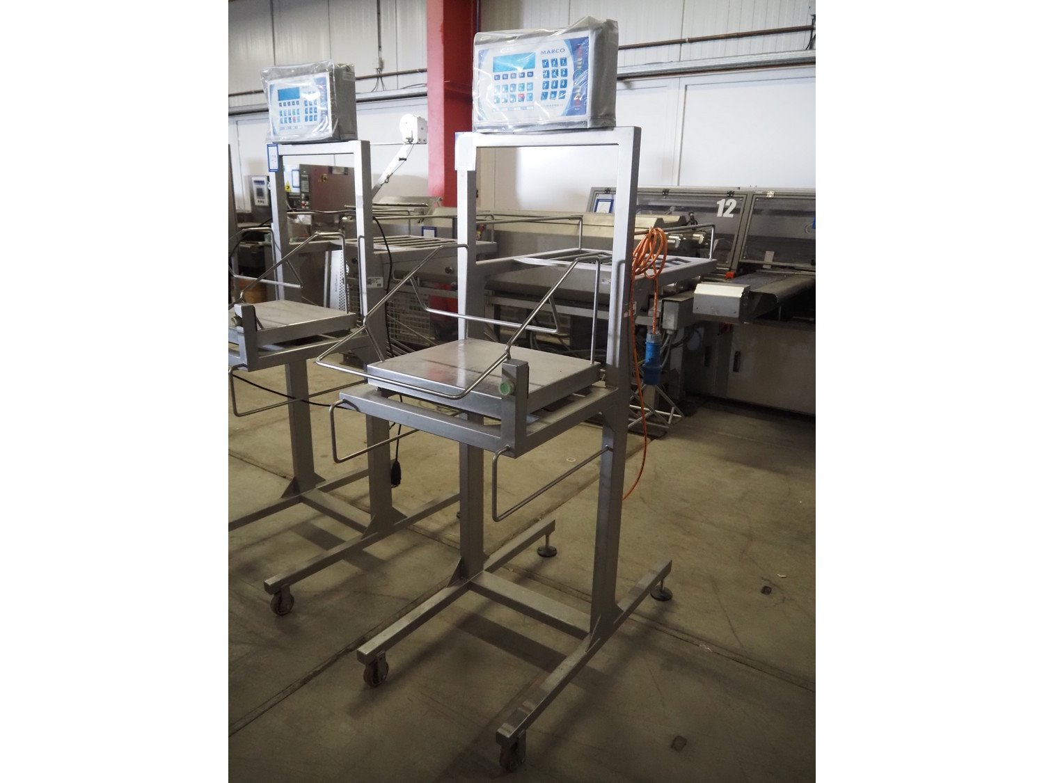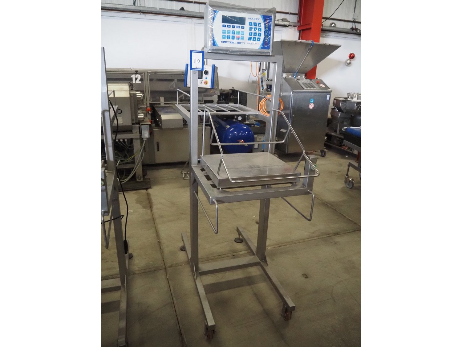 Marco weighing scale for crates on s/s mobile frame, model: LMIII, serial number: 49584, 90-250 V, 50-60 Hz, 0.8 A, maximum: 20000 gram, minimum: 20 gram, e= 1 gram, dimensions scale: 440 mm x 400 mm, total dimensions: 1280 mm x 550 mm x 1780 mm. Kavel locatie: Bedrijfsweg 7, 8304 AA Emmeloord, Nederland