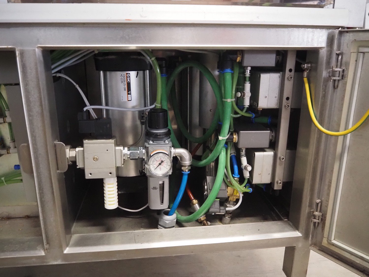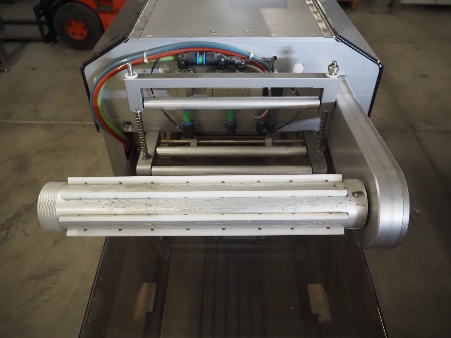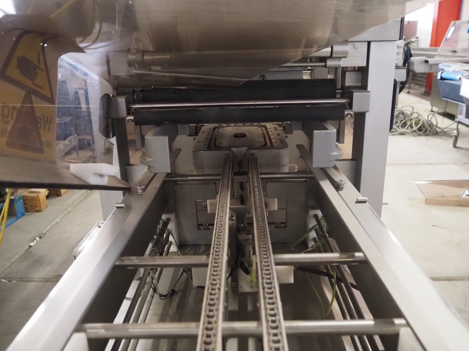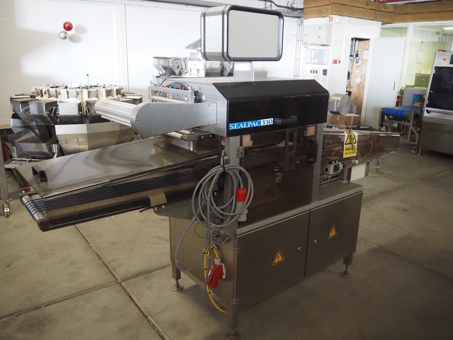 Sealpac GmbH traysealer, model: SEALPAC 350, serial number: TVO 02 955 01, year of construction: 2004, 230/400 V, 3 Ph, weight: 450 kg, chain infeed belt, belt width: 70 mm, dye: 290 mm x 160 mm, string outfeed belt, belt width: 145 mm, film width: 220 mm, total dimensions: 2560 mm x 670 mm x 1770 mm. Without vacuum pump. Plastic cover damaged. Kavel locatie: Bedrijfsweg 7, 8304 AA Emmeloord, Nederland