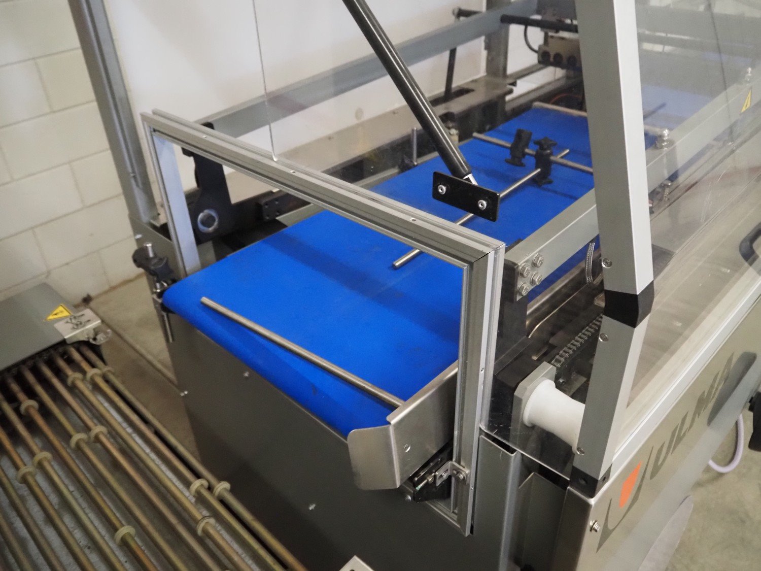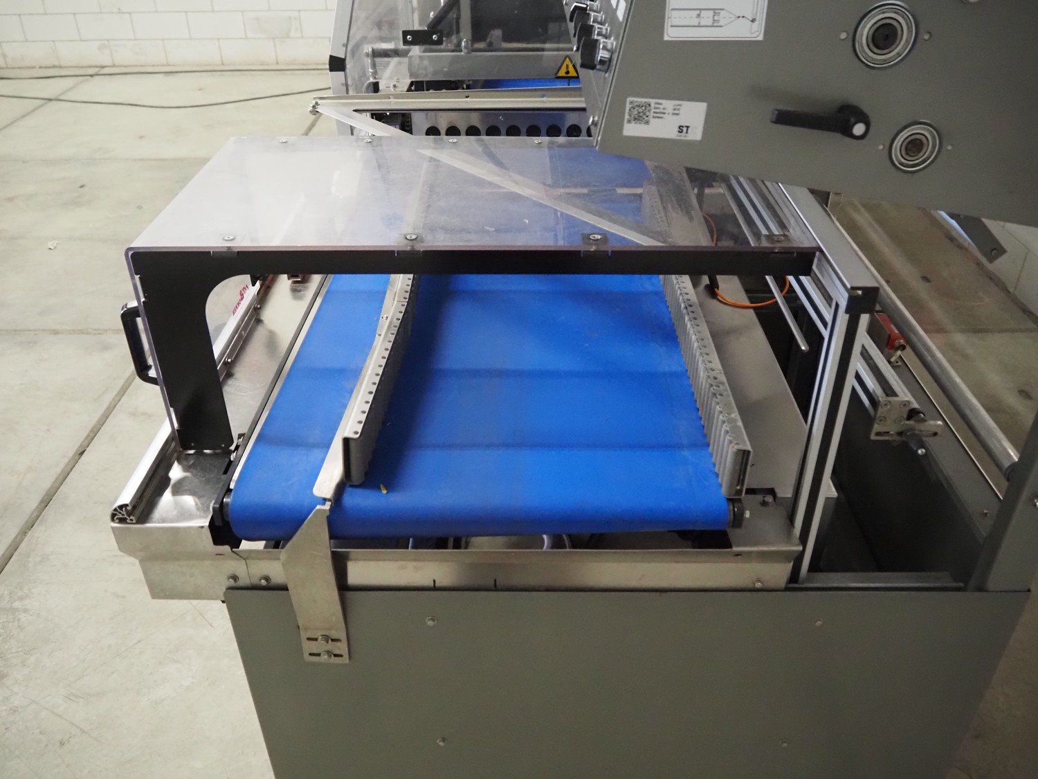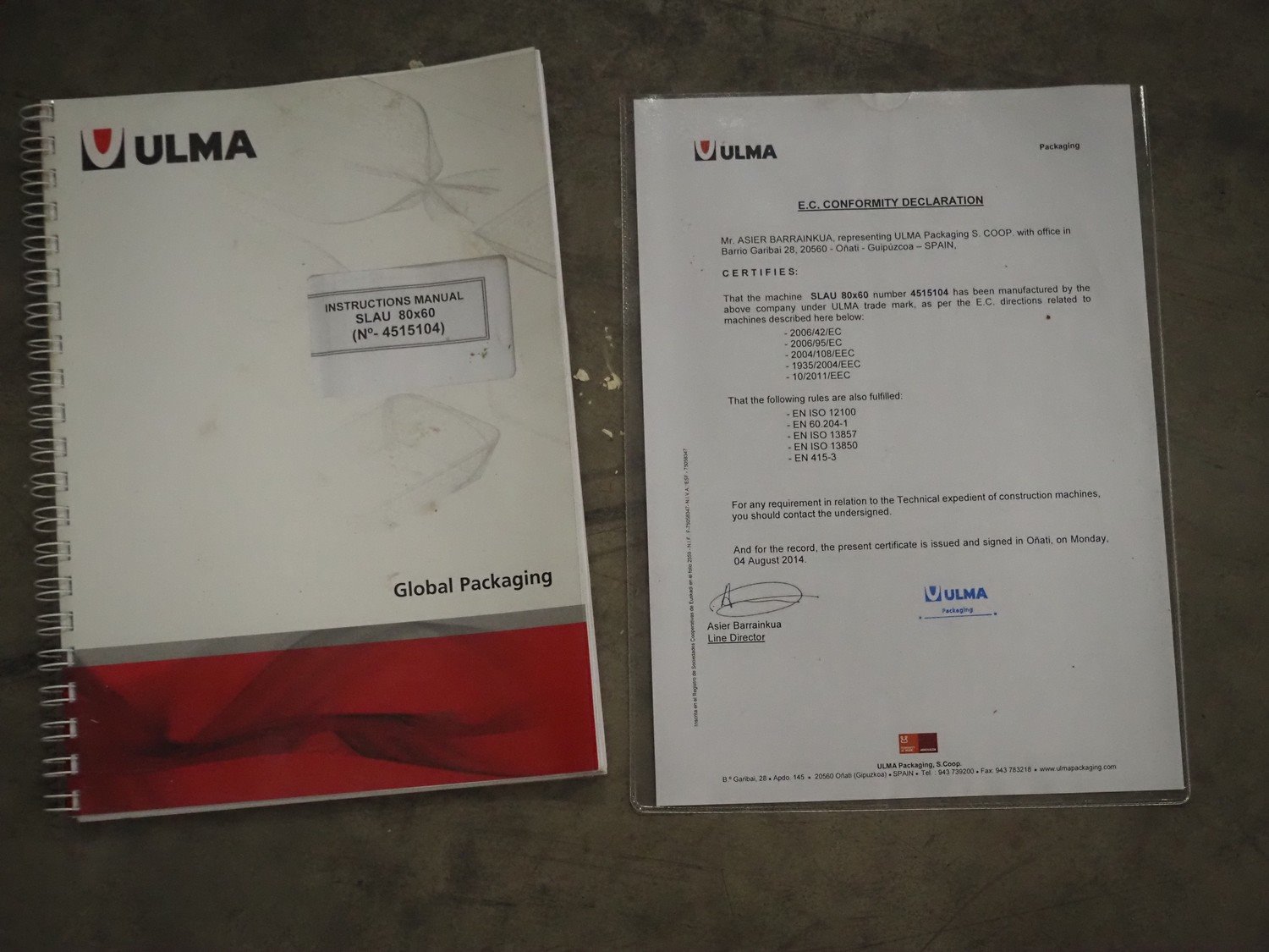 Ulma mobile flowpacker, model: SLAU 80x60, machine number: 4515104, year of construction: 2014, 400 V, 50 Hz, 8.5 A, 4.5 kW, plastic belt, belt width: 570 mm, seal length: 600 mm x 865 mm, total dimensions: 2350 mm x 1100 mm x 1700 mm. Kavel locatie: Bedrijfsweg 7, 8304 AA Emmeloord, Nederland