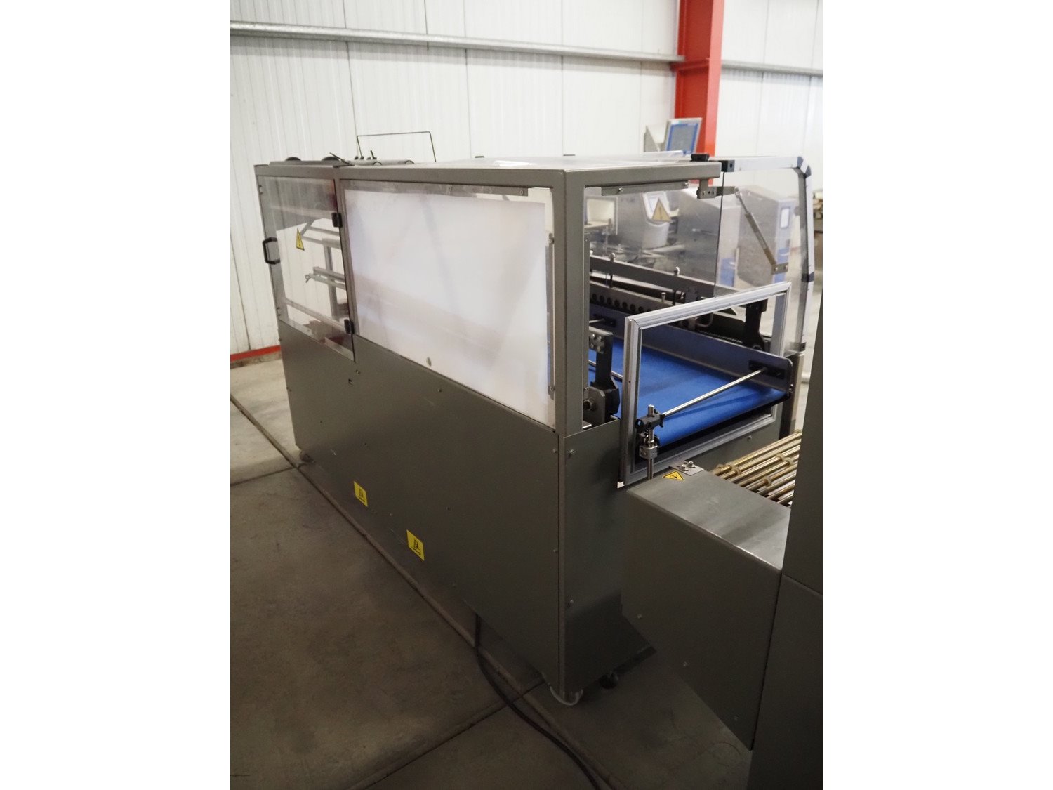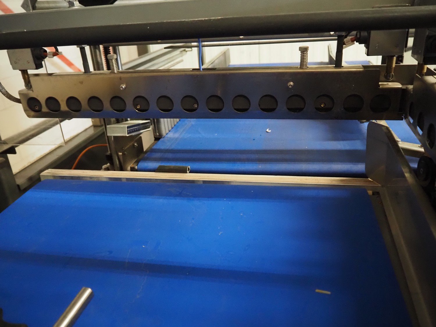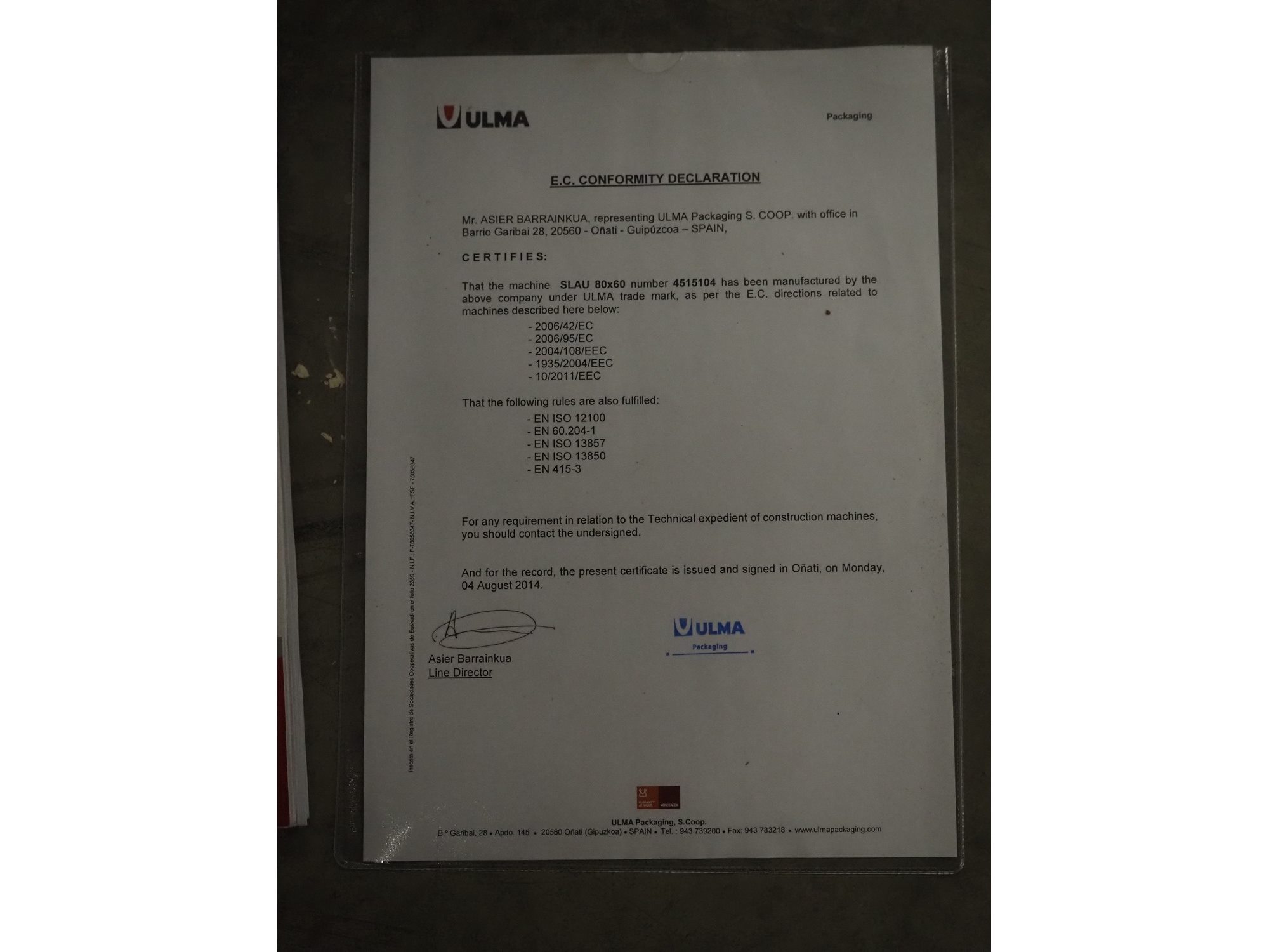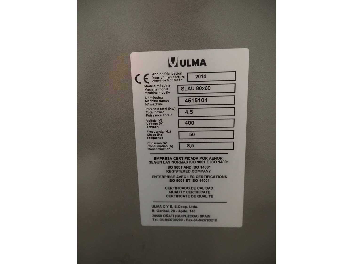 Ulma mobile flowpacker, model: SLAU 80x60, machine number: 4515104, year of construction: 2014, 400 V, 50 Hz, 8.5 A, 4.5 kW, plastic belt, belt width: 570 mm, seal length: 600 mm x 865 mm, total dimensions: 2350 mm x 1100 mm x 1700 mm. Kavel locatie: Bedrijfsweg 7, 8304 AA Emmeloord, Nederland
